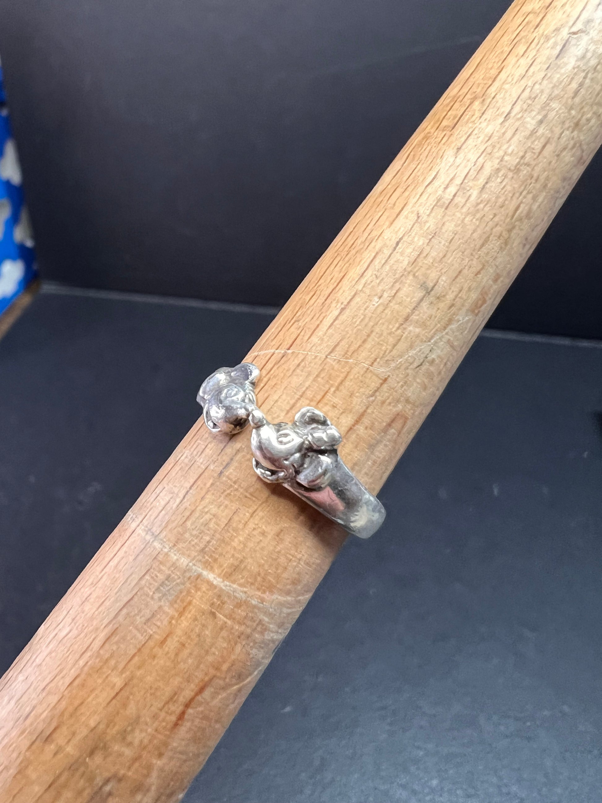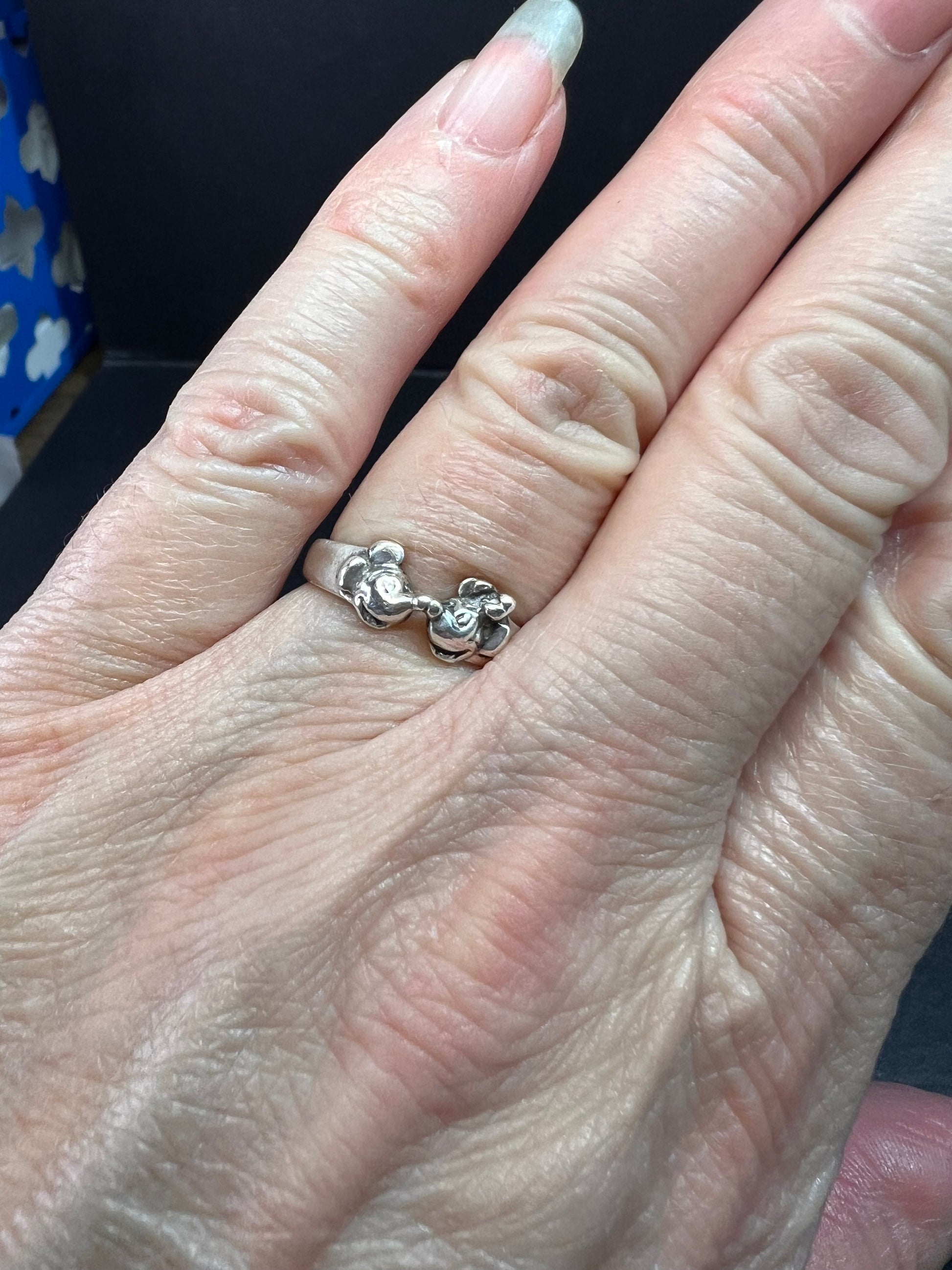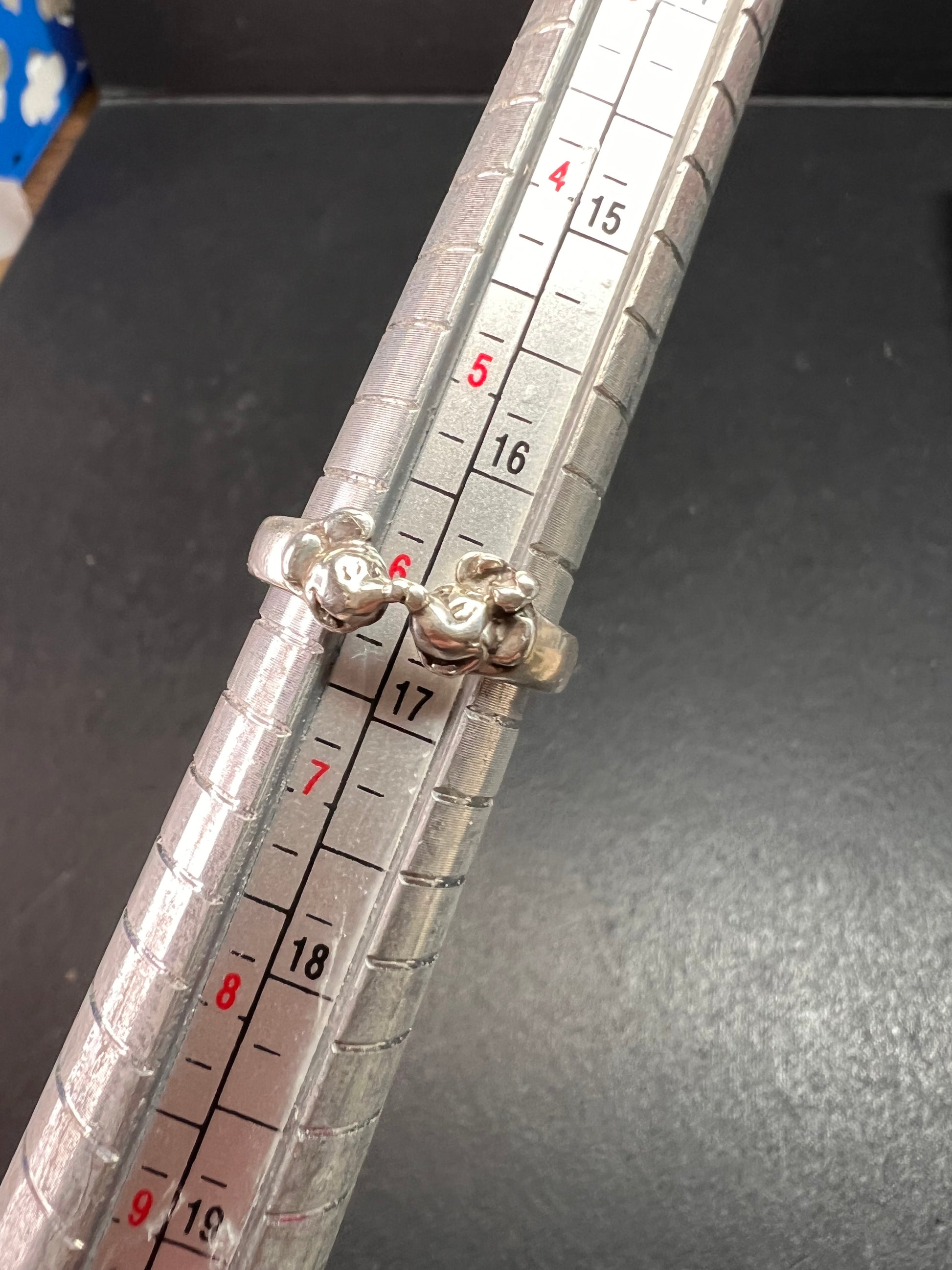 Authentic 925 sterling silver Mickey Mouse heads joined at the nose. Signed Disney 925 on the inside of the band. Size 6 and weighs 2.78 grams.