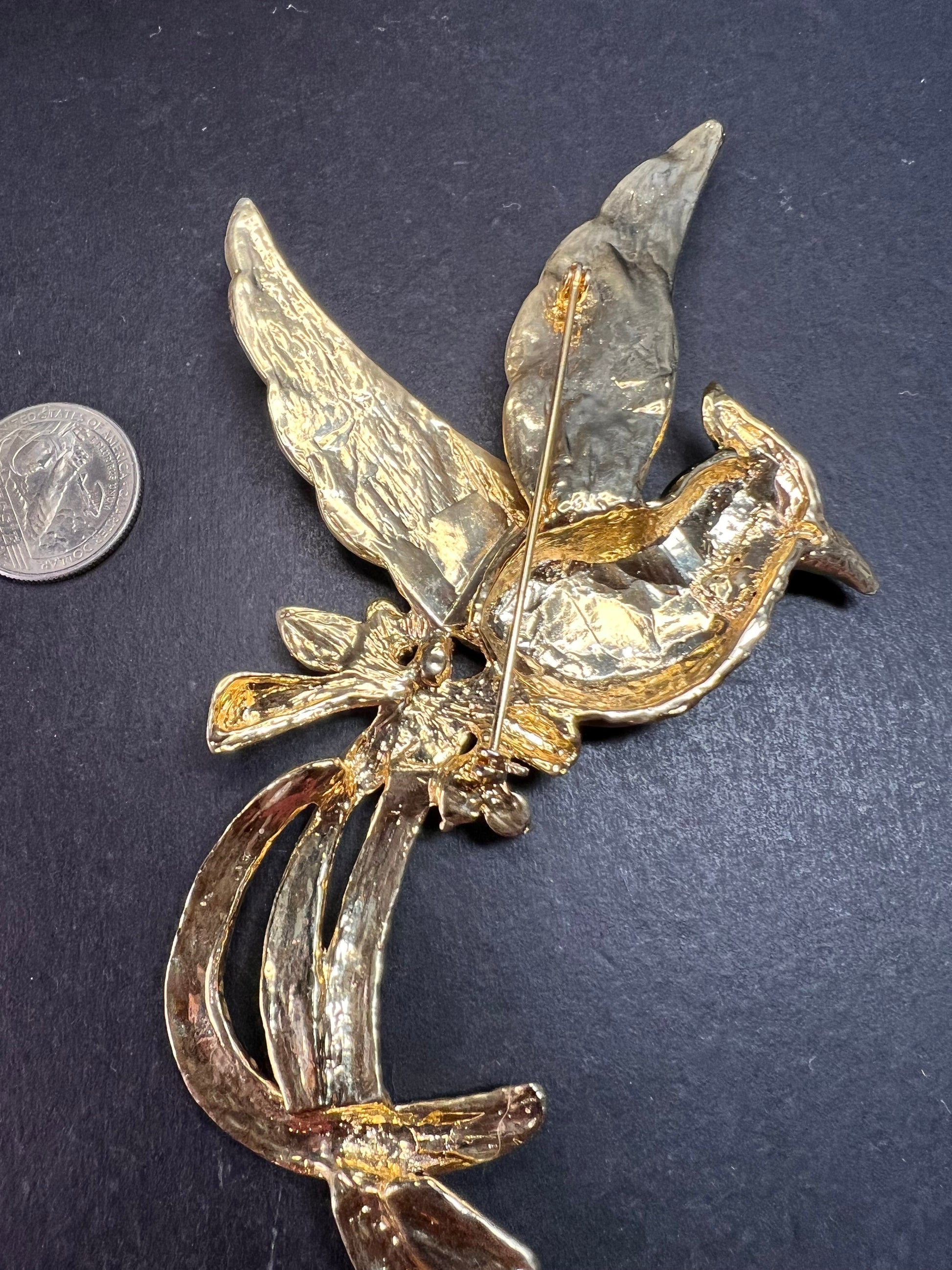 Vintage Enamel Phoenix Bird Rhinestone Statement Brooch Large Gold Tone