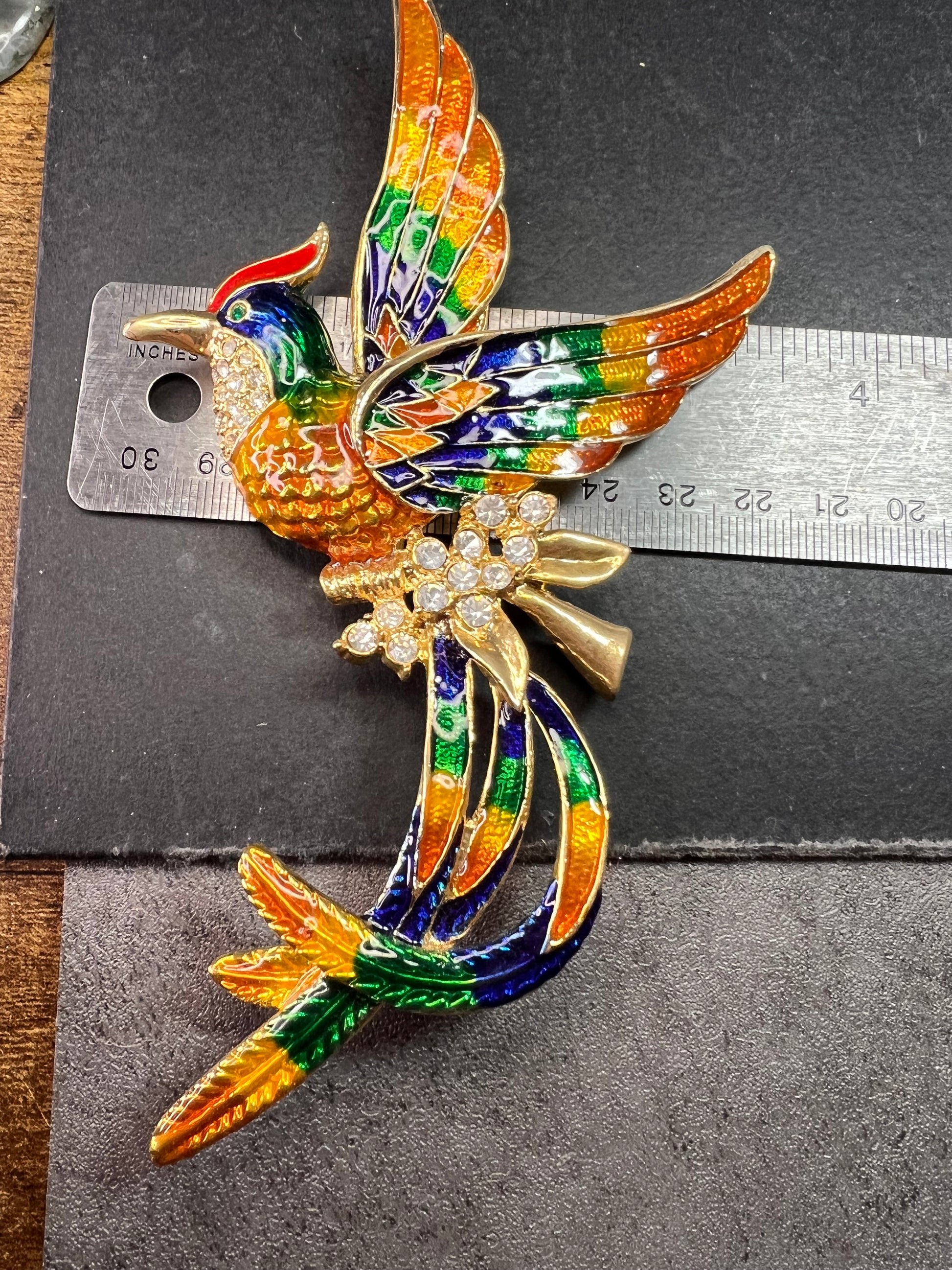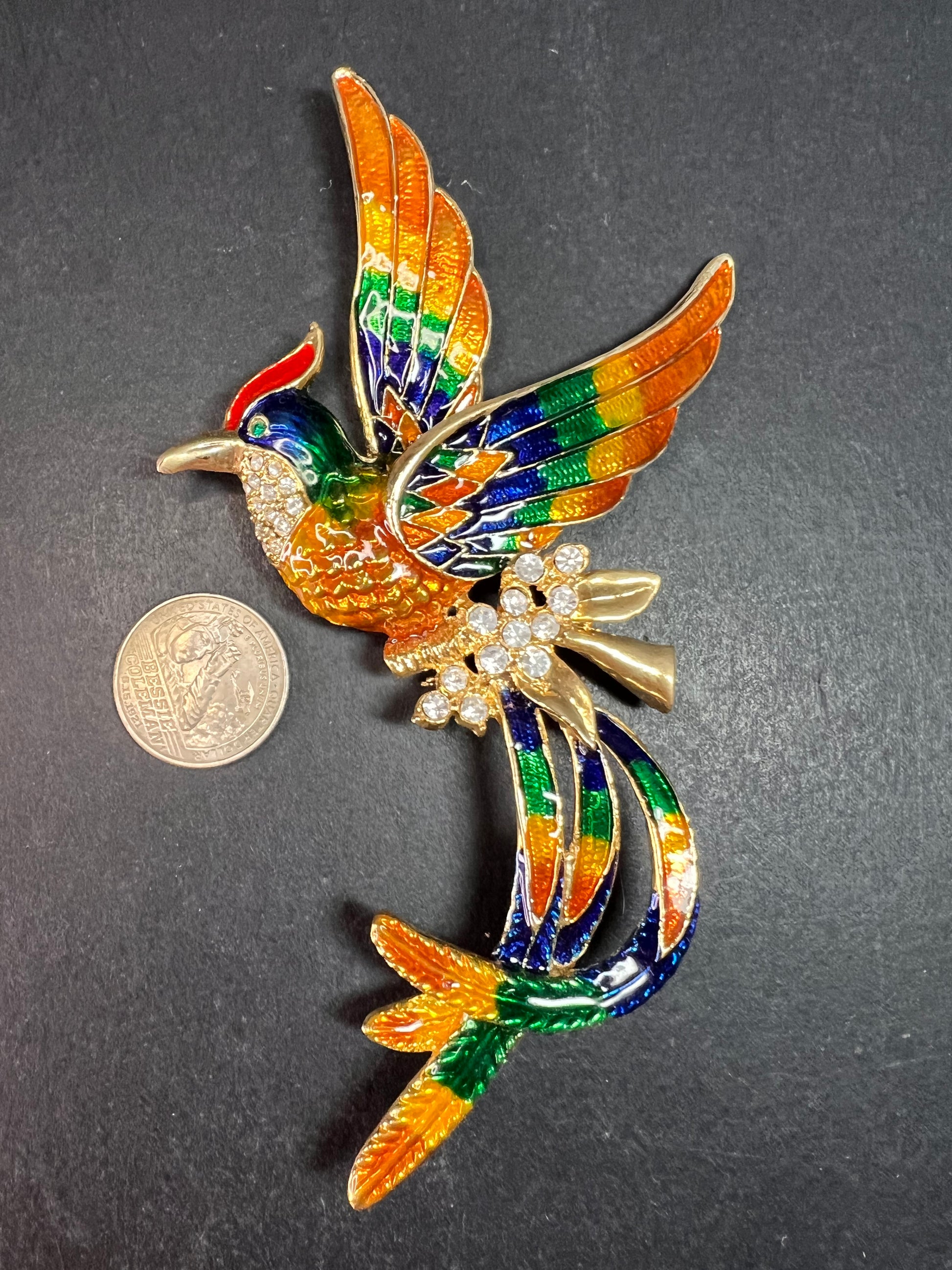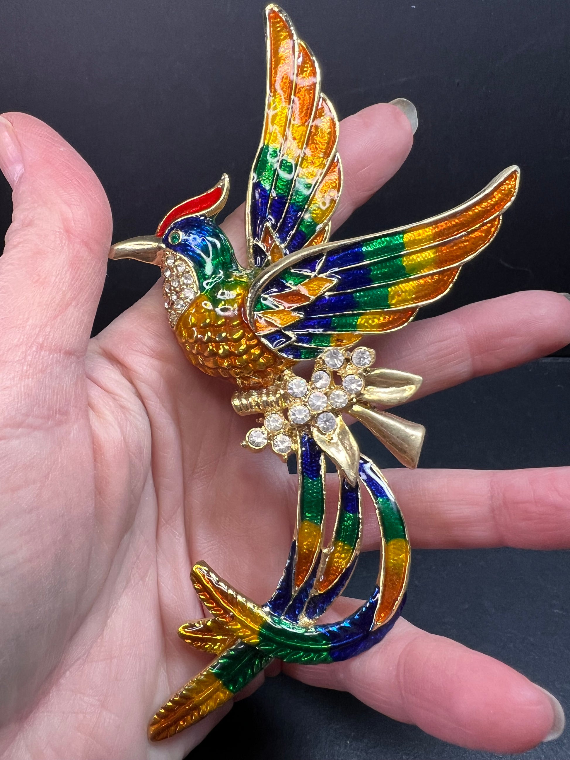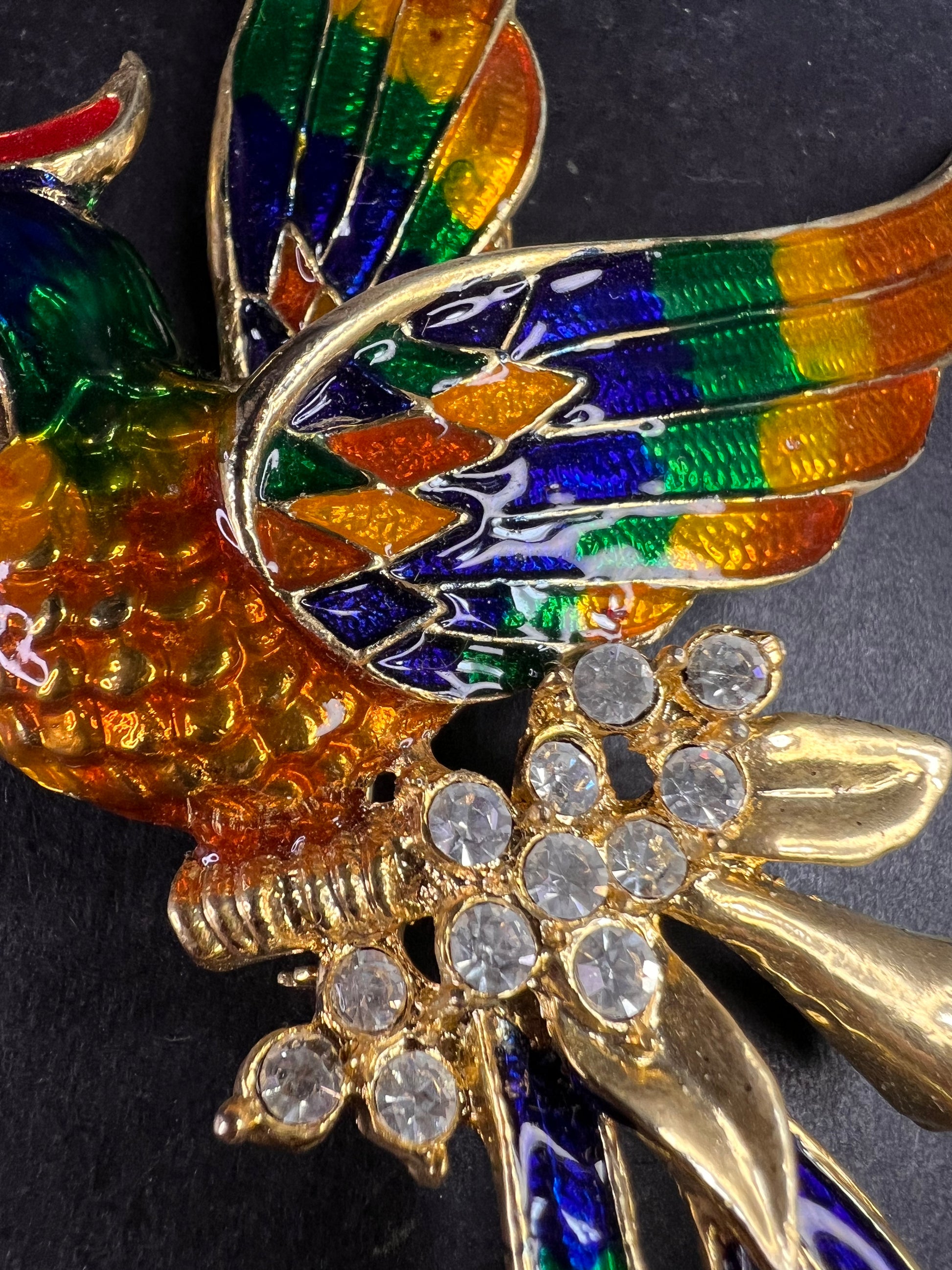 Bold vintage statement brooch featuring a soaring phoenix-style bird in vivid multicolor enamel with brilliant clear rhinestone accents. Gold-tone base metal with glossy hand-applied enamel in orange, blue, green, yellow, and red, accented with a clustered rhinestone body detail. Dramatic flowing tail and raised wing design. Safety clasp closure on back.