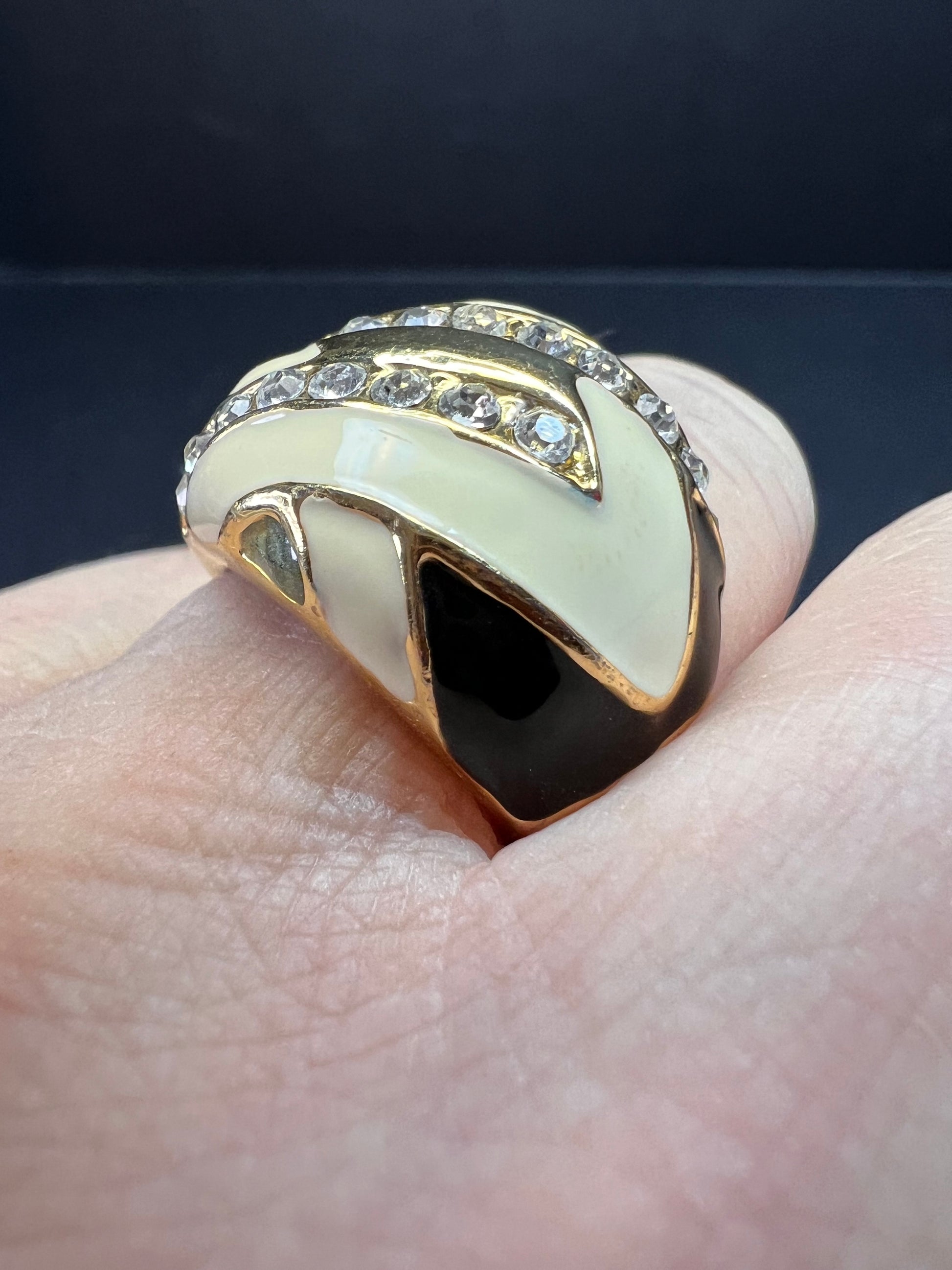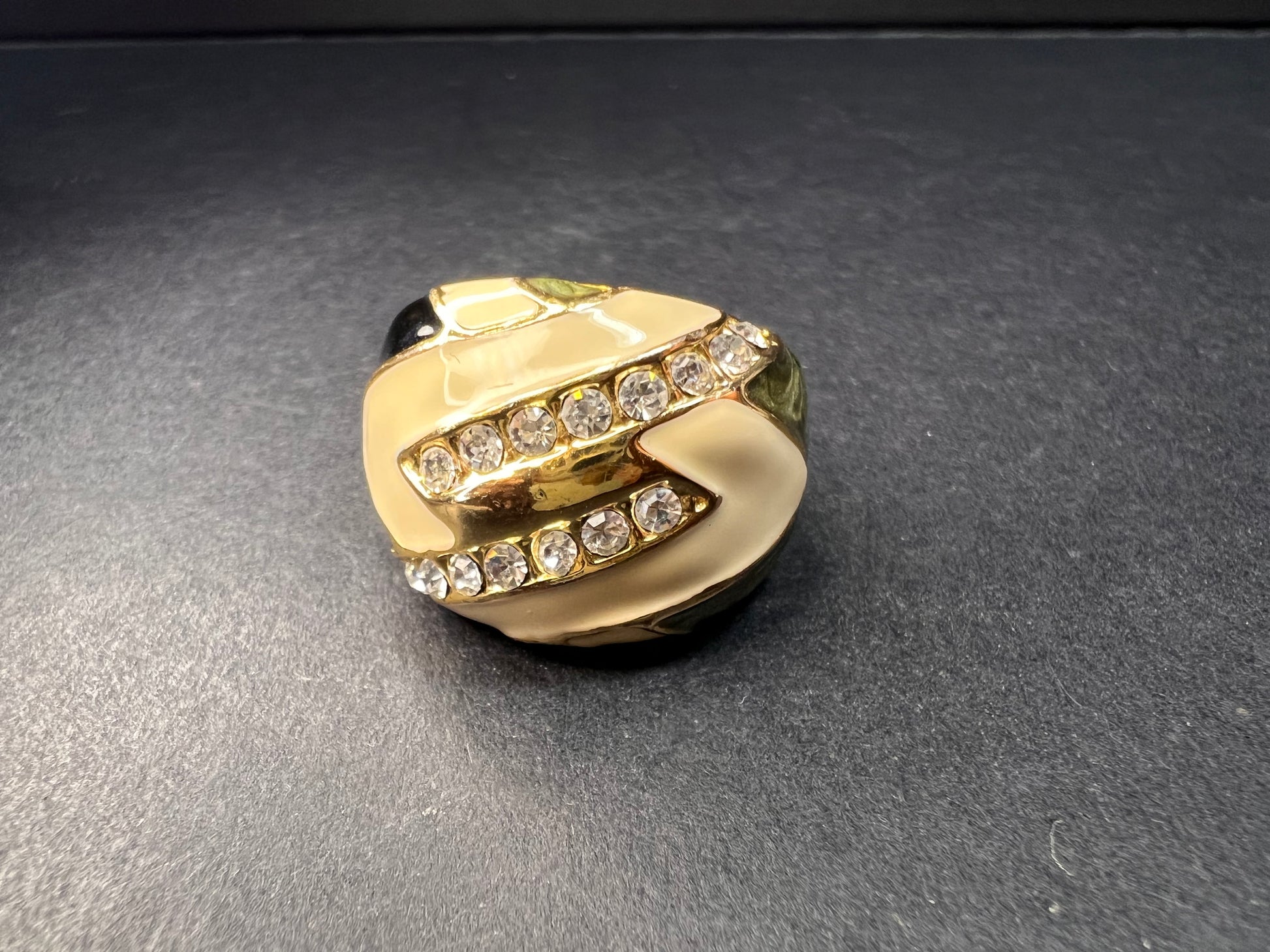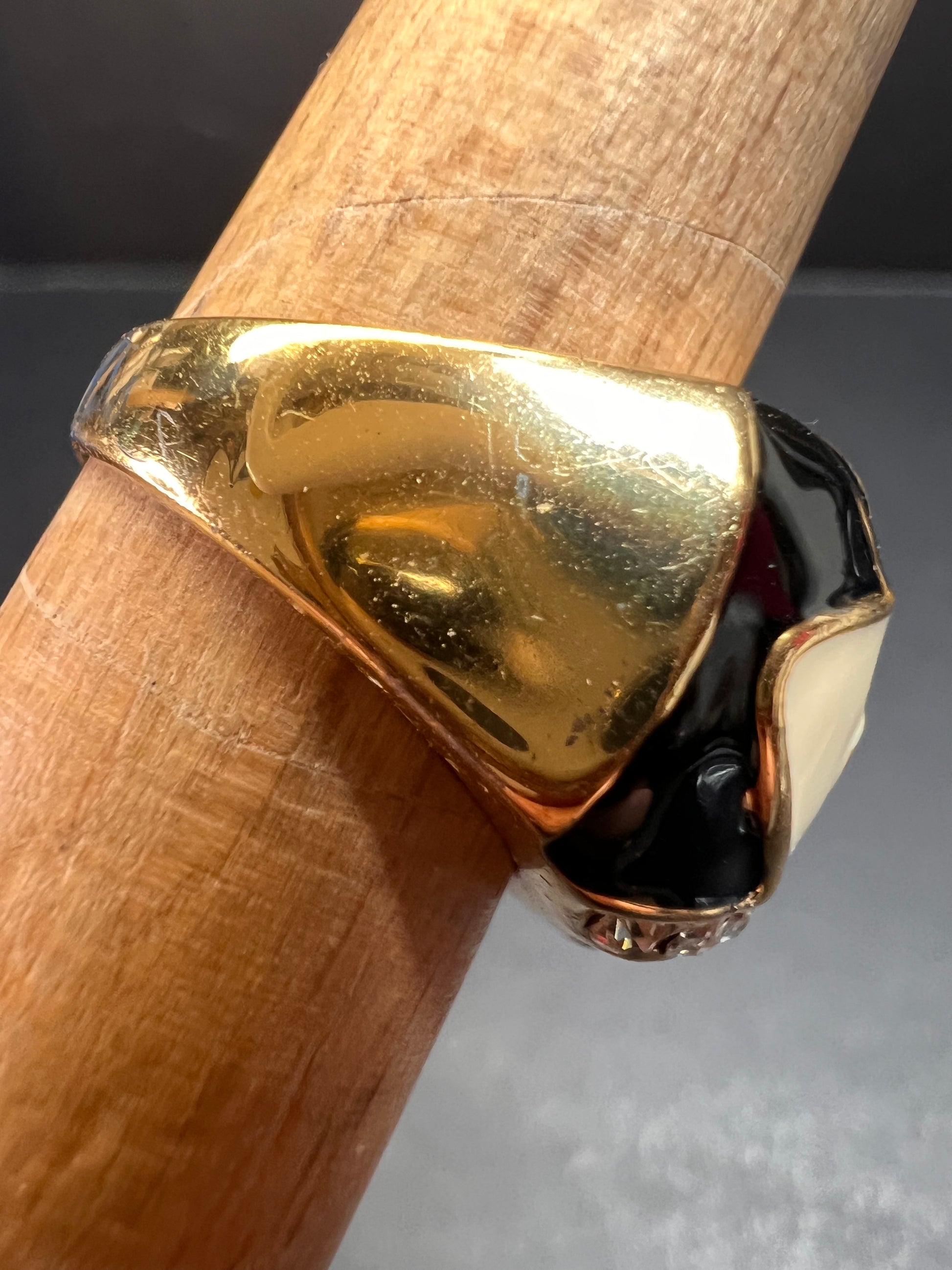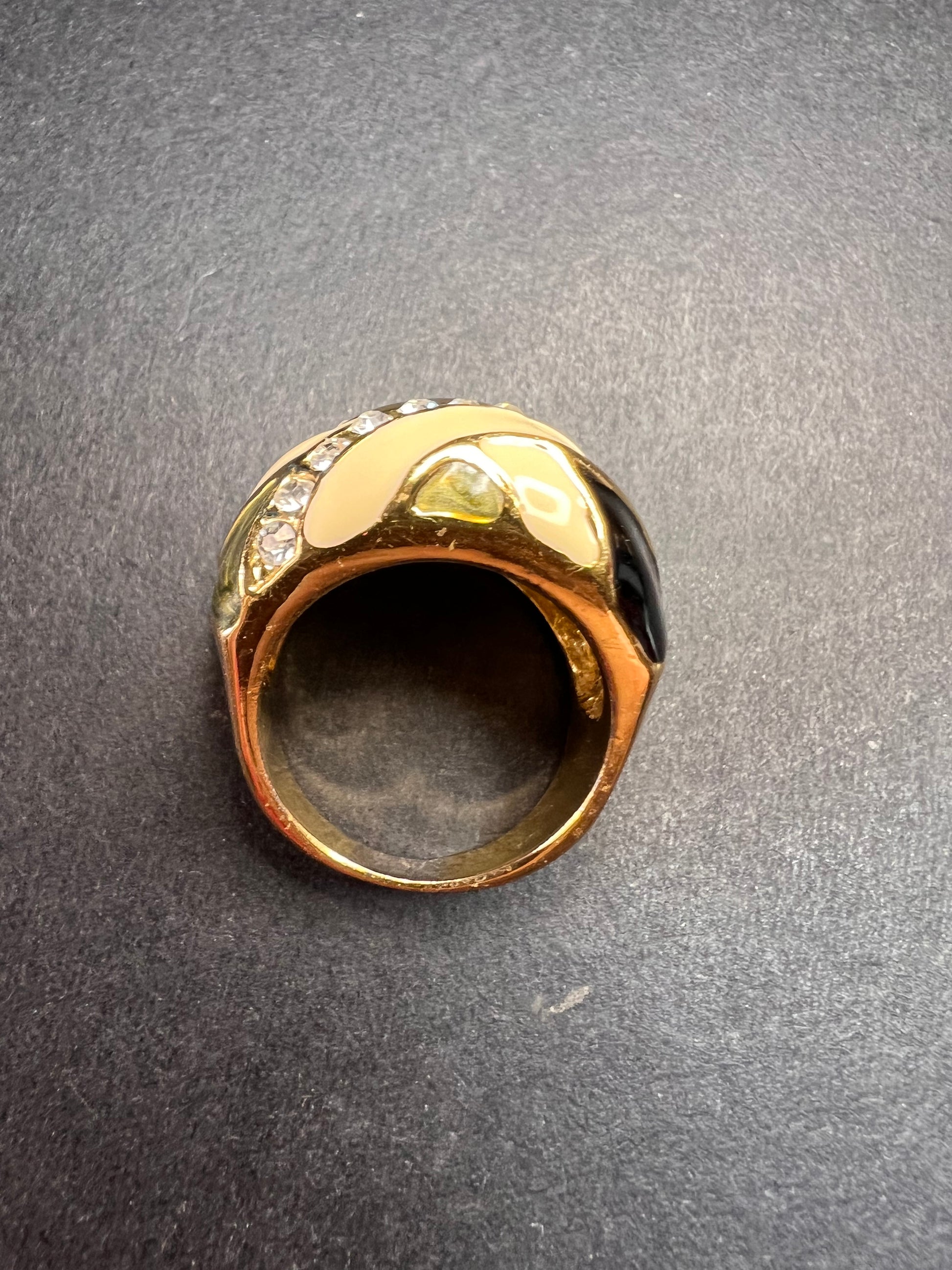 Enamel , and cz or rhinestones in a gold plating over what’s probably brass. Not magnetic at all. No markings. Fits a 6.5 to 7. Please see photo on ring sizer. Guessing 80s era.