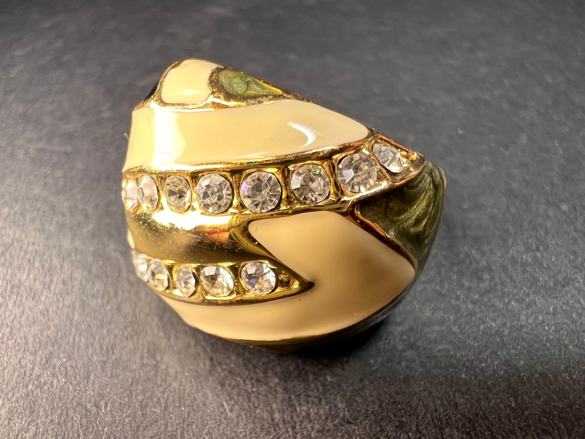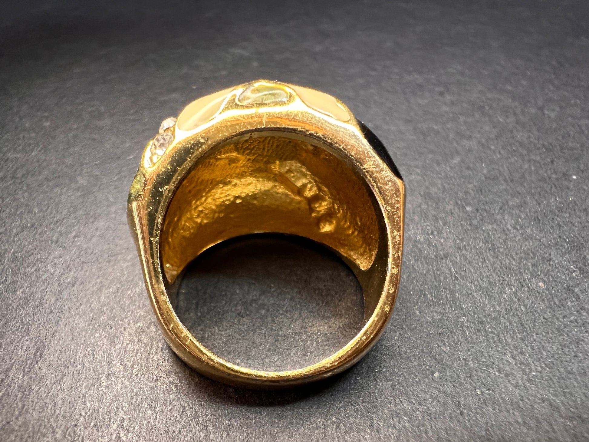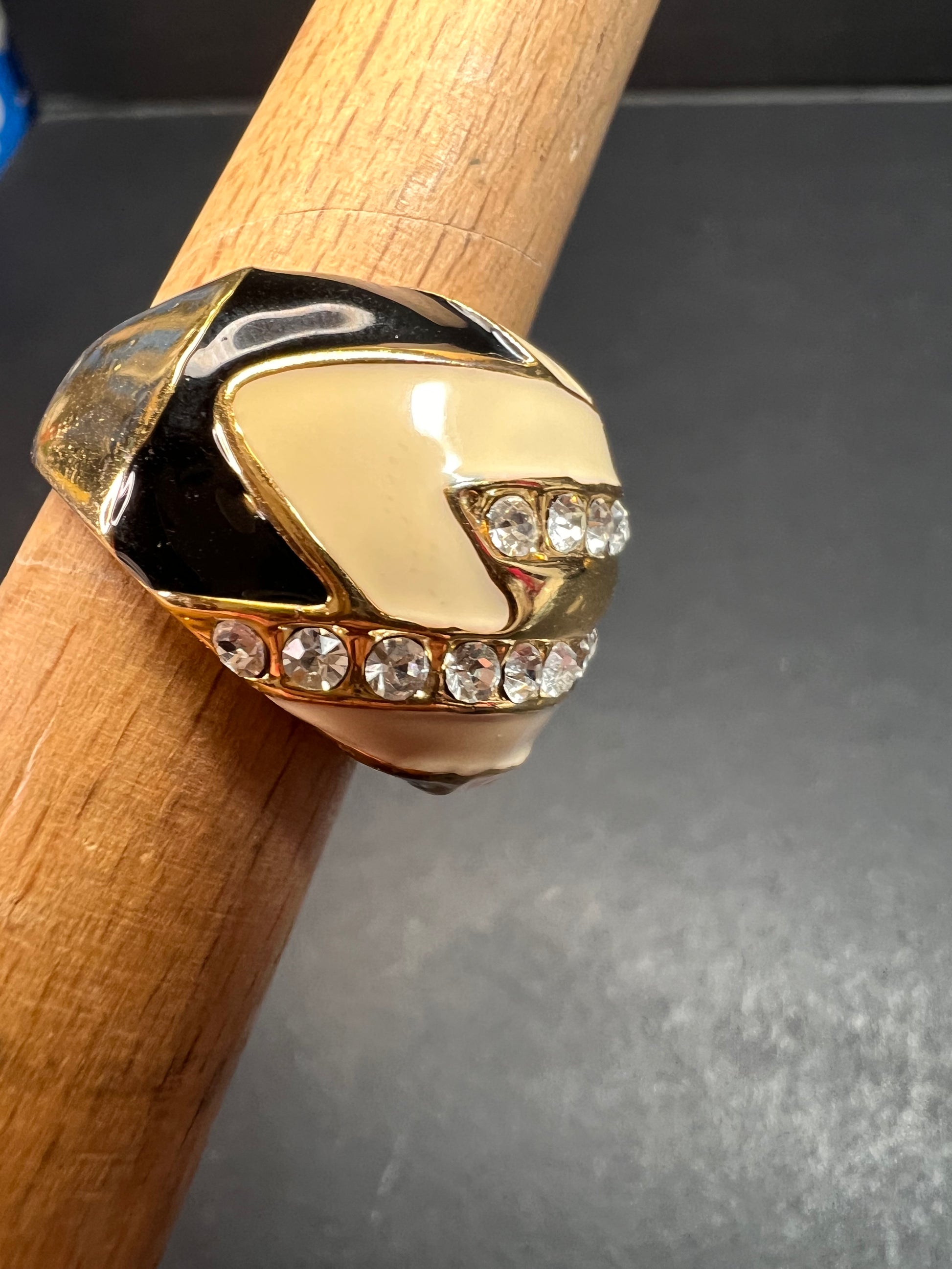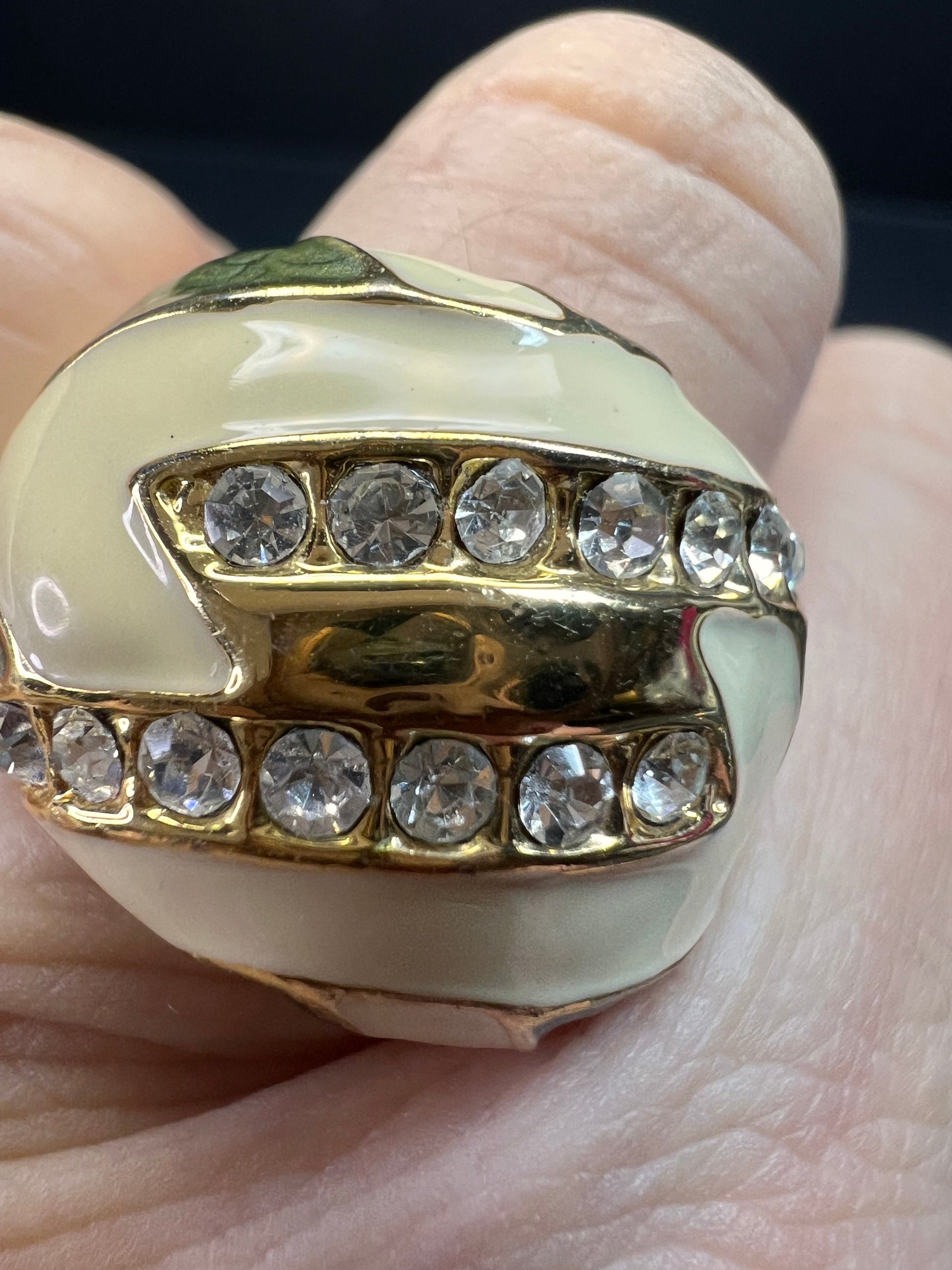 Enamel , and cz or rhinestones in a gold plating over what’s probably brass. Not magnetic at all. No markings. Fits a 6.5 to 7. Please see photo on ring sizer. Guessing 80s era.