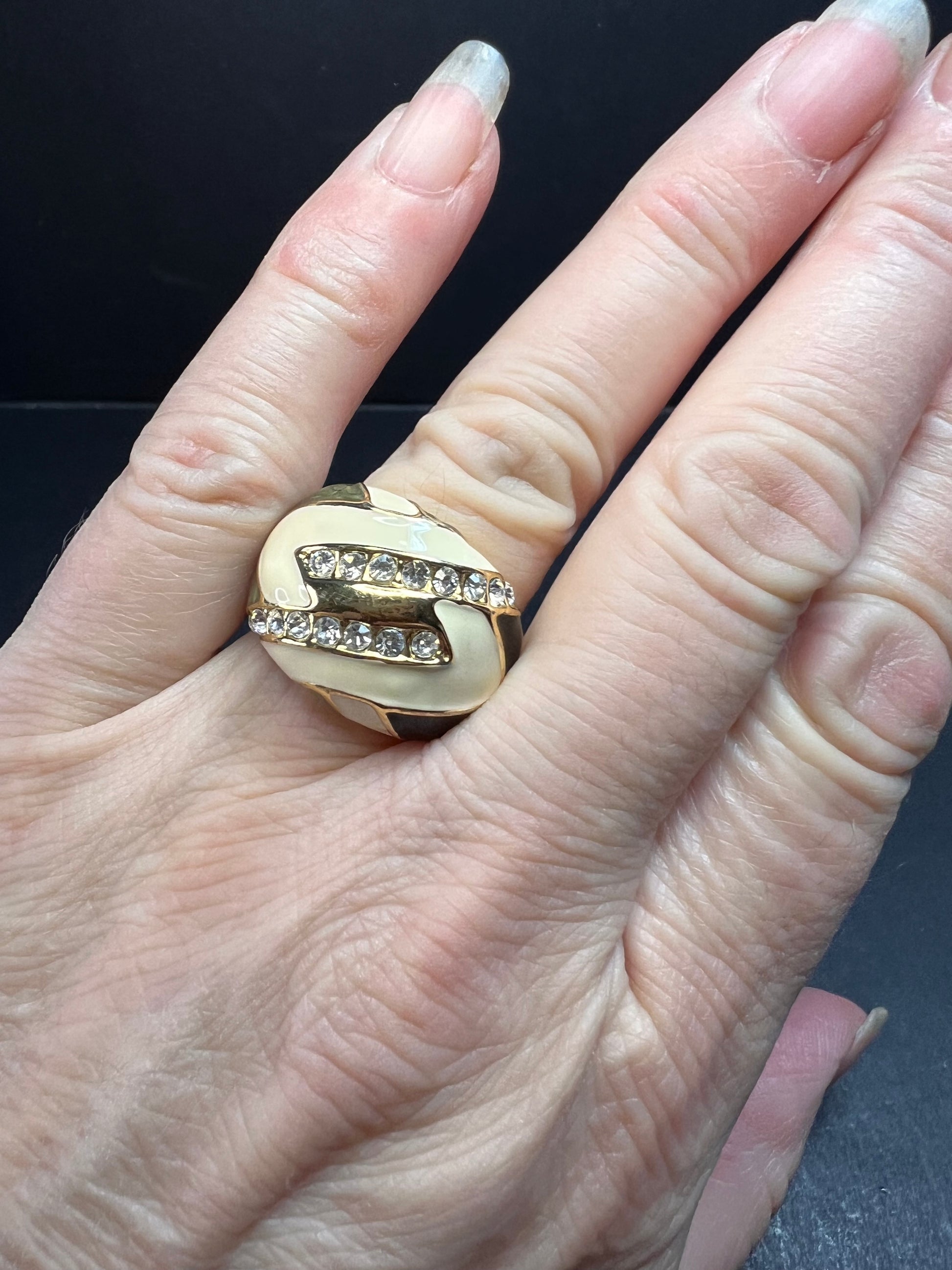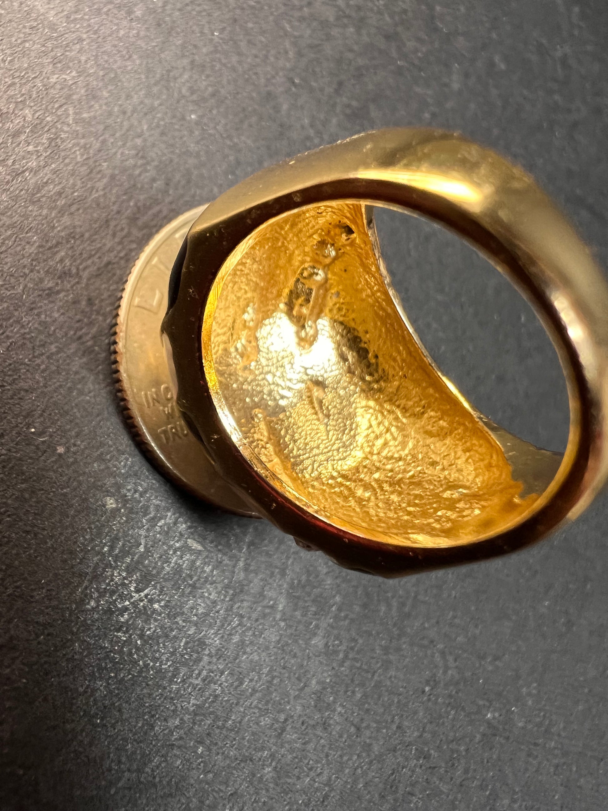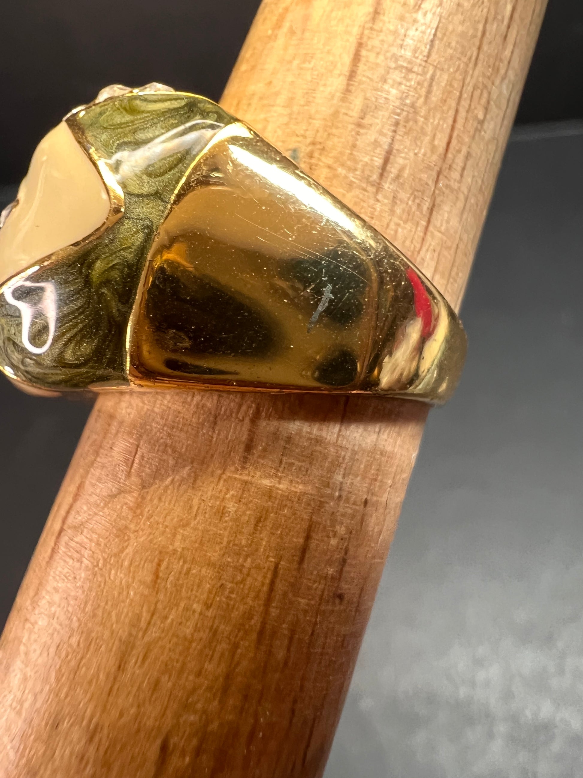 This is a vintage pre owned ring in good condition definitely showing a few little signs of moderate use, including some tiny scratches in the gold plating as shown in photos. Priced accordingly.