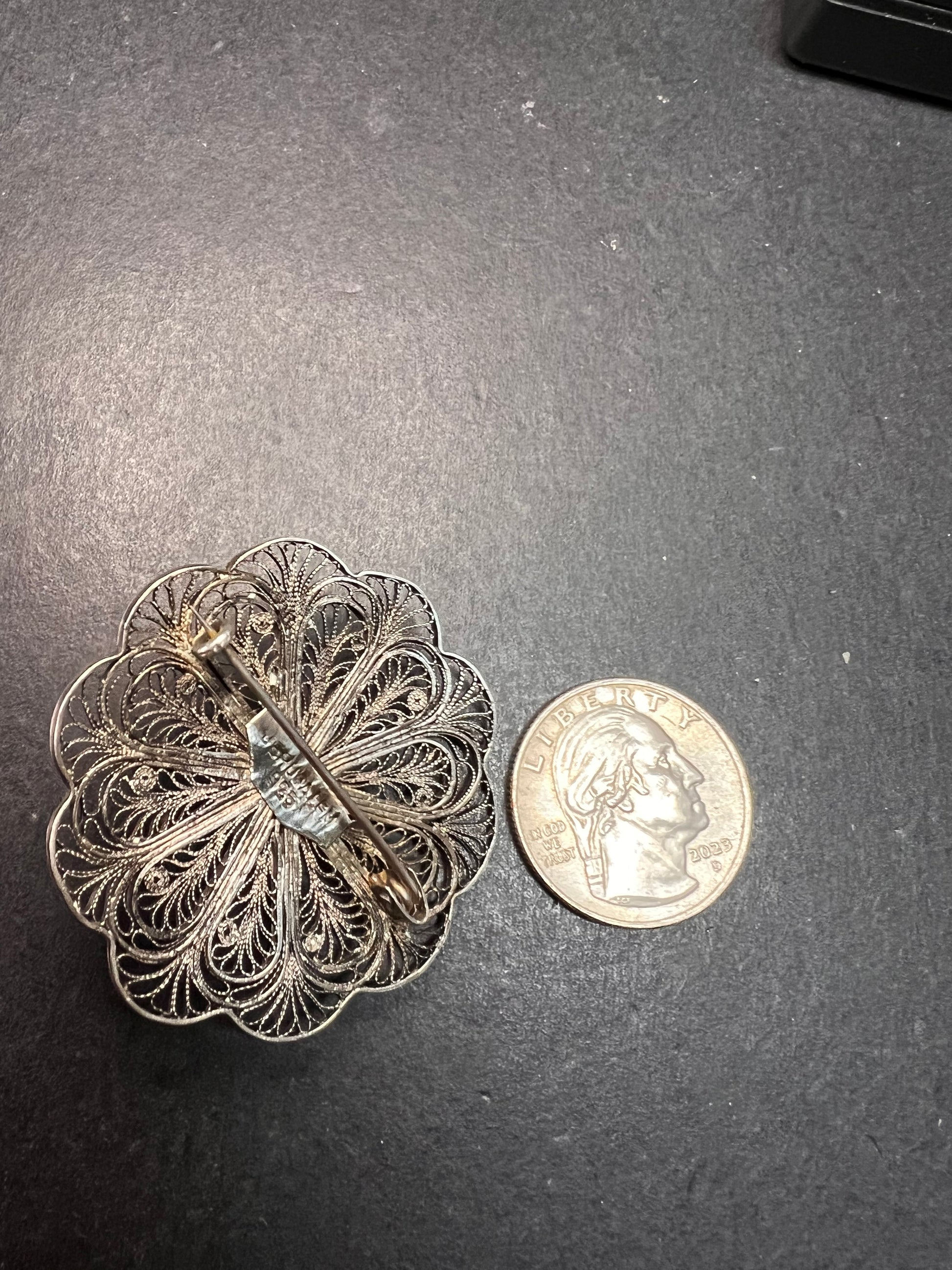 Genuine round cut amethyst stone cabochon set in authentic 925 sterling silver in a filigree floral pattern. Stamped 925 Jerusalem on the back. Total weight is 10.29 grams. Measures about 42.5 mm in diameter.
