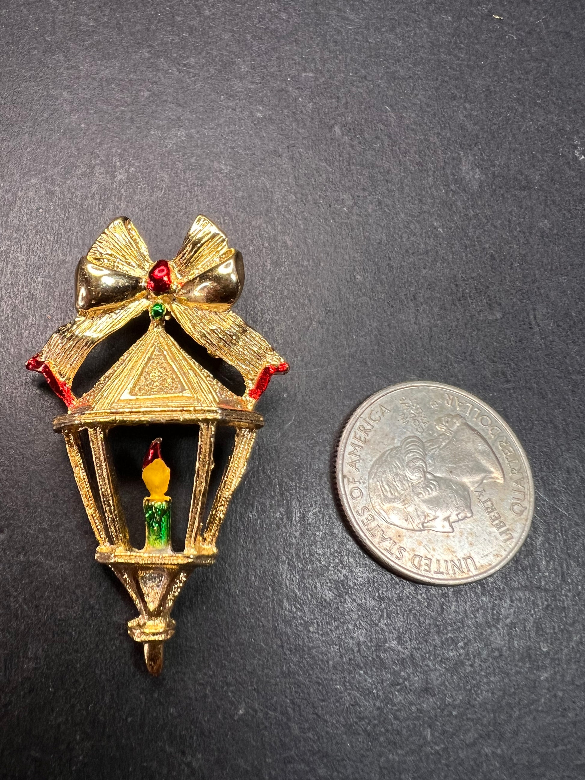Lovely vintage mid-century costume jewelry brooch by Gerry’s, featuring a gold-tone Victorian-style Christmas lantern topped with a festive bow. The bow is accented with red and green rhinestones, and the lantern holds a molded candle with painted yellow flame and green base. Signed “Gerry’s” on the back with a secure rollover safety clasp. Measures approximately 2 inches tall (see photos with ruler and quarter for scale). Gold tone finish with textured detailing and original enamel/painted accents intact. A charming collectible holiday pin perfect for sweaters, coats, scarves, or Christmas displays. Excellent vintage condition with light age-appropriate wear.