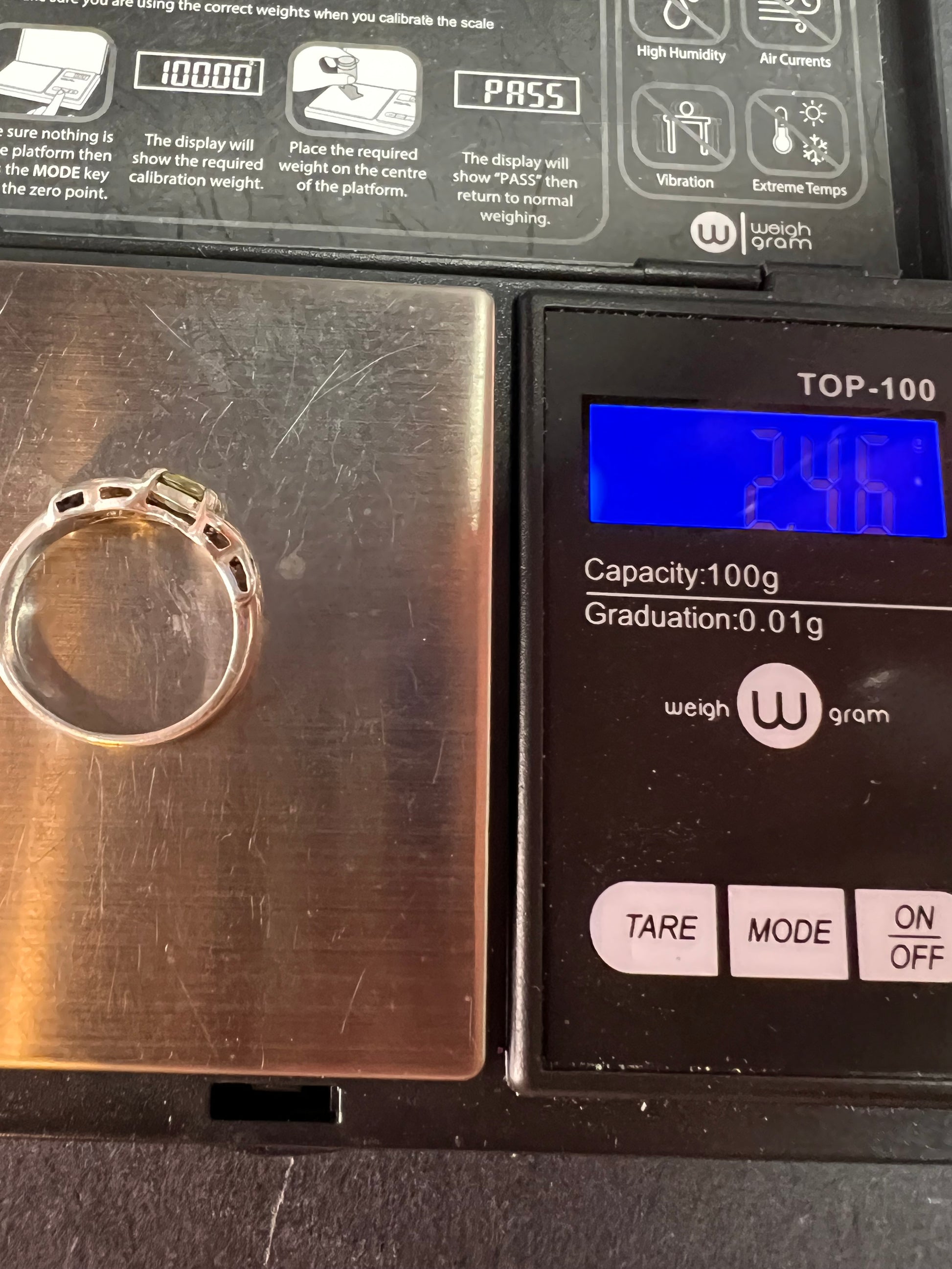 Genuine oval cut peridot gemstone prong set in authentic 925 sterling silver. Measures a size 6.5. As mentioned above , ring has considerable damage. The peridot stone mainly has lots of scratches and what looks like chemical damage from not removing jewelry or using rubber gloves with household cleaners. Just a guess. Total weight of ring is 2.46 grams. If this is a ring you plan on wearing a lot, I would suggest replacing the gemstone at some point.