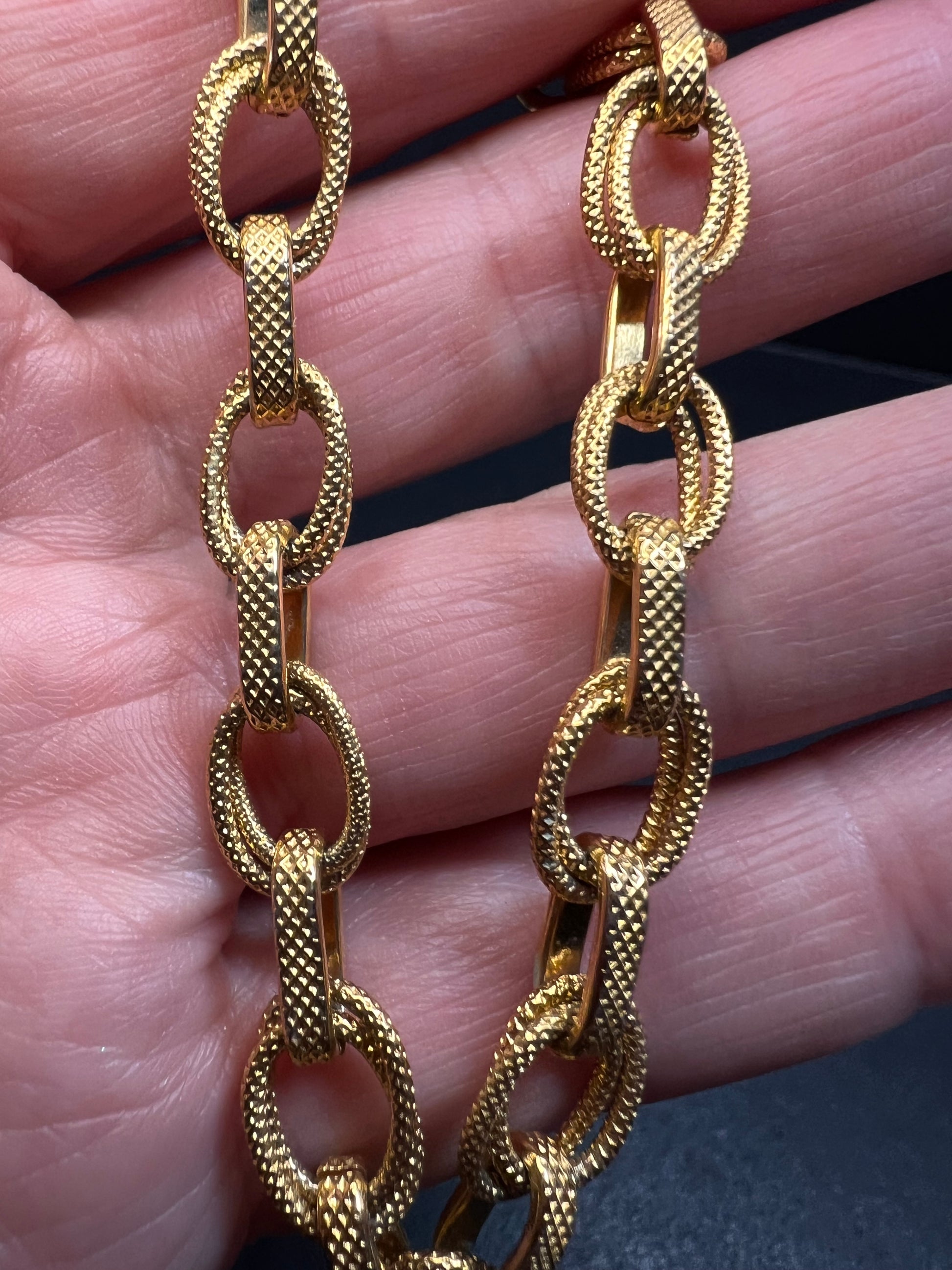 Pre-owned in excellent condition with bright gold color and no plate wear visible. This piece is a solid, well-made Italian 18k gold plated bronze bracelet featuring textured oval links and smooth bar connectors that catch the light beautifully. It has a bold, classic look without being overly heavy on the wrist. The bracelet measures about 8 inches long and weighs 12.80 grams with a sturdy oversized spring-ring clasp. Stamped OTC Italy 18K GEP BZ.