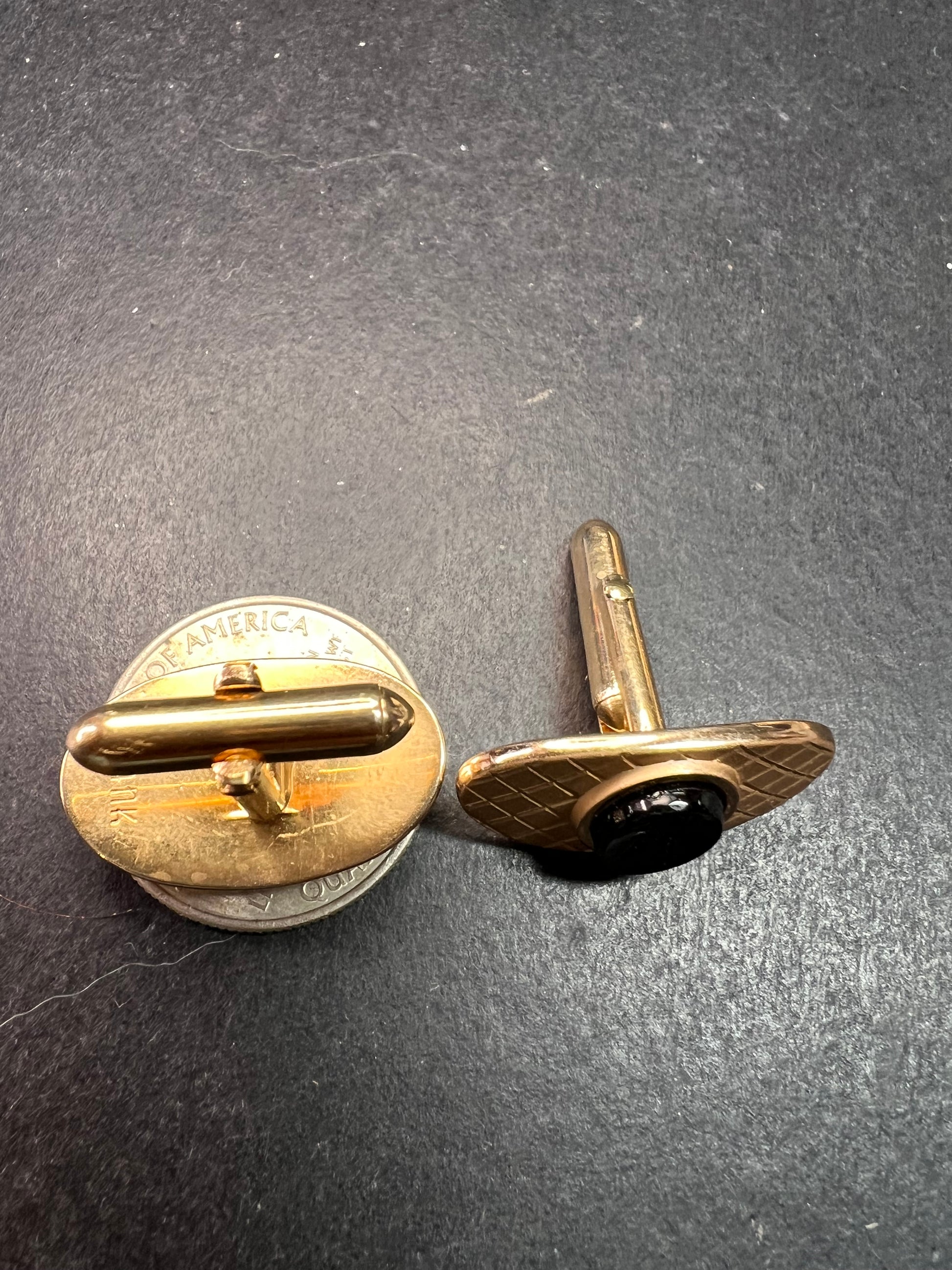 Pre owned, vintage Swank gold tone cufflinks featuring bold black glass centurion cameos. These mid-century pieces have an oval waffle-textured face plate with raised gold bezels framing the carved Roman warrior design. The black cameos appear to be molded glass (often called “intaglio style”), a classic look Swank used throughout the 1950s–1970s. Both cufflinks are stamped SWANK on the backs, and the bullet backs rotate smoothly as they should. Great statement accessories for collectors, vintage menswear, or gifting.