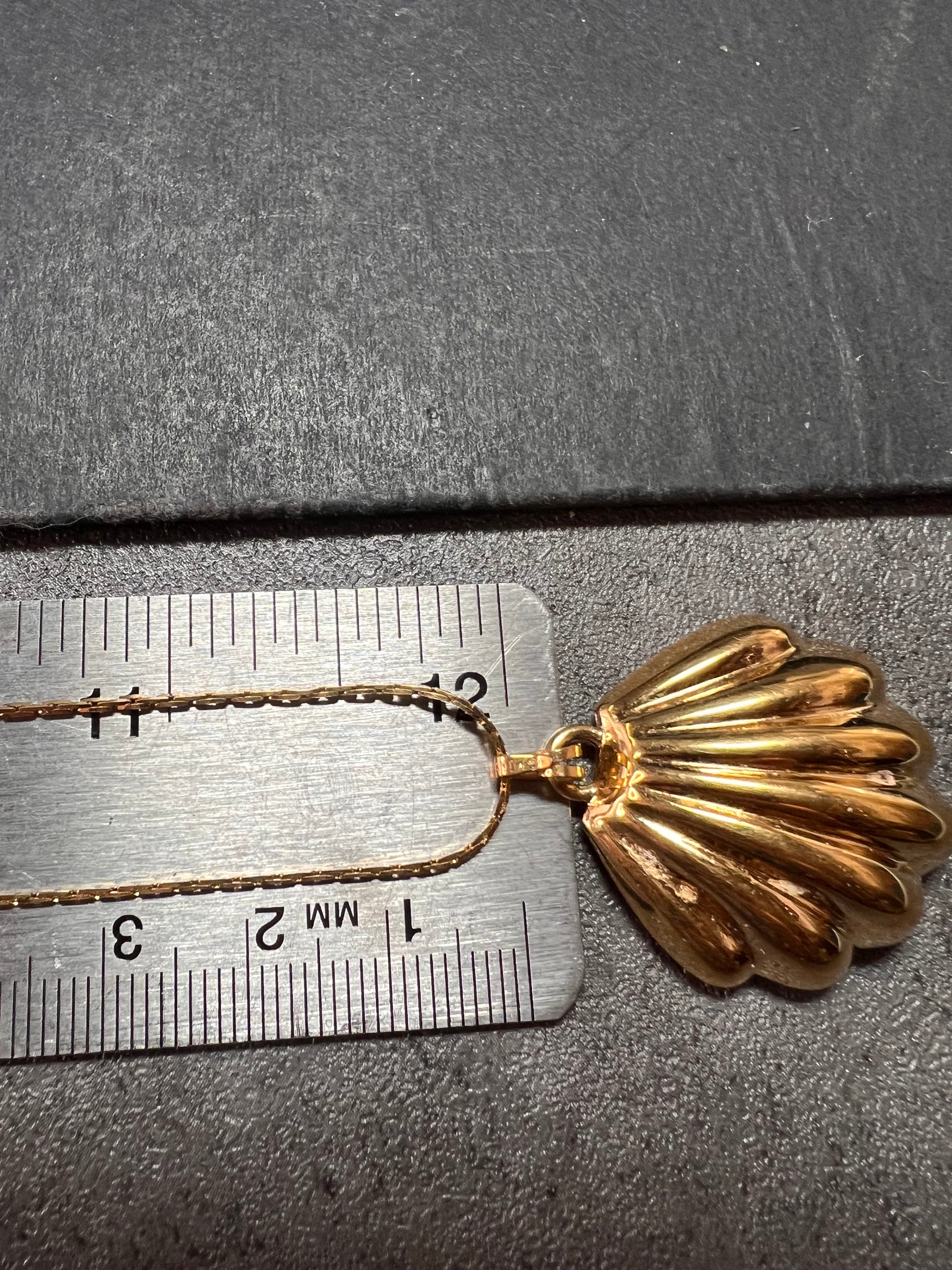 Vintage Monet gold-tone shell pendant necklace in excellent pre-owned condition. Features Monet’s iconic sculptural seashell design with a rich, high-polish finish and dimensional detailing. Pendant measures approximately 1.25 inches long (see photos for scale) and hangs from a 24-inch gold-tone chain for easy layering. Back of the pendant is clearly stamped ©MONET for authenticity. Secure spring-ring clasp with Monet hang tag still attached. Classic mid-century coastal statement necklace with only light surface wear consistent with age.