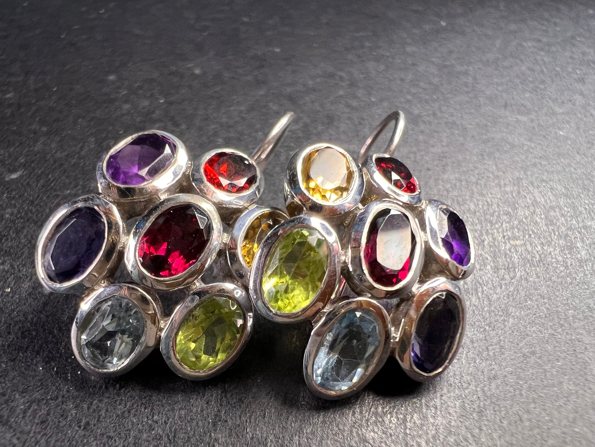 These pre-owned earrings are in excellent vintage condition with only minimal wear visible under close inspection. Like new. Crafted in solid sterling silver, each earring features a bezel-set cluster of seven faceted oval gemstones arranged in a floral pattern. The stones include deep garnet red, vibrant amethyst purple, golden citrine, green peridot, sky blue topaz, and a bluish-violet iolite, creating a vivid rainbow spectrum.