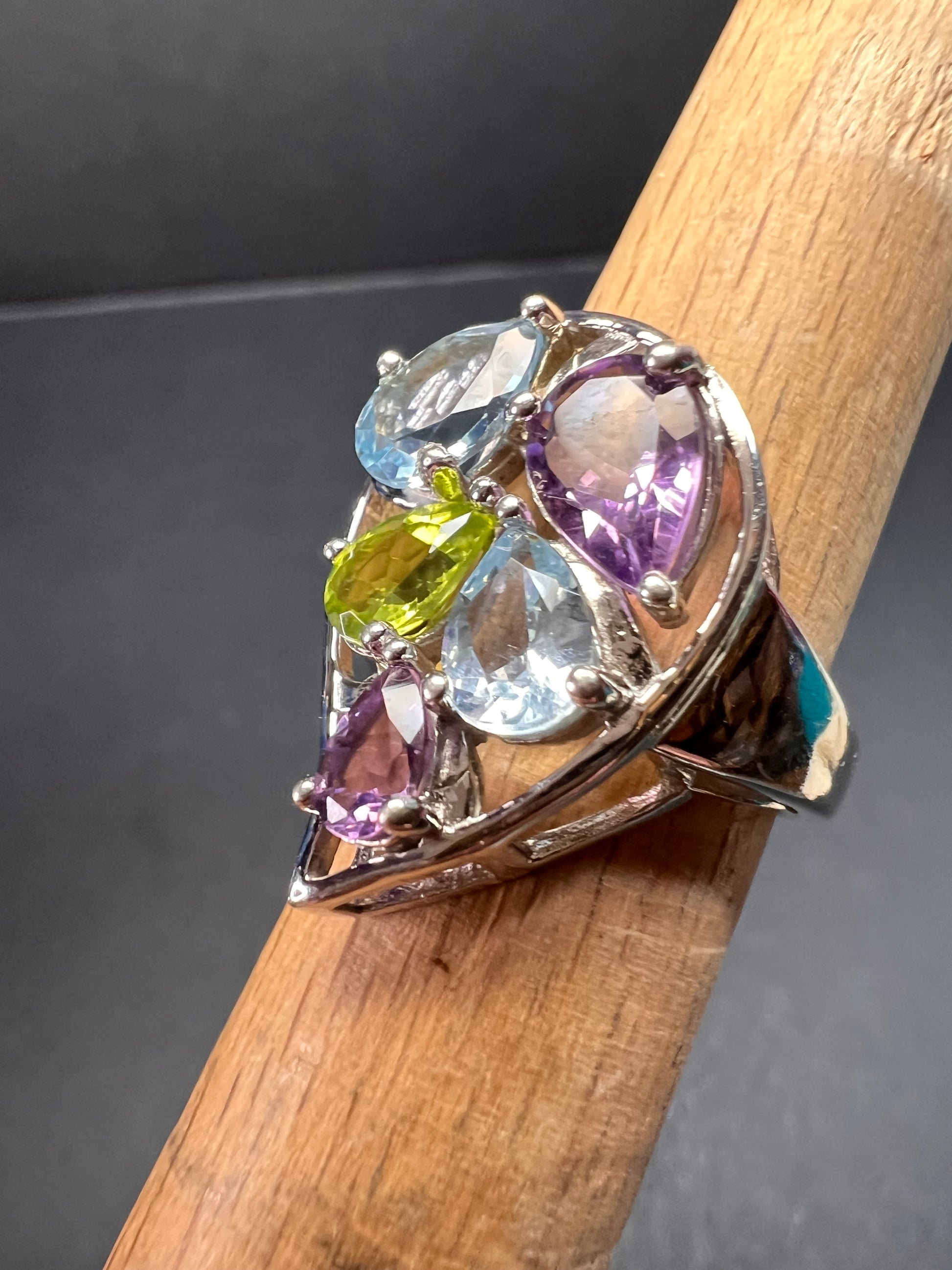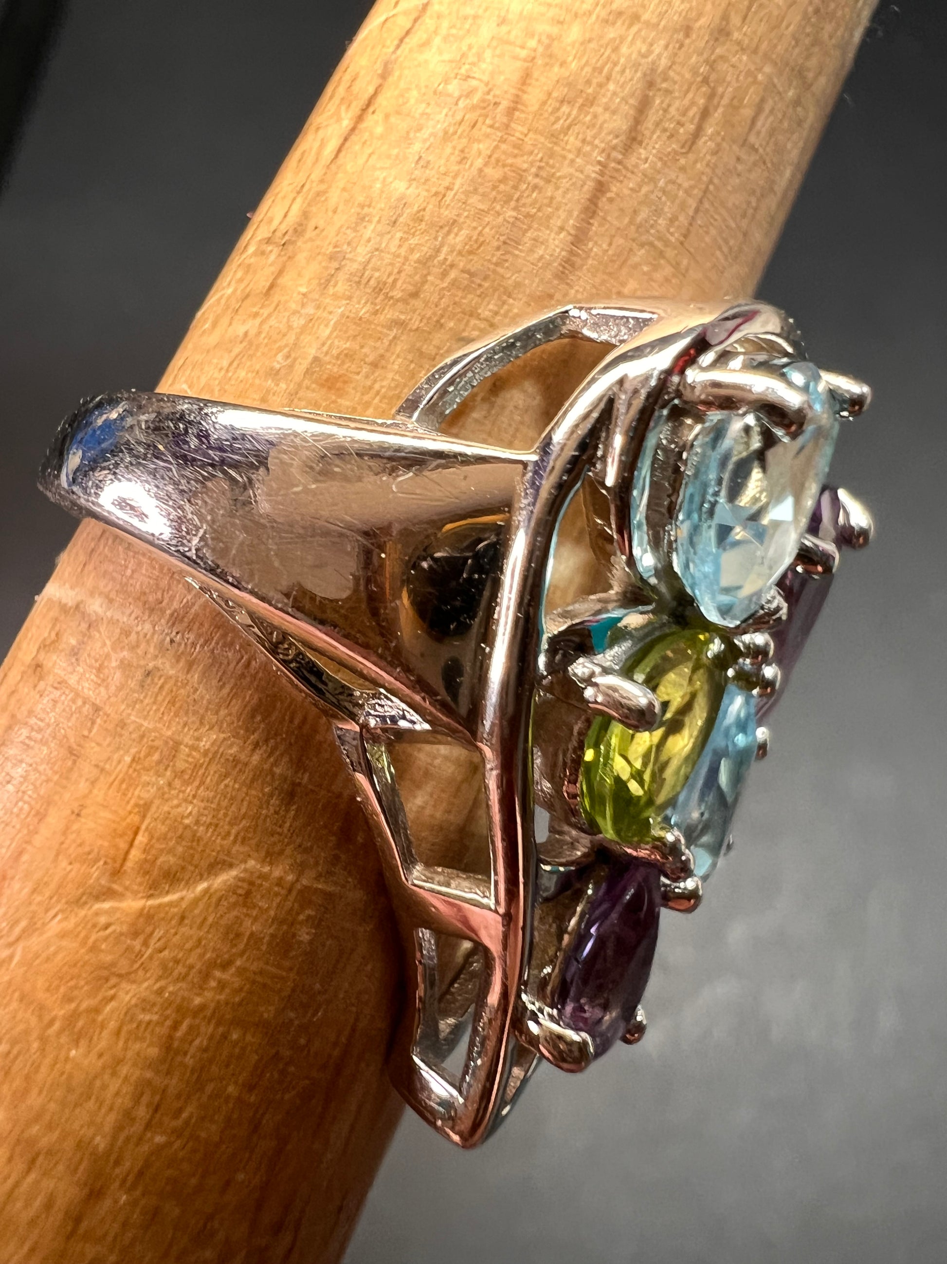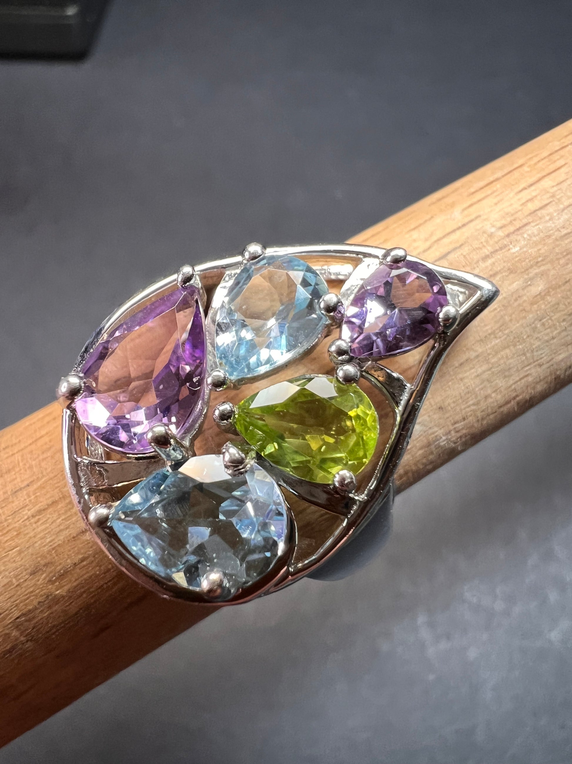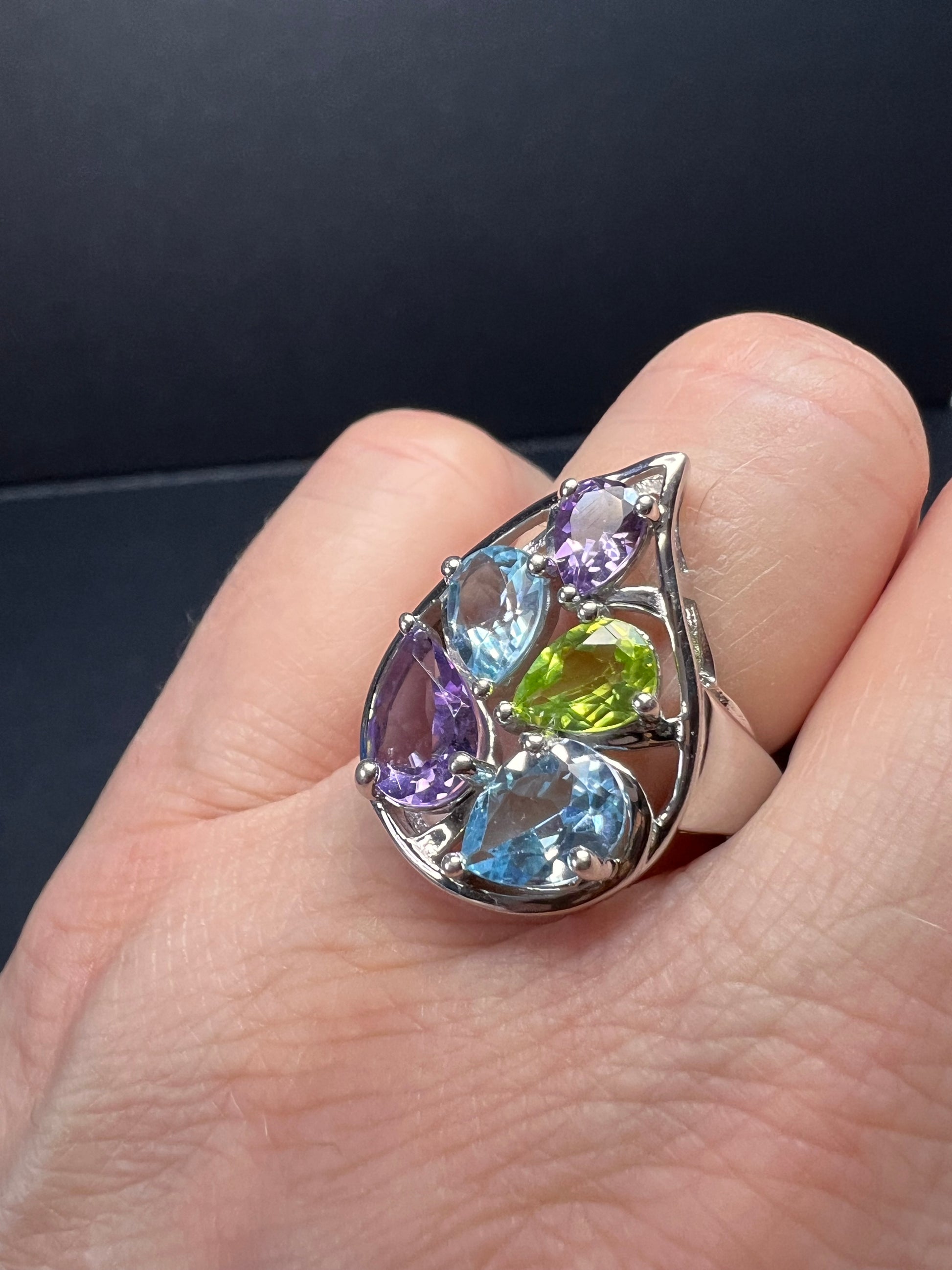 Genuine gemstones of blue topaz, peridot, and amethyst prong set in authentic 925 sterling silver that’s likely plated with rhodium. 925 Thailand. Total weight is 6.56 grams
