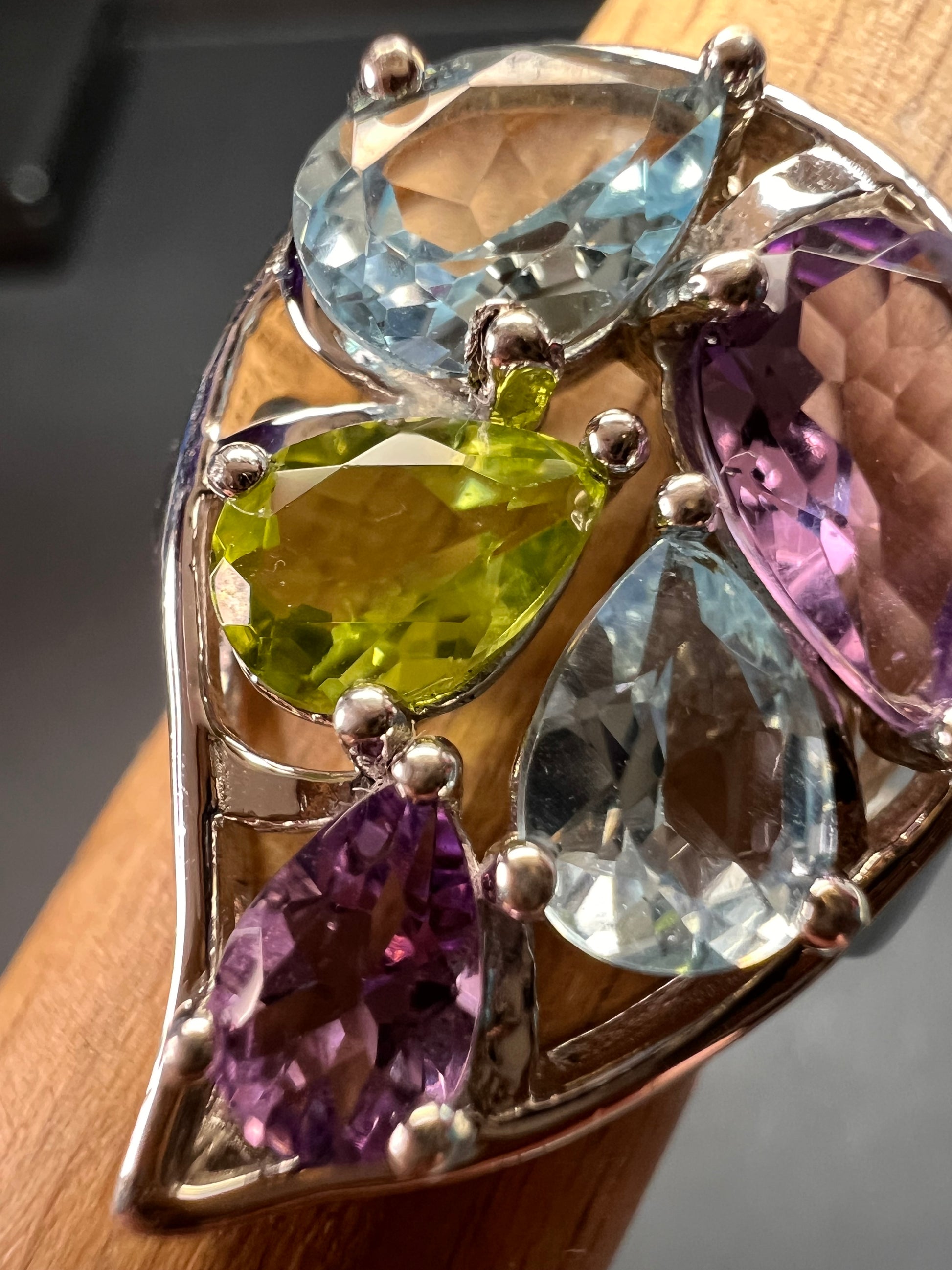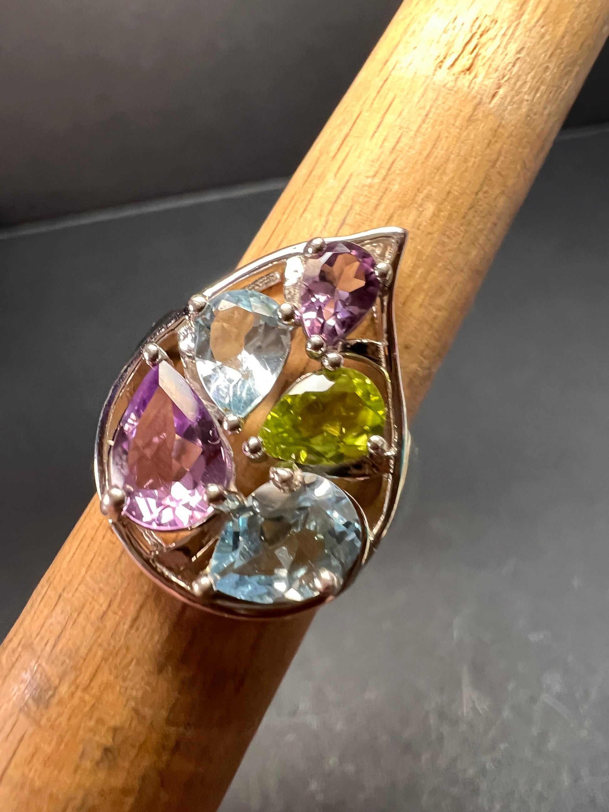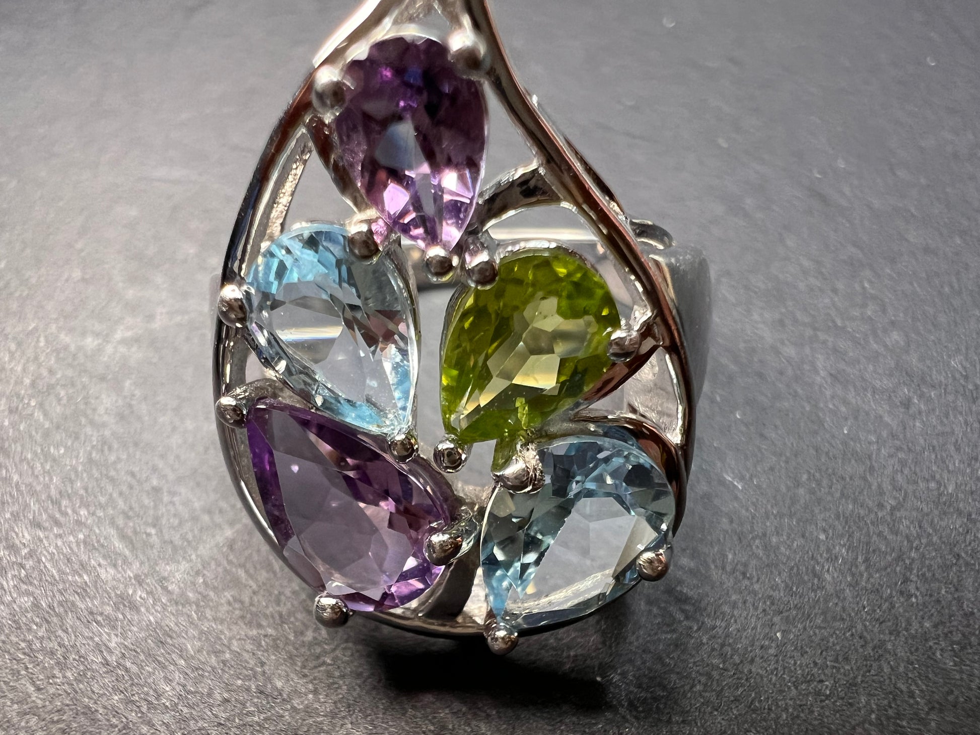 Genuine gemstones of blue topaz, peridot, and amethyst prong set in authentic 925 sterling silver that’s likely plated with rhodium. 925 Thailand. Total weight is 6.56 grams