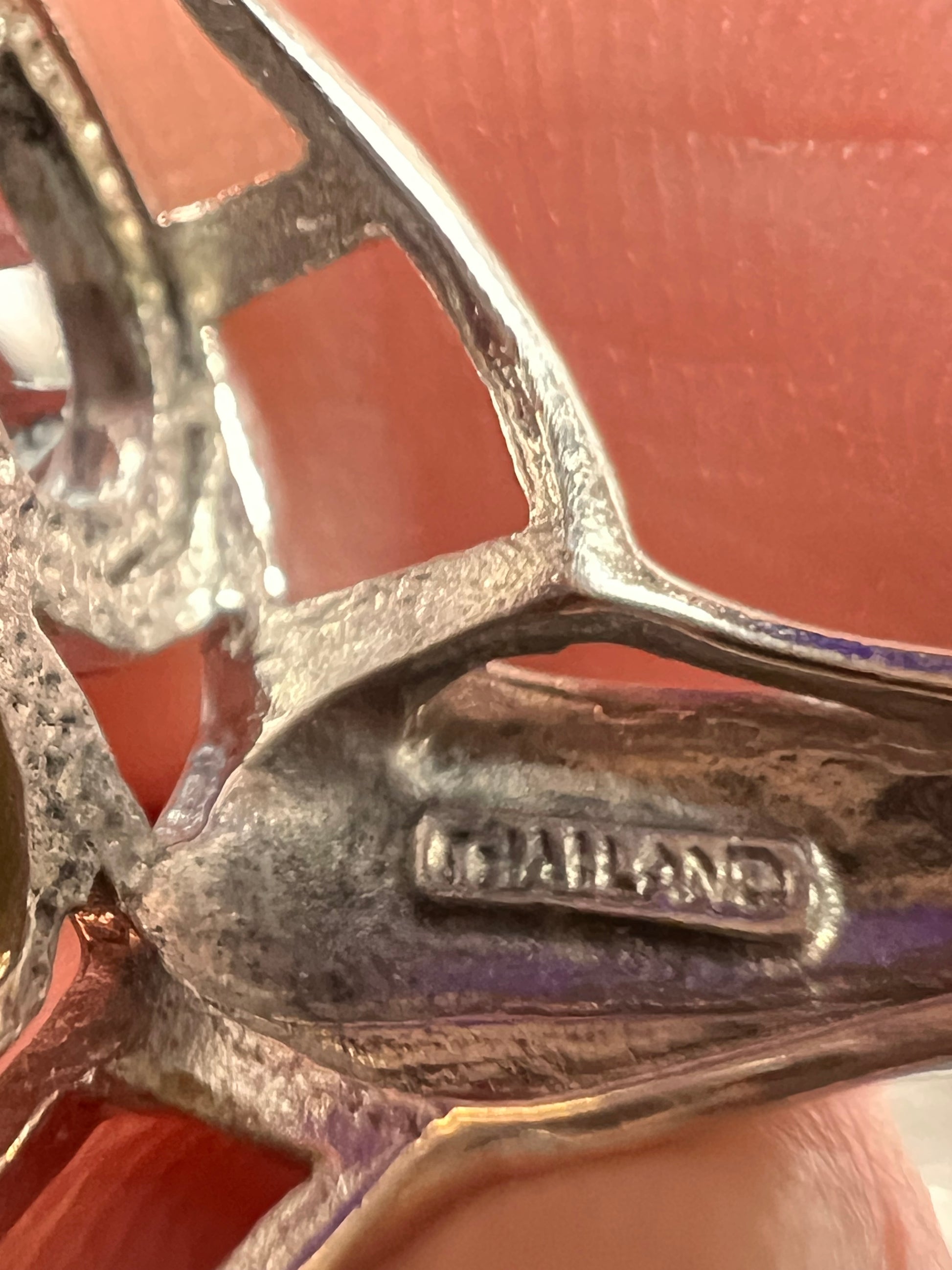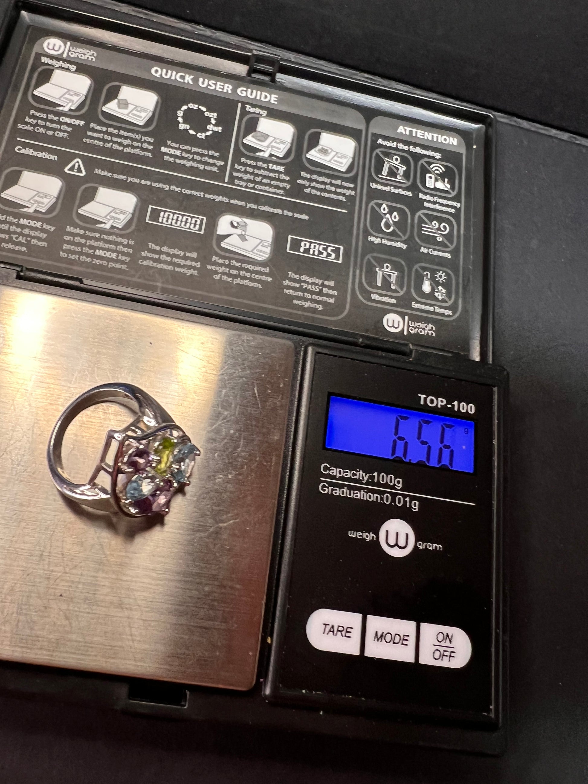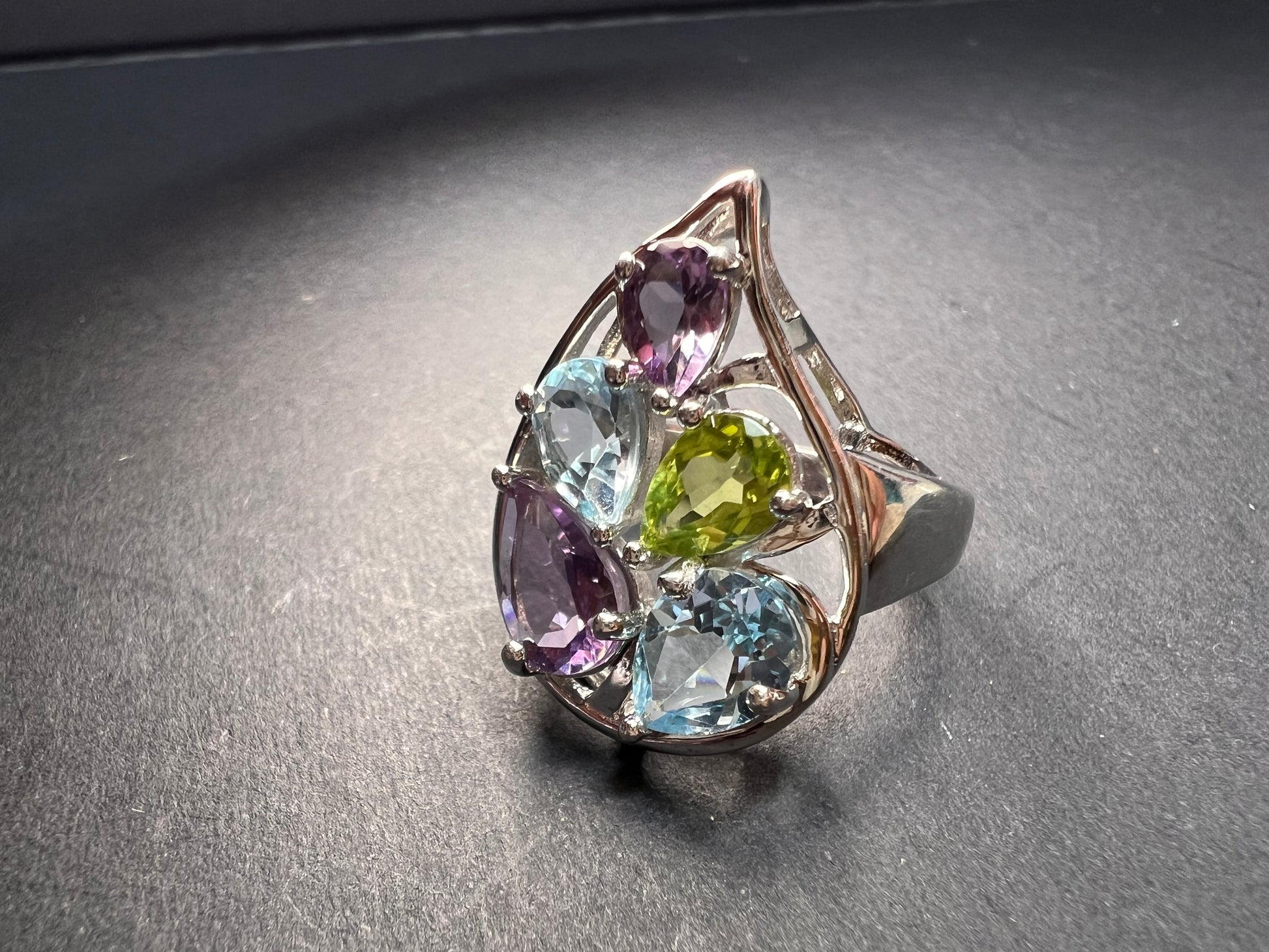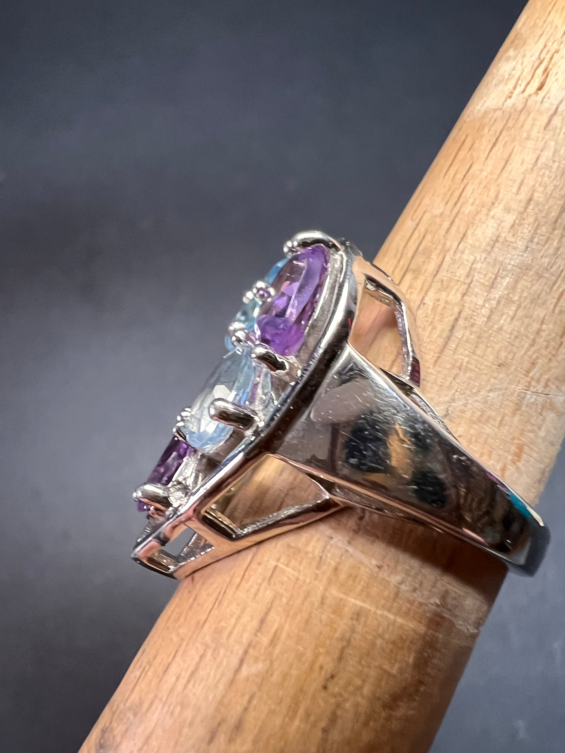 Genuine gemstones of blue topaz, peridot, and amethyst prong set in authentic 925 sterling silver that’s likely plated with rhodium. 925 Thailand. Total weight is 6.56 grams