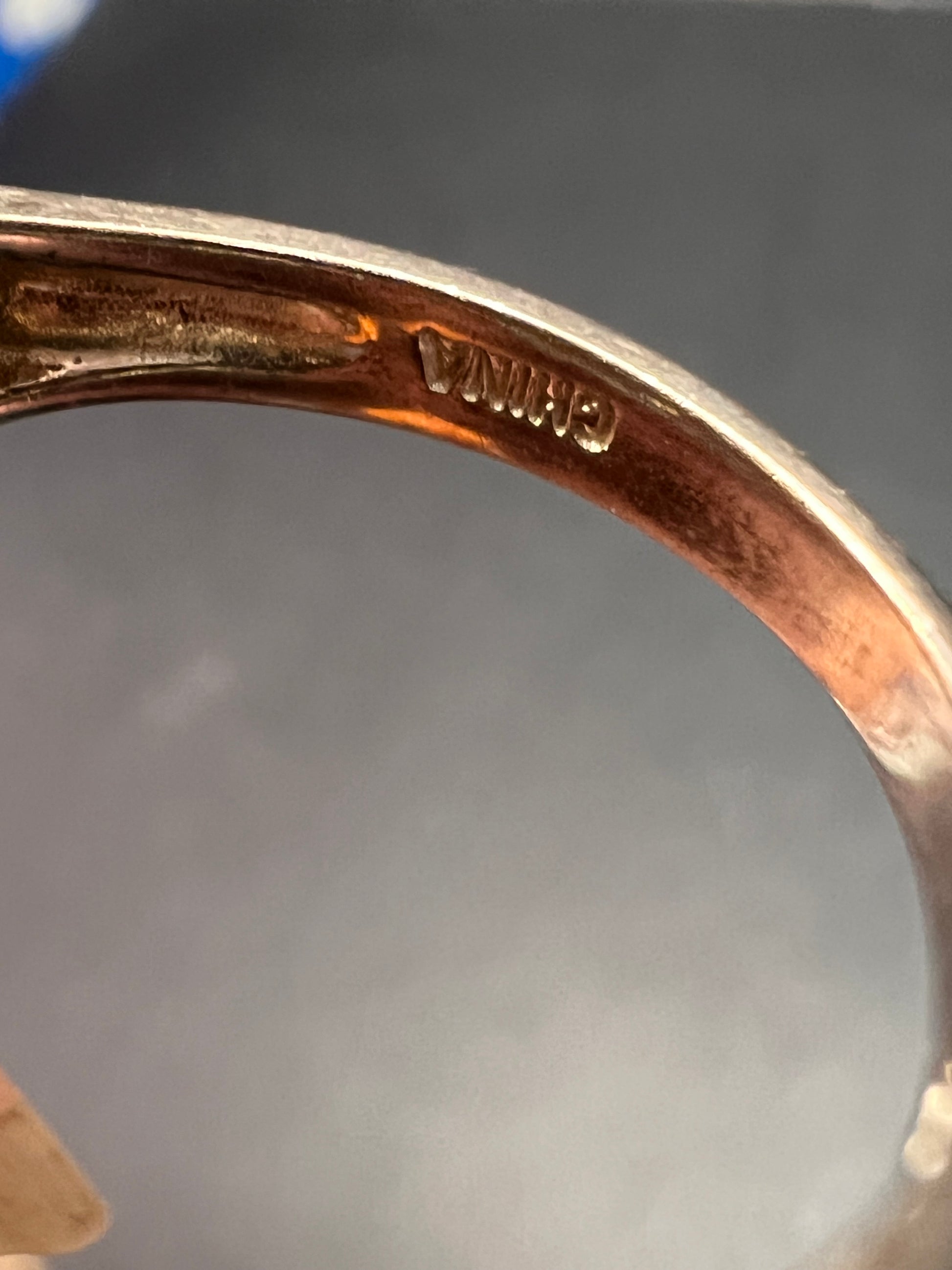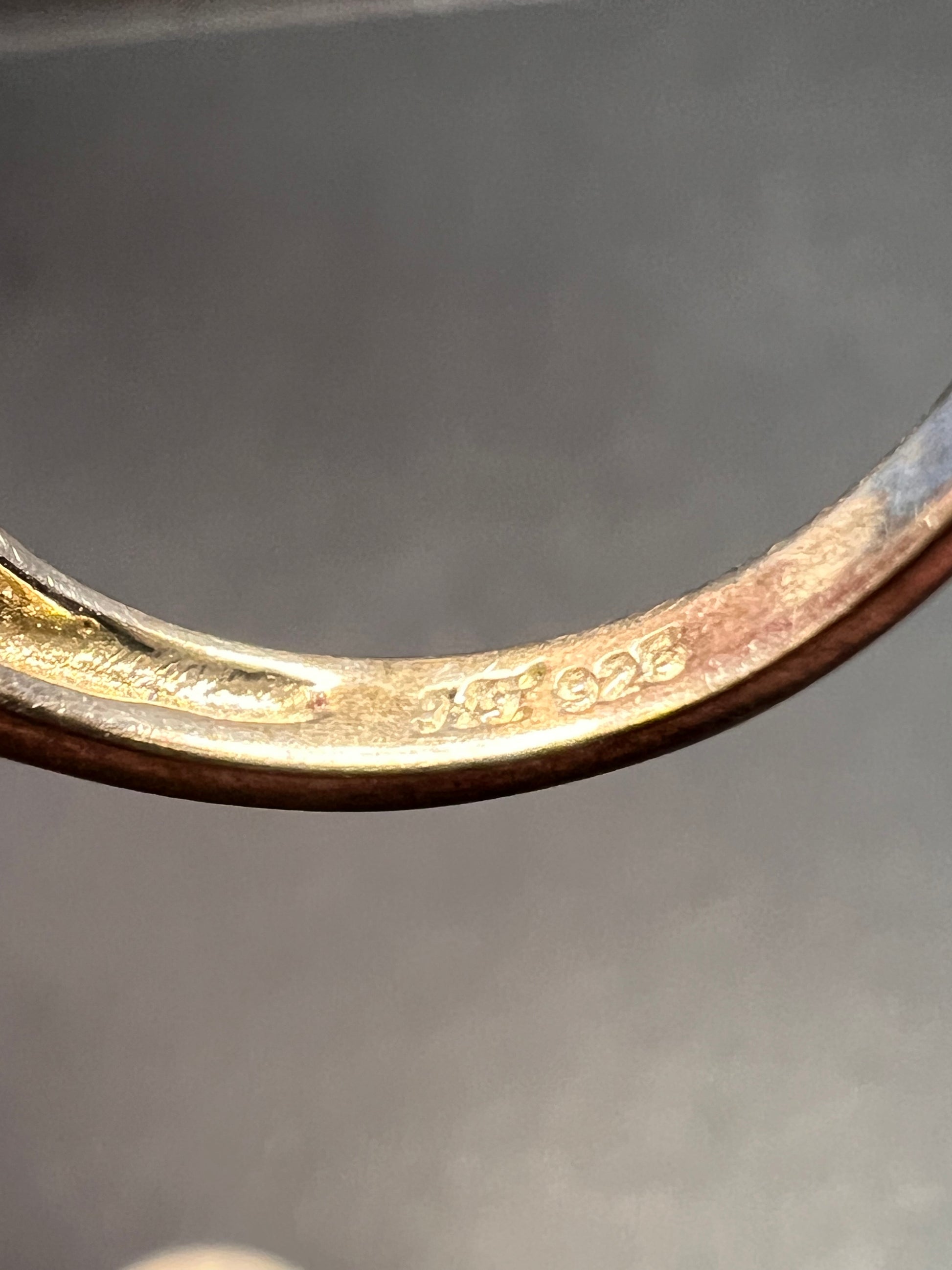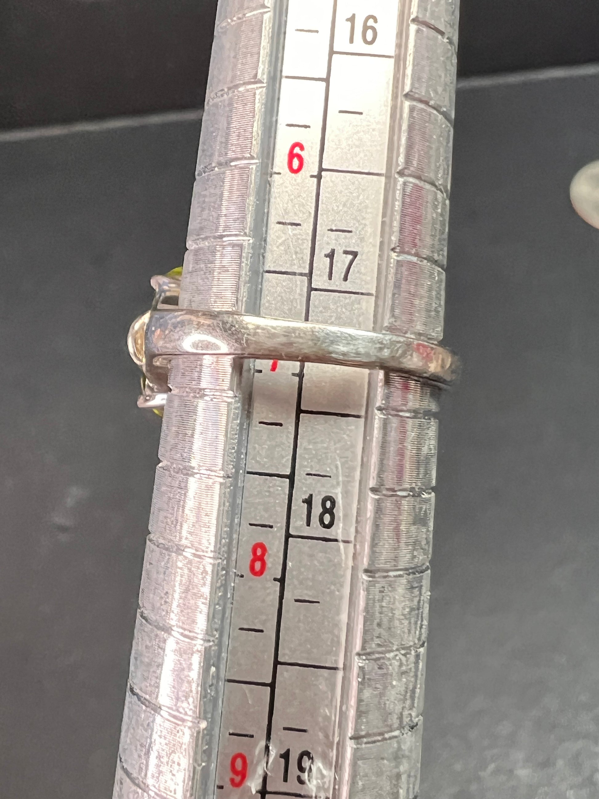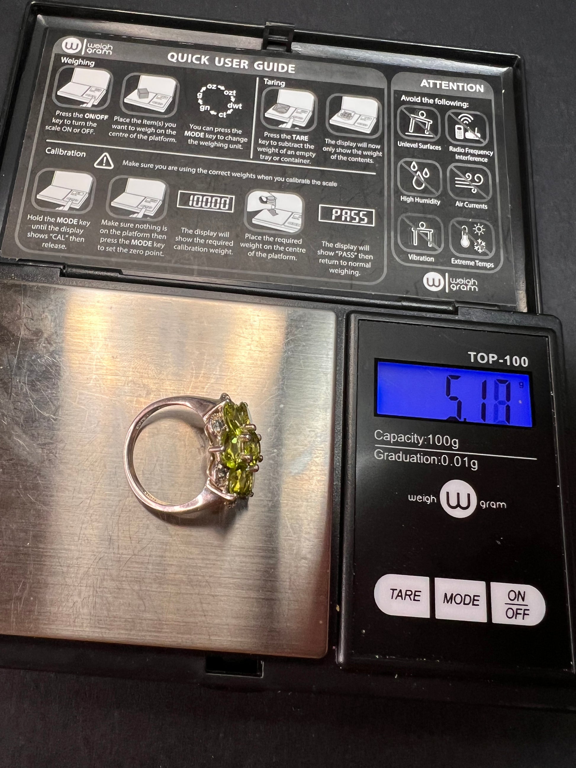 Genuine peridot gemstones prong set in an authentic 925 sterling silver ring plated with rhodium. Measures size 7. Total weight is 5.17 grams. Little blue accent stones are aquamarine. Unknown HT hallmark. 925. Made in China. I believe this was a QVC ring. Early 2000s.