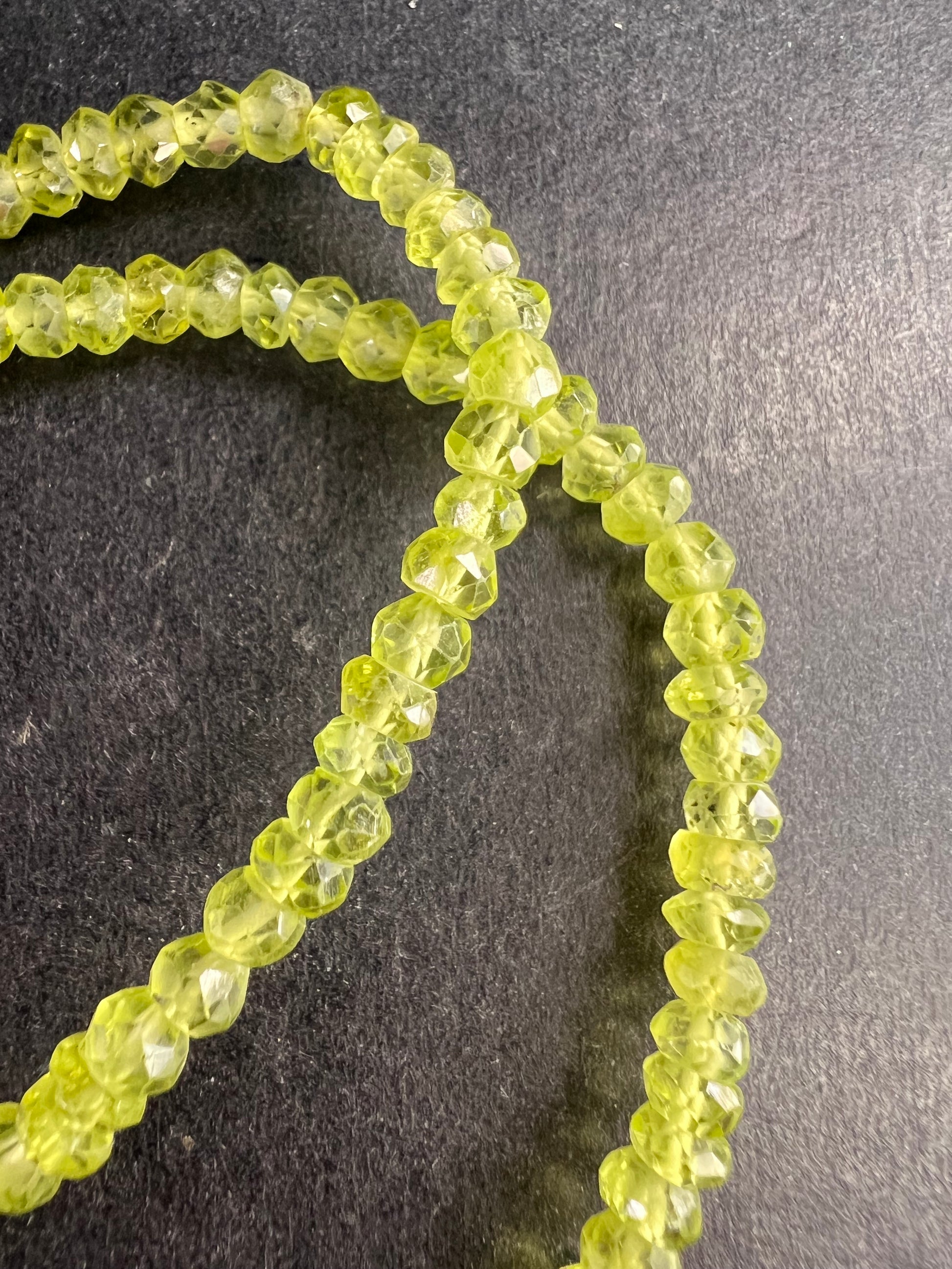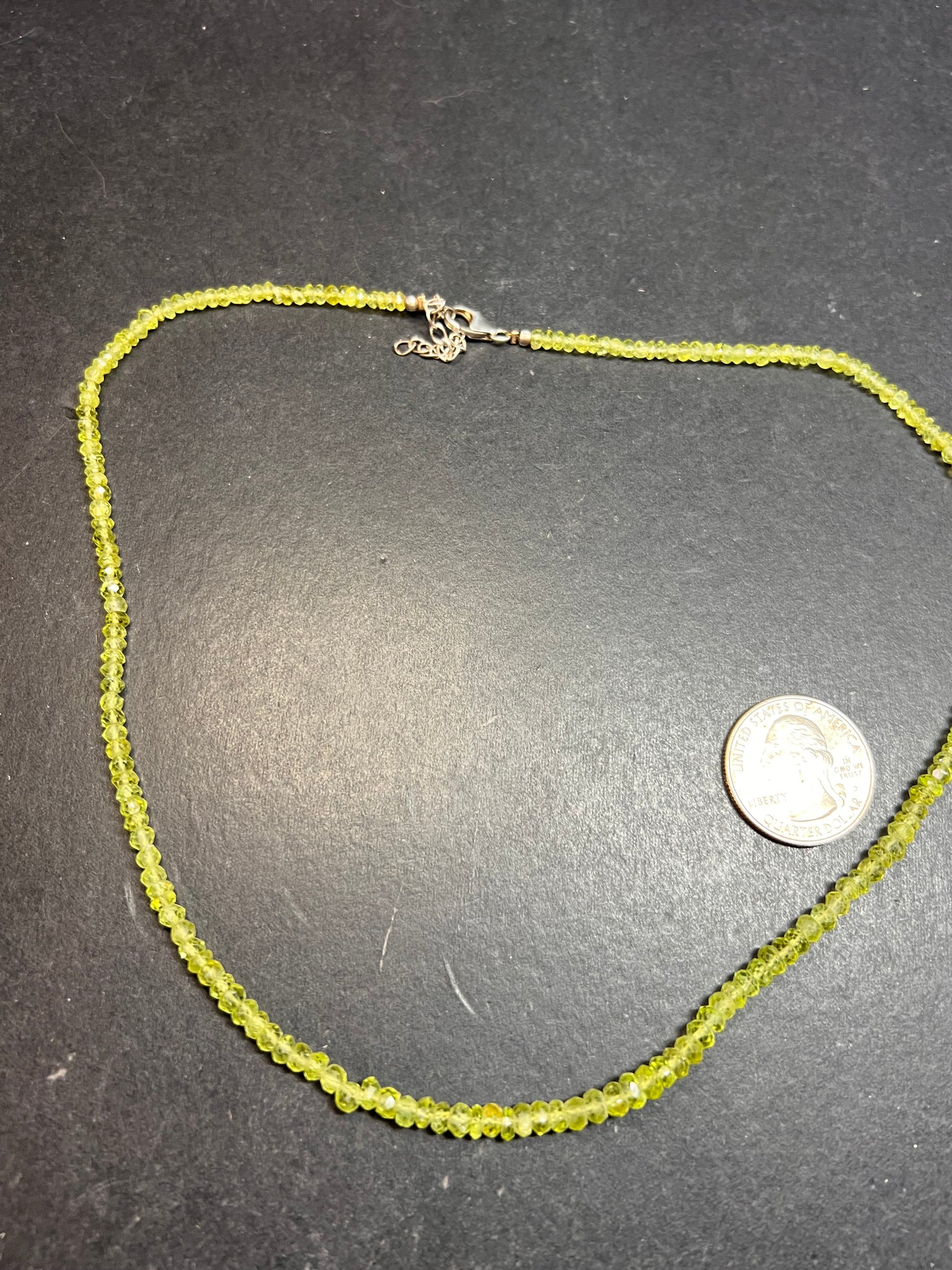 Estate-acquired gently pre-owned vintage peridot necklace featuring natural faceted rondelle beads graduated approximately 2.5–4.5mm. The luminous yellow-green peridot strand measures about 18 inches with a 2 inch sterling silver extension for an adjustable 18–20 inch fit. Finished with a genuine sterling silver lobster clasp stamped 925 KJC India. Beads are beautifully cut for sparkle and well matched in color. A delicate, elegant August birthstone necklace perfect for layering or everyday wear. Excellent vintage condition with no issues noted.