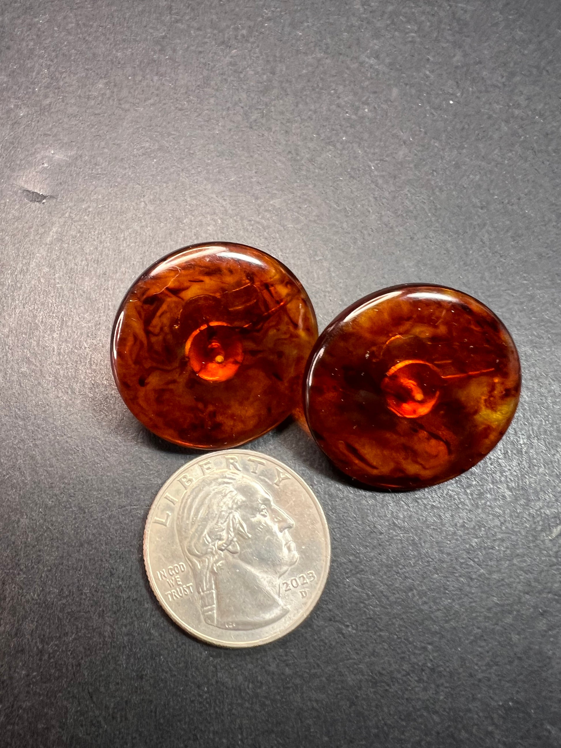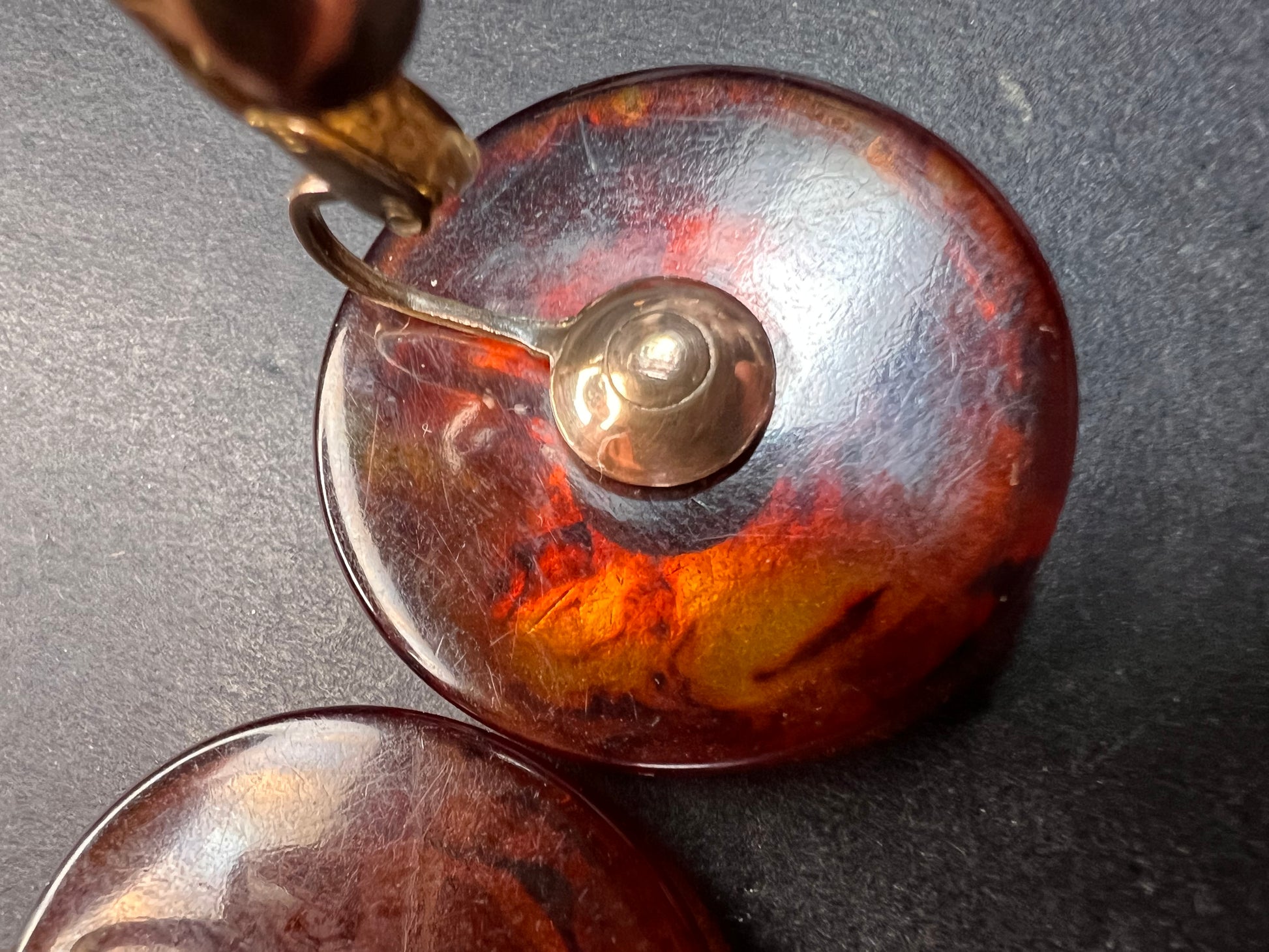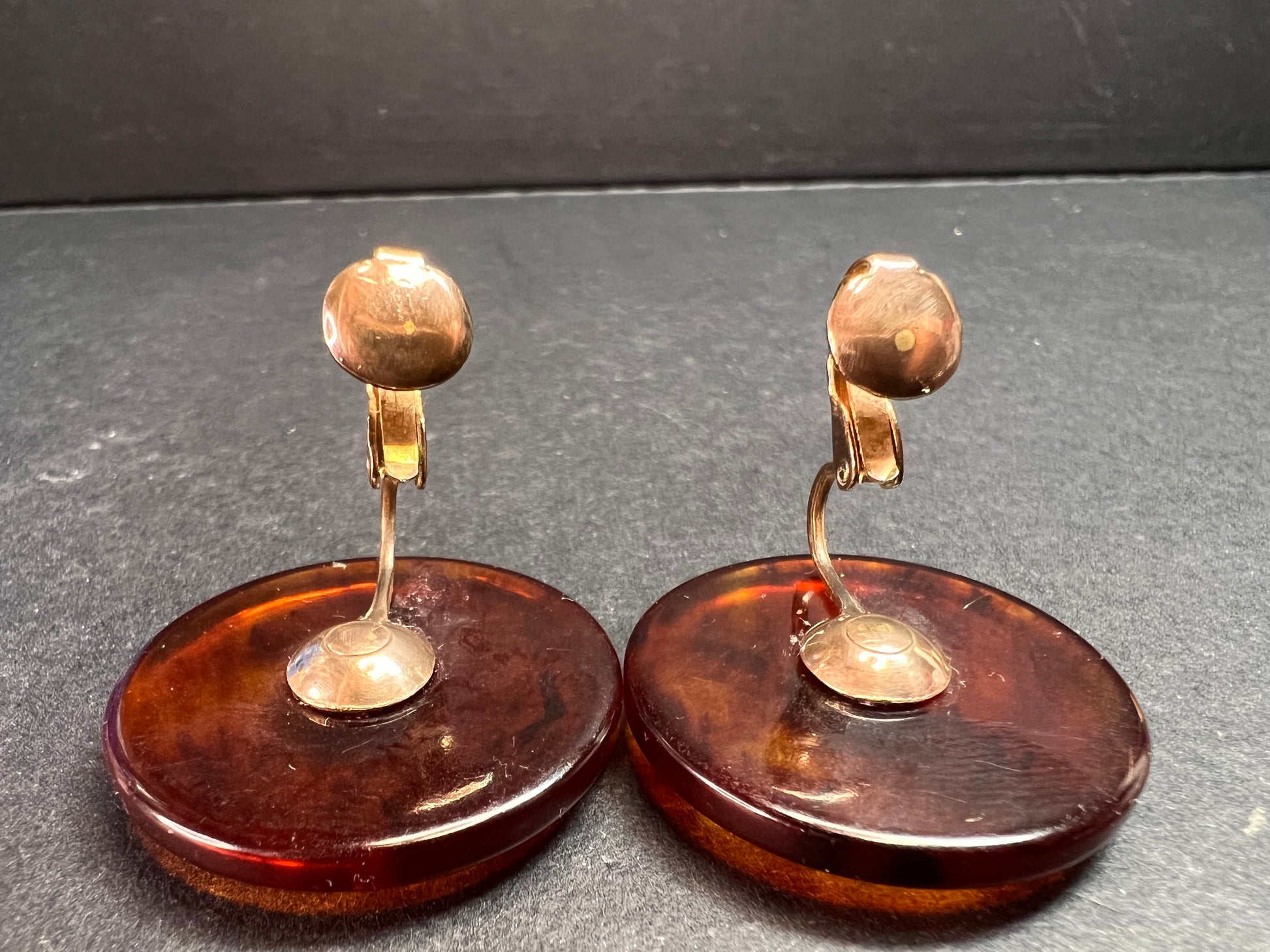 These have been lightly slightly cleaned up. Bakelite has been tested with Simichrome polish and Q-tip turned yellow. Metal findings ended up getting a little polished in the process but were darker from tarnish. No damage found. 40’s era I believe. I believe this color of bakelite is called “root beer”.