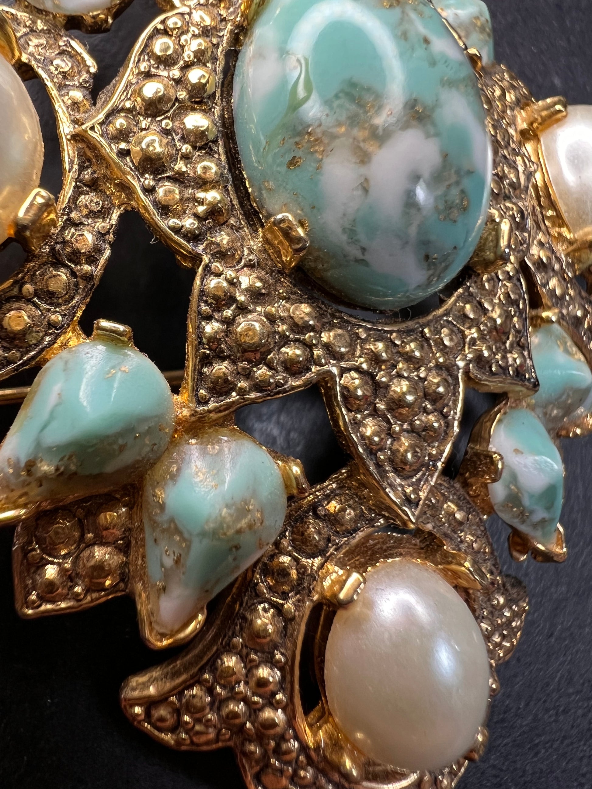 Vintage Sarah Coventry Remembrance brooch pin in gold tone with faux robins egg turquoise and faux pearls. Signed. 1968 era I believe