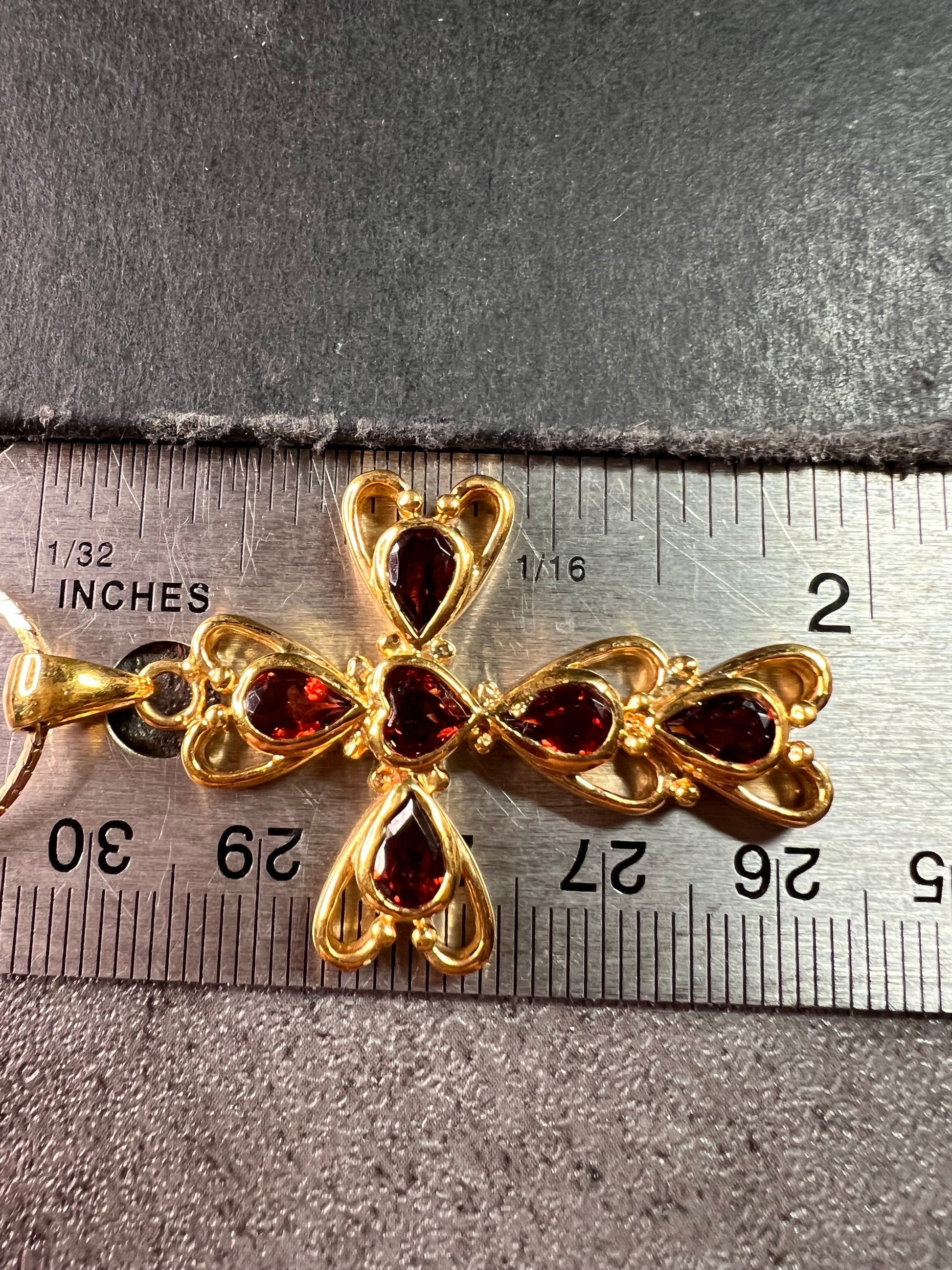 Vintage SETA Garnet Cross Pendant Necklace Gold Tone 24”