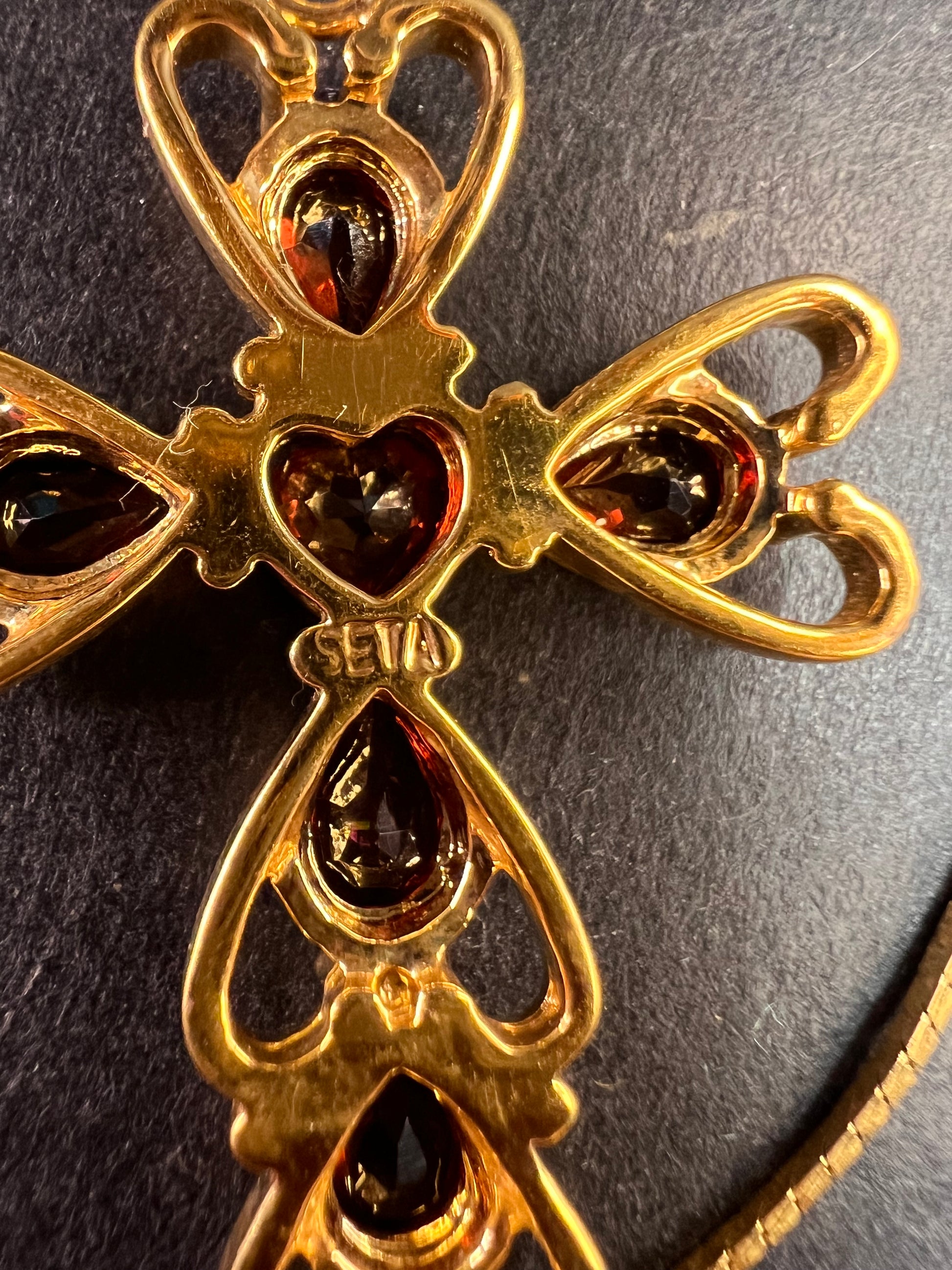 Vintage cross pendant signed SETA, featuring seven genuine faceted garnet gemstones with an estimated total weight of approx. 3.5 ctw. The sculptural open-work cross design measures about 2” tall (see ruler photo). Pendant is non-magnetic and appears to be gold plated over a bronze or similar alloy. The 24” gold tone diamond-cut box chain is magnetic, unmarked, and likely not original to the pendant but pairs well stylistically. Estate find in excellent vintage condition with bright stones and secure settings. Garnet is associated with protection, strength, and deep love.