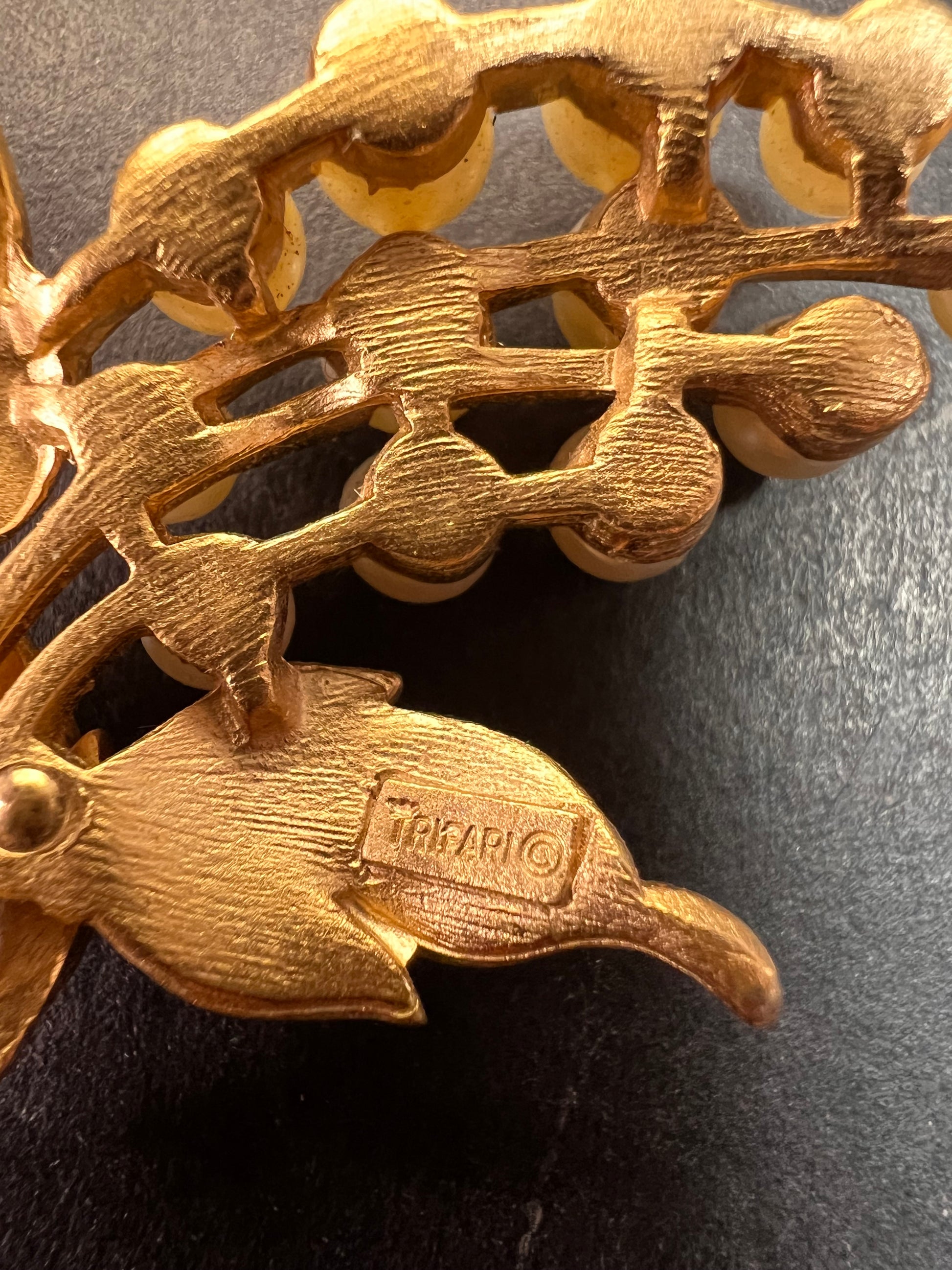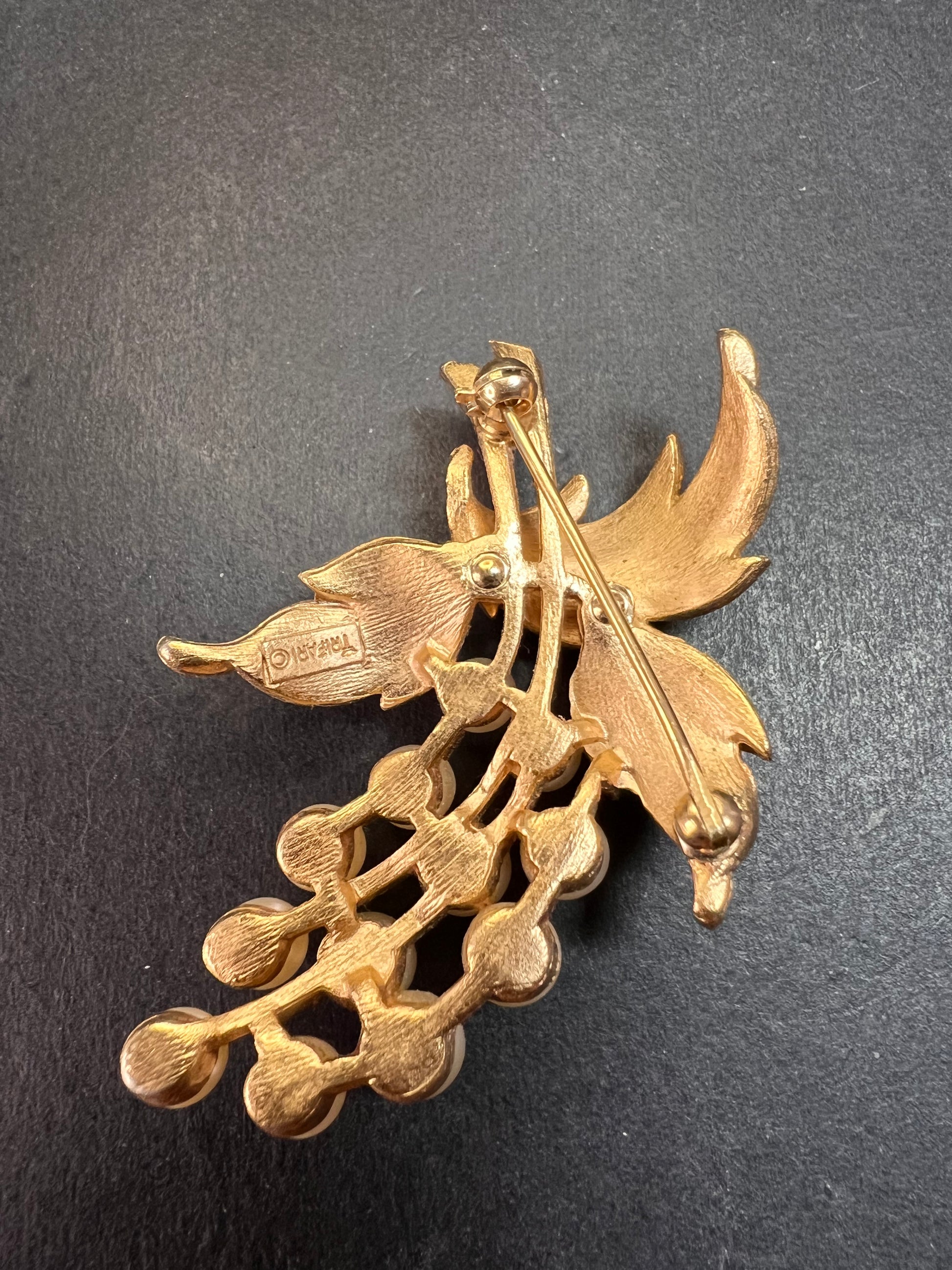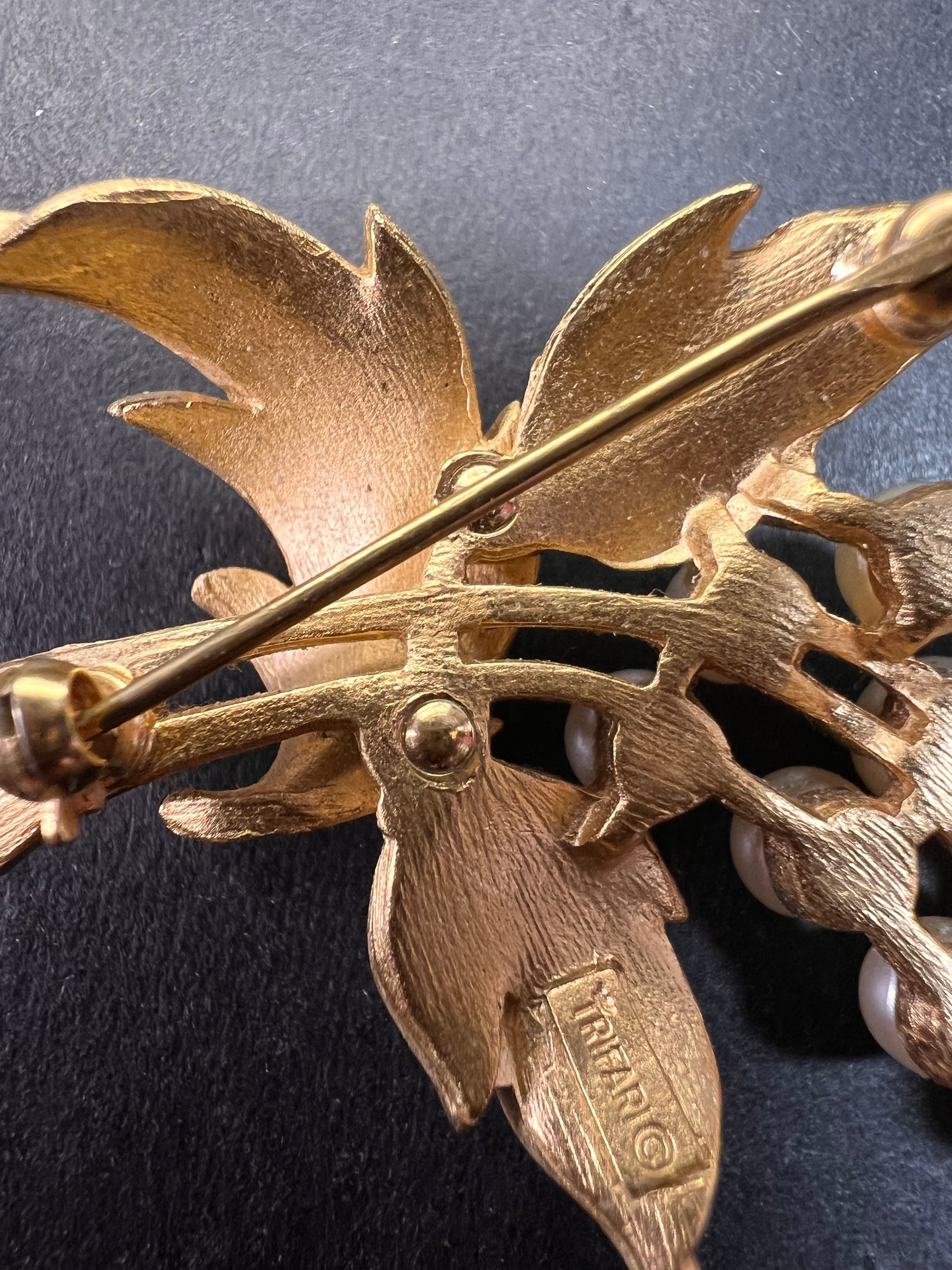 Vintage signed crown Trifari brushed goldtone pearl spray brooch