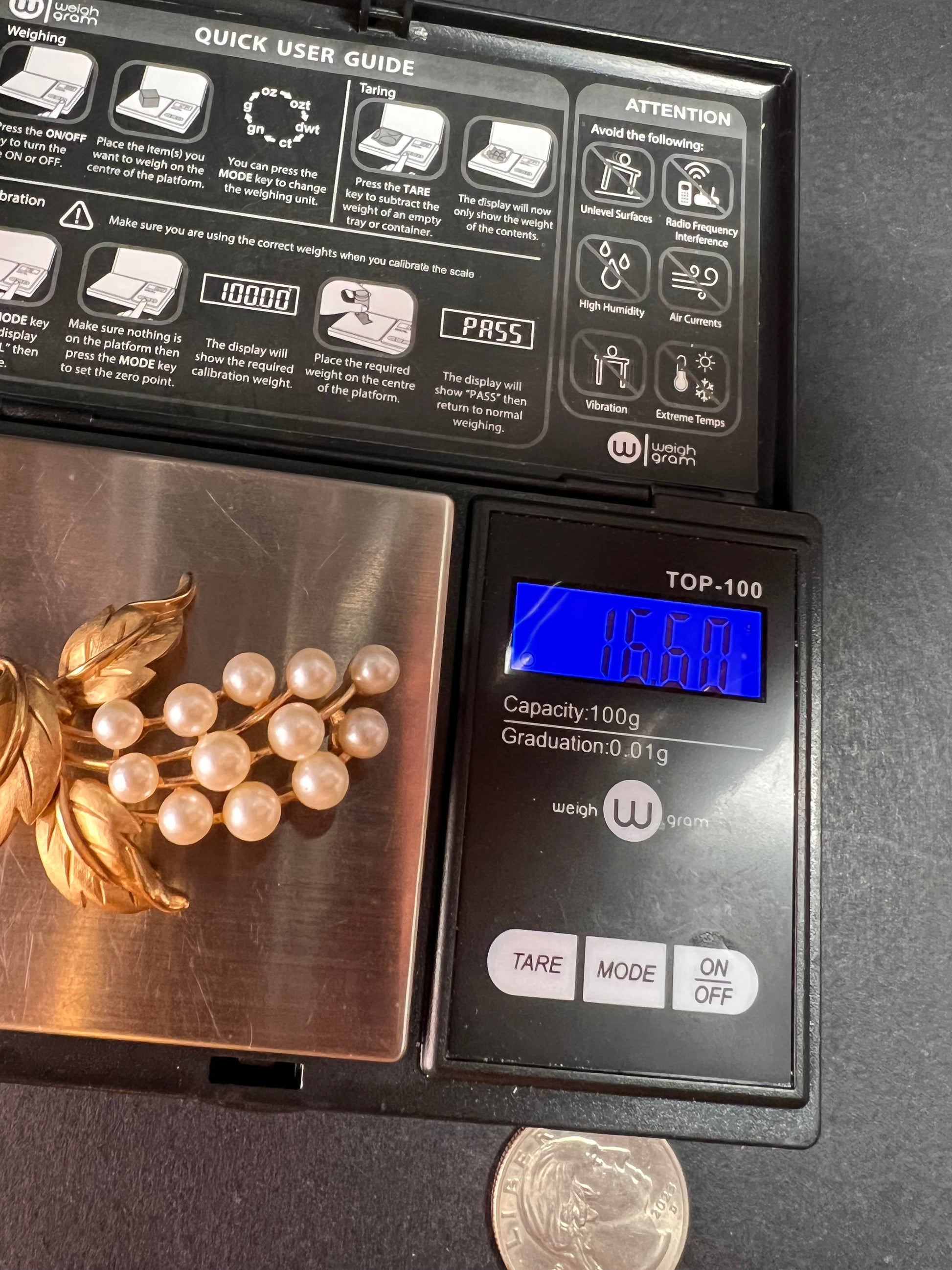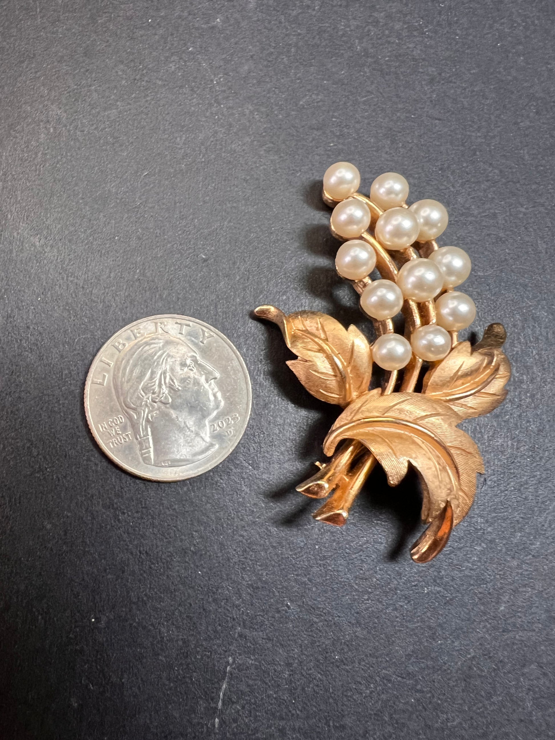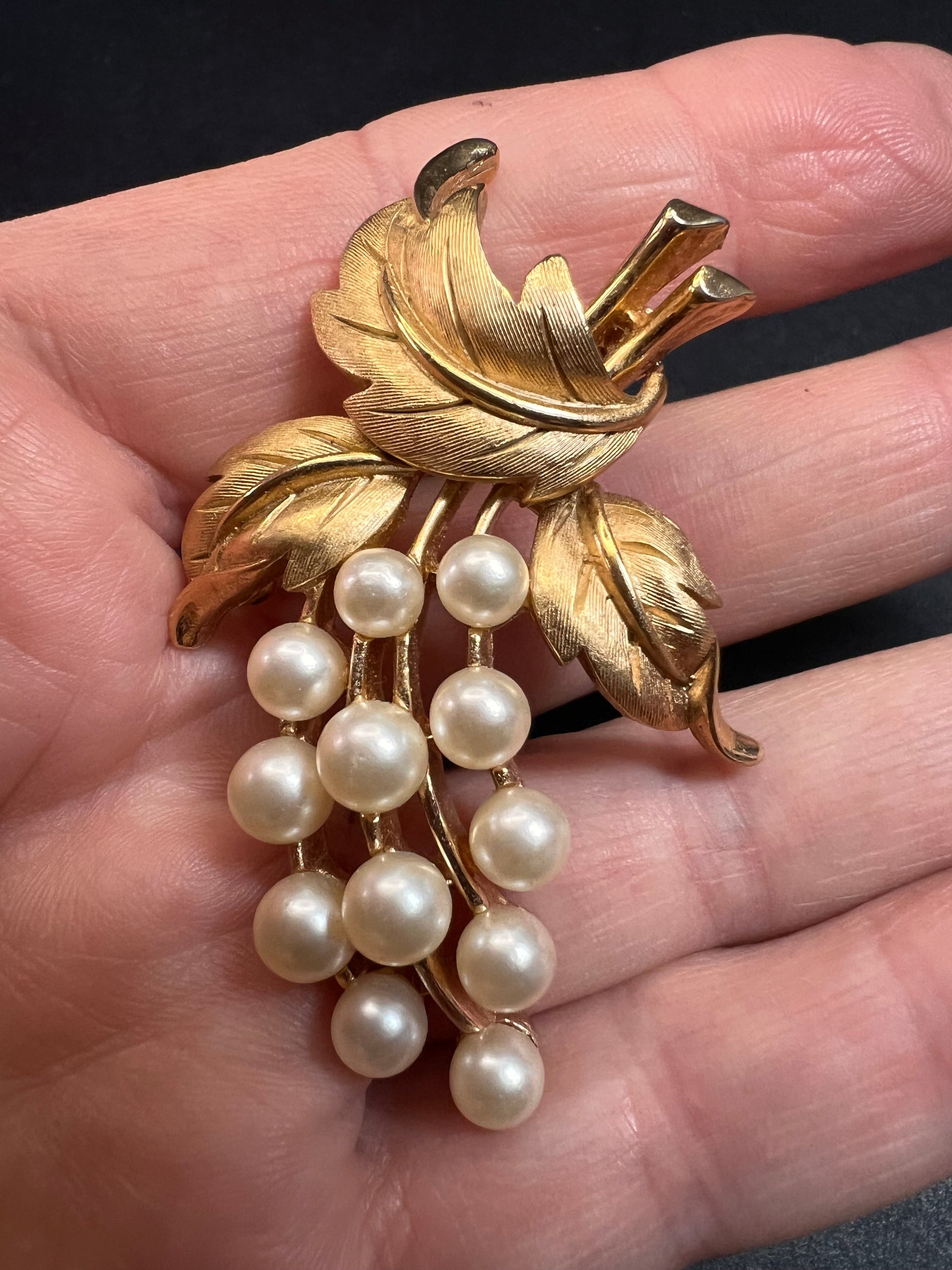 Vintage signed crown Trifari brushed goldtone pearl spray brooch