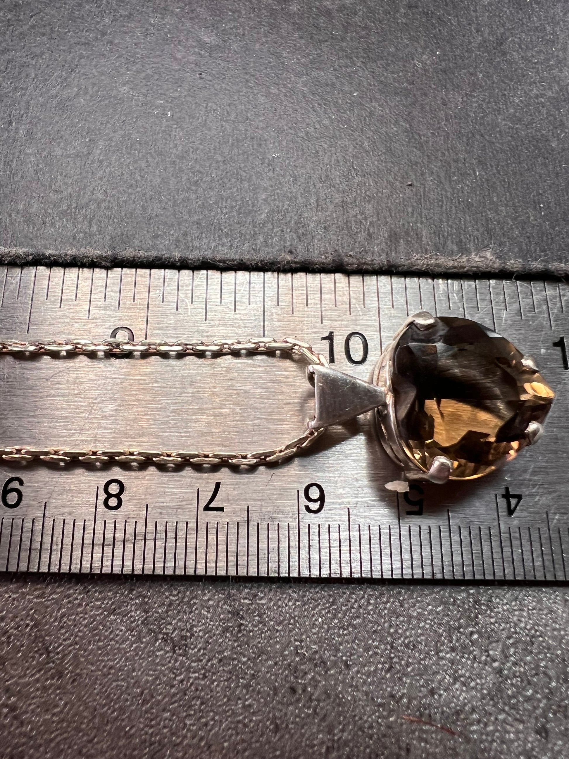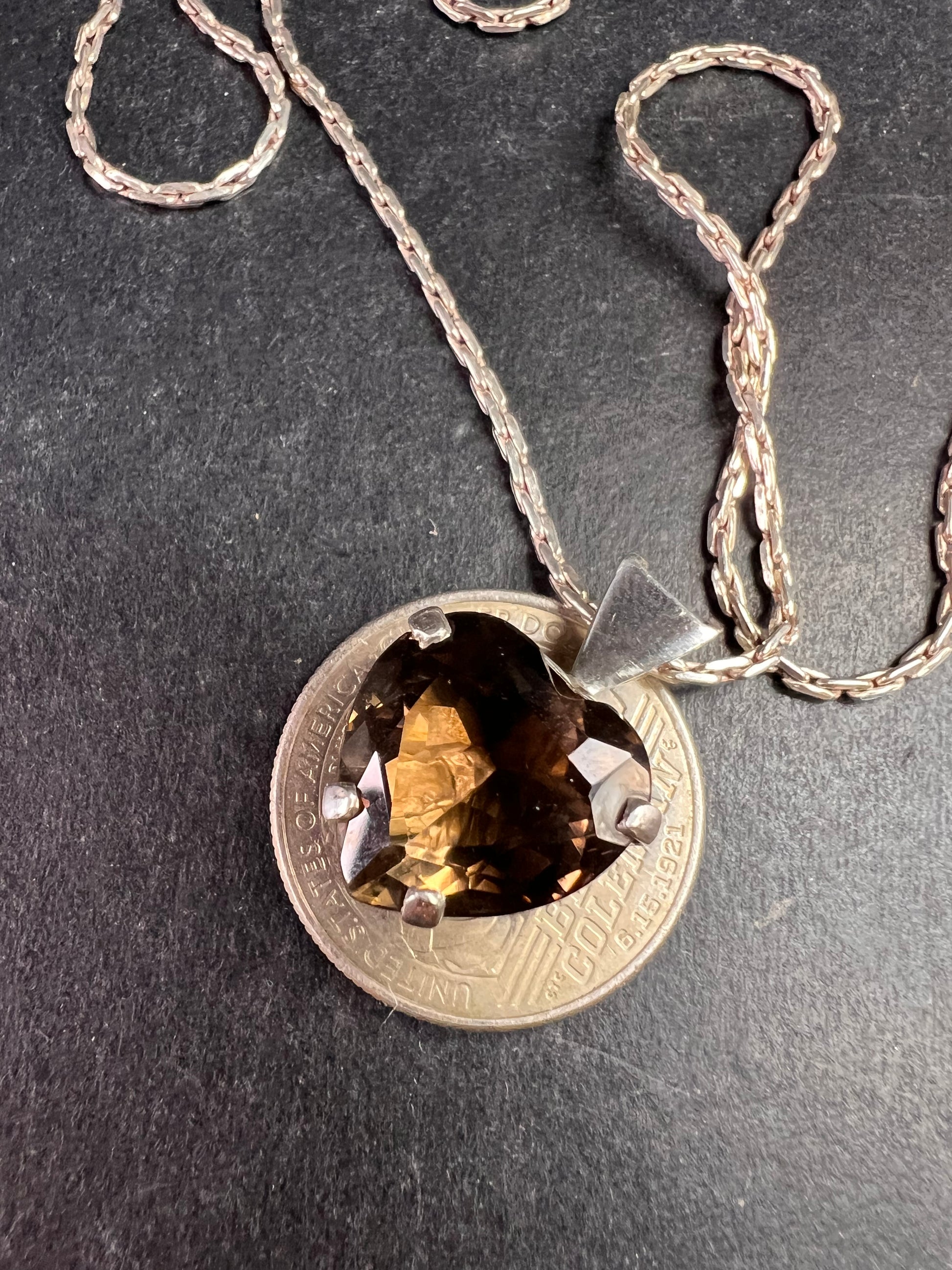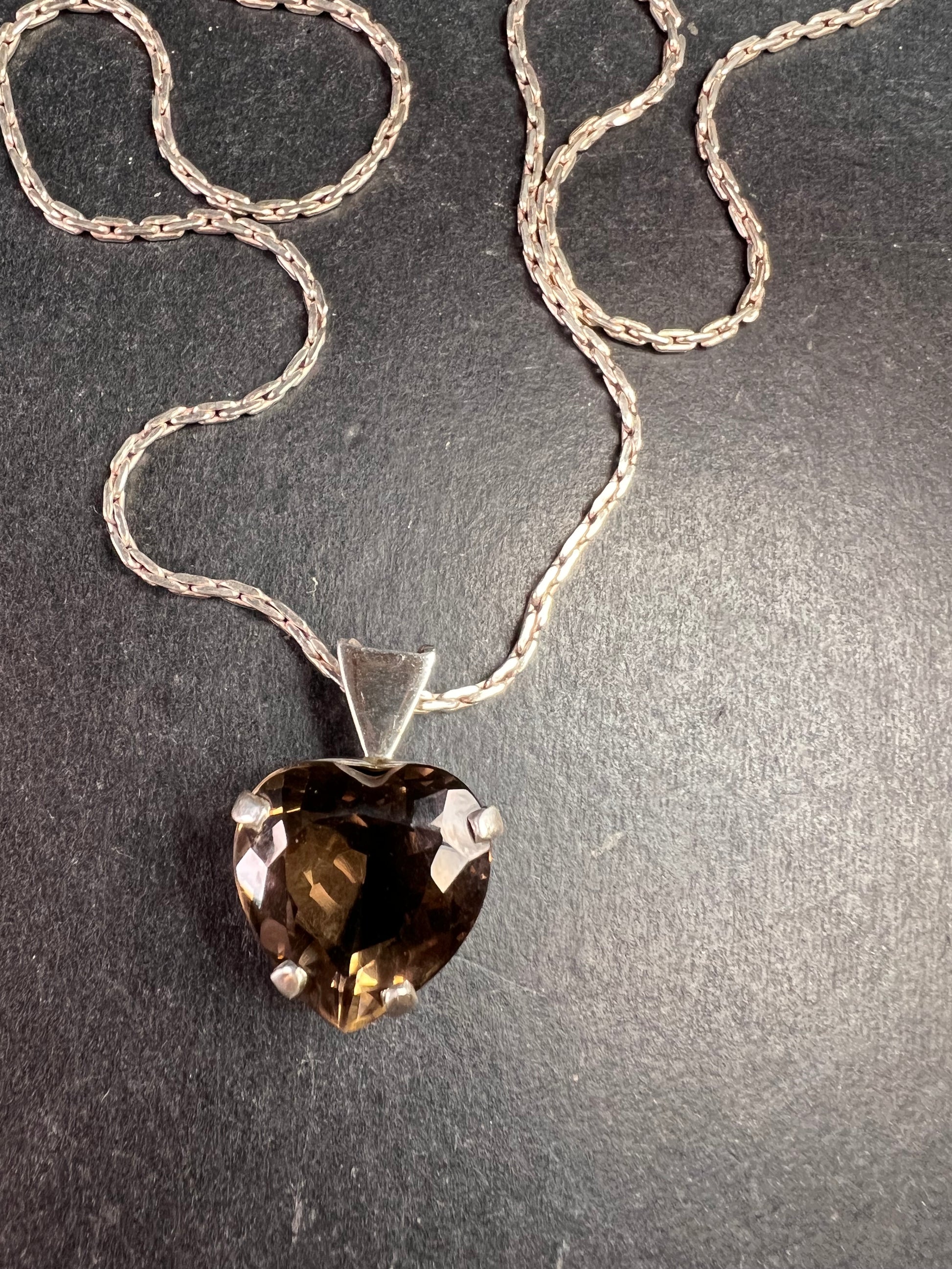 Pre-owned vintage smoky quartz heart pendant with sterling silver chain. Pendant and chain both tested and verified as genuine silver by acid test; no purity stamps present. Chain is believed to be higher silver content (approx. 950/960) based on low tarnish and matching verified 960 chains from the same lot. Smoky quartz is a natural quartz variety in deep warm brown tones, precision heart cut, prong set in a heavy open-back sterling setting with wide sculptural bail.