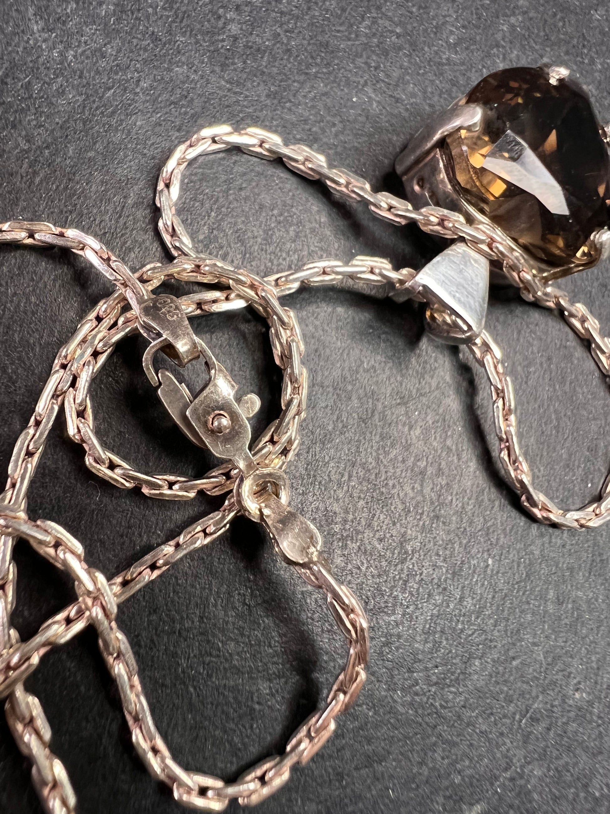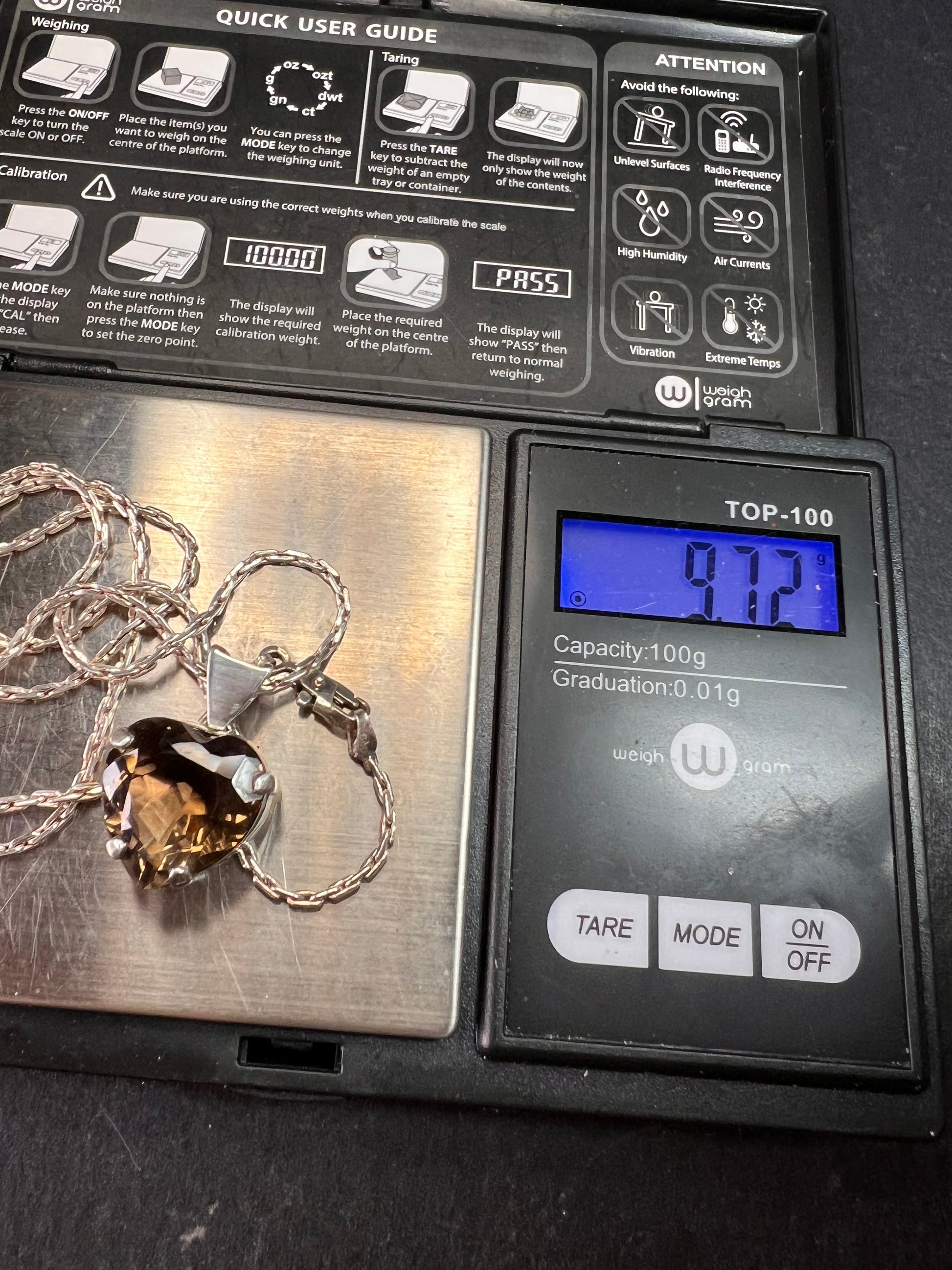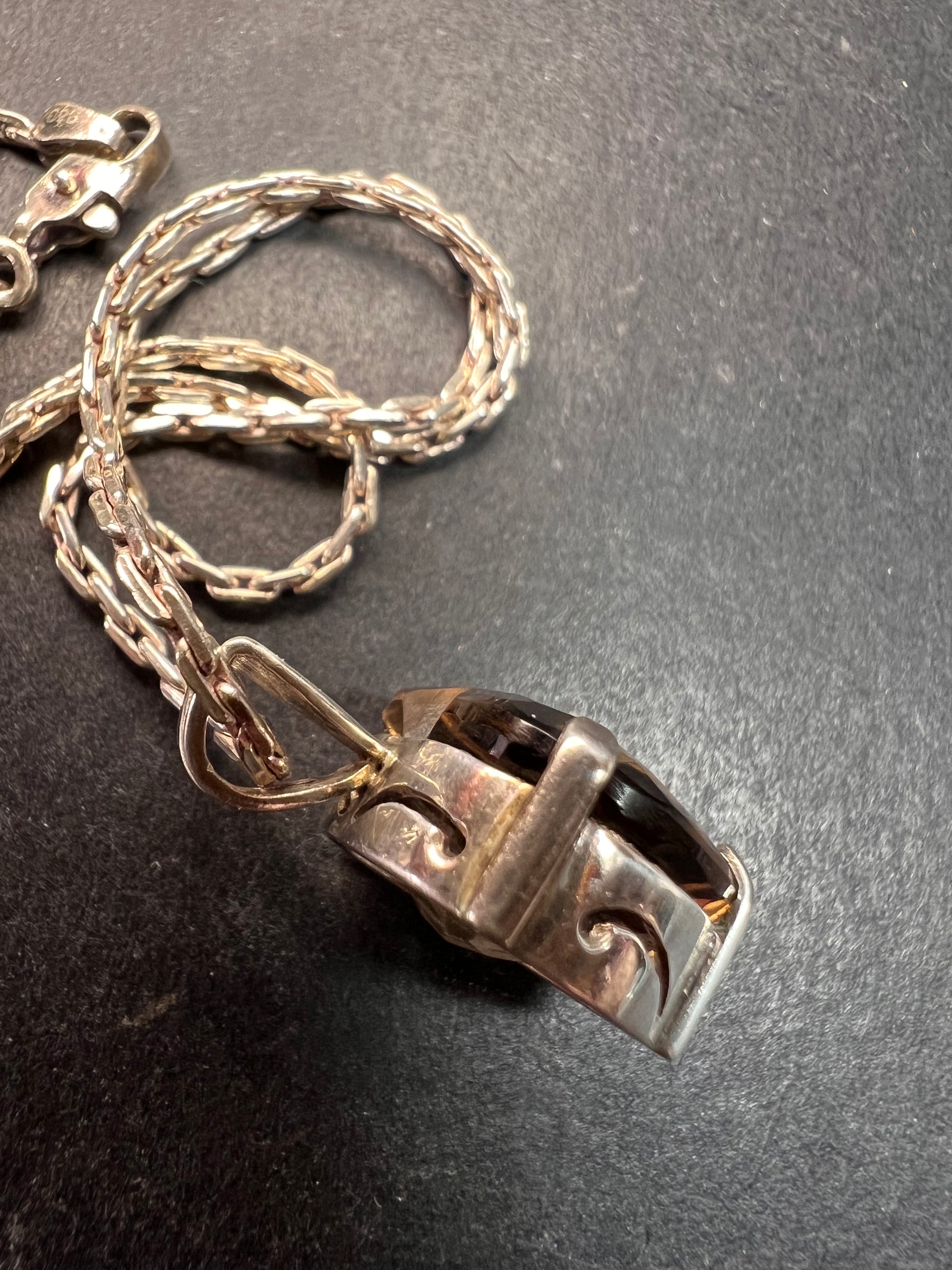Pre-owned vintage smoky quartz heart pendant with sterling silver chain. Pendant and chain both tested and verified as genuine silver by acid test; no purity stamps present. Chain is believed to be higher silver content (approx. 950/960) based on low tarnish and matching verified 960 chains from the same lot. Smoky quartz is a natural quartz variety in deep warm brown tones, precision heart cut, prong set in a heavy open-back sterling setting with wide sculptural bail.