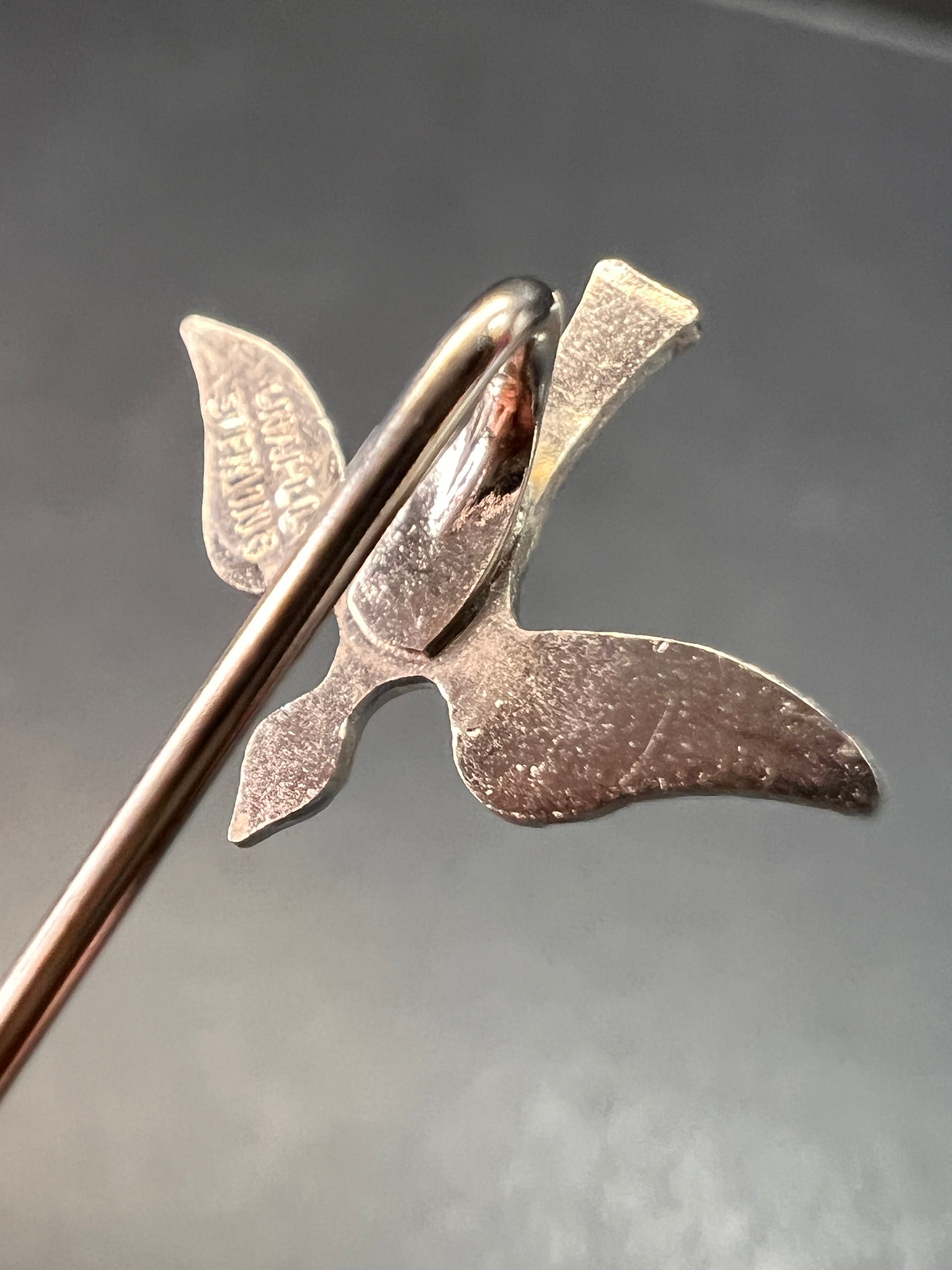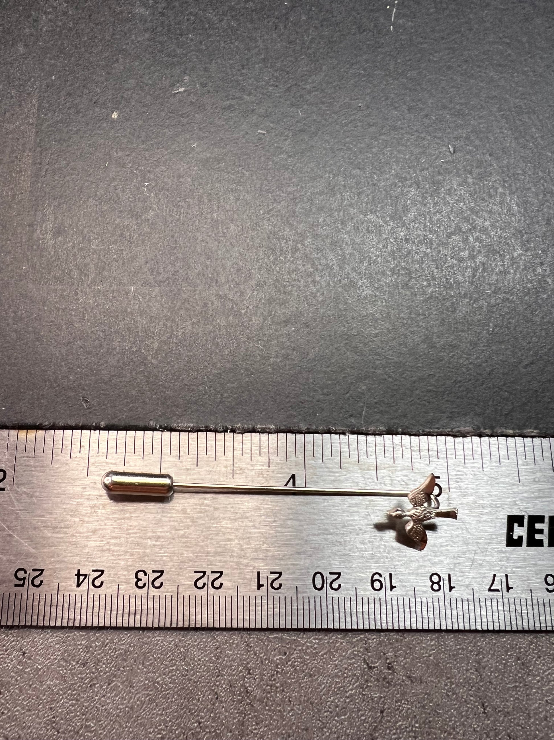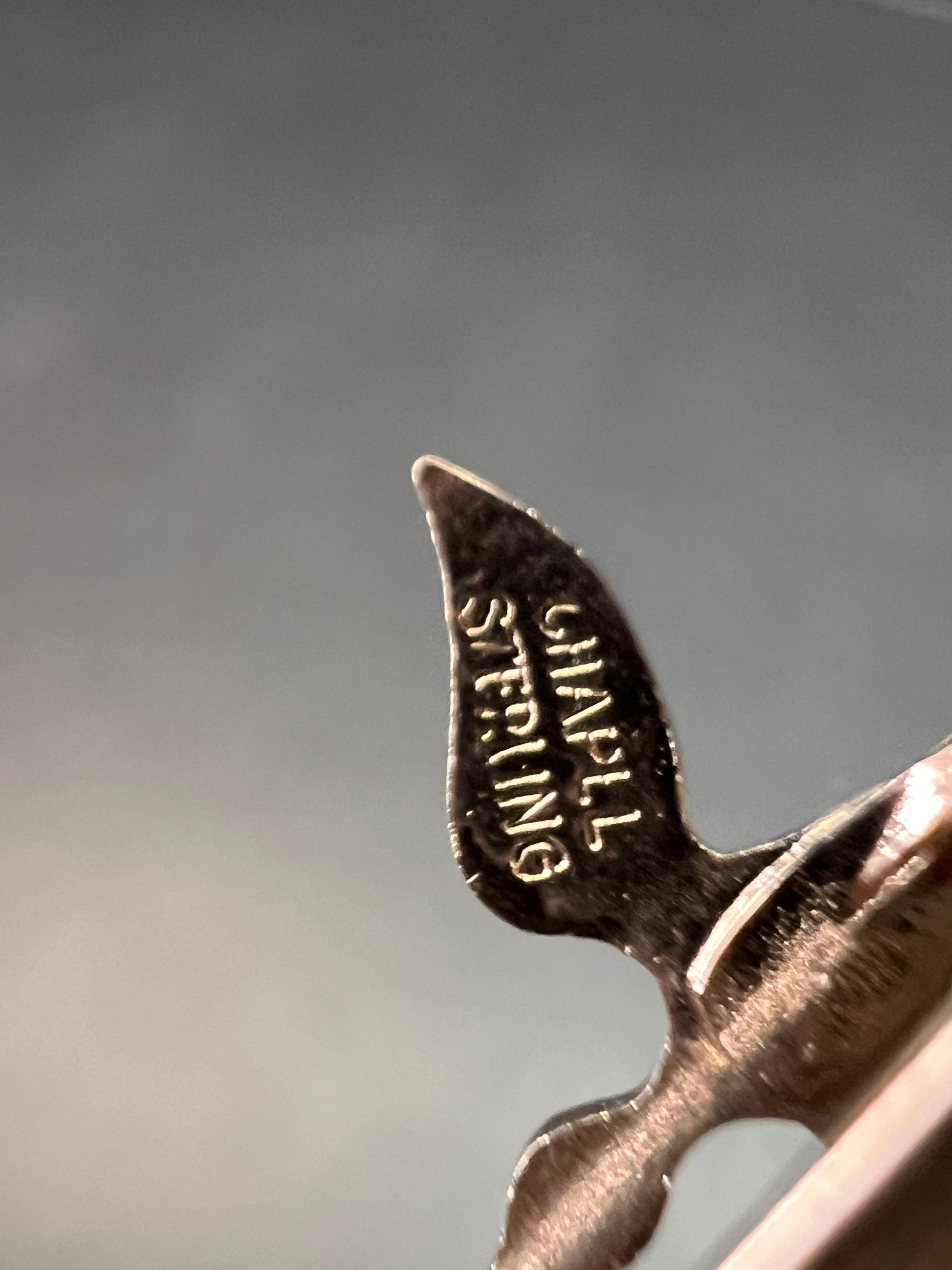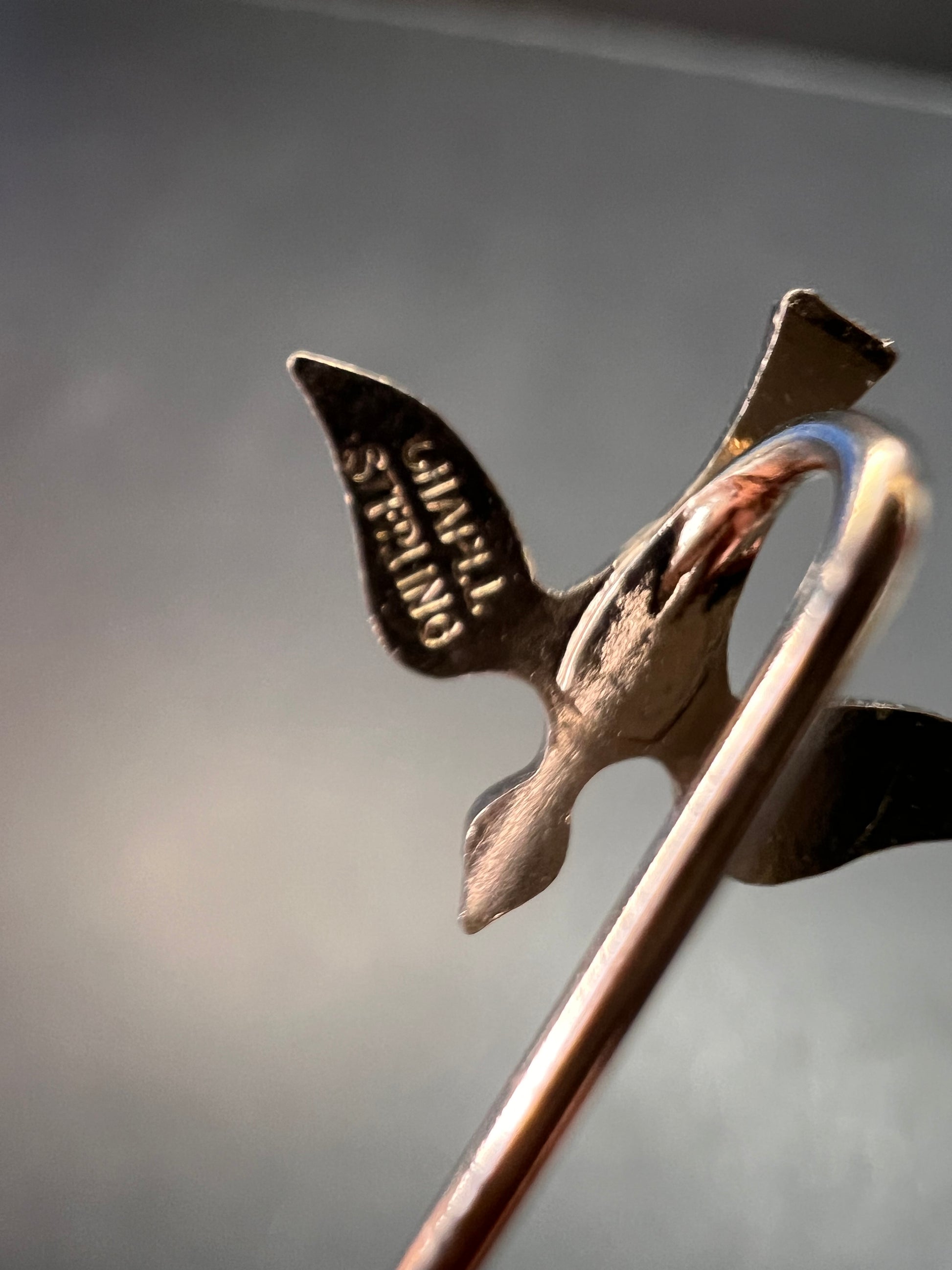 Vintage CHAPLL lapel/stick pin in sterling silver with a flying dove? I believe this was made to be a confirmation pin. I’ve also been told this is possibly a “Sweet Bird” pin for Girl Scouts where there is a ceremony for 3rd graders to "fly up" from being a brownie scout to being a full fledged Girl Scout. I can’t confirm either possibility but it is vintage and sterling silver that’s likely plated with rhodium.