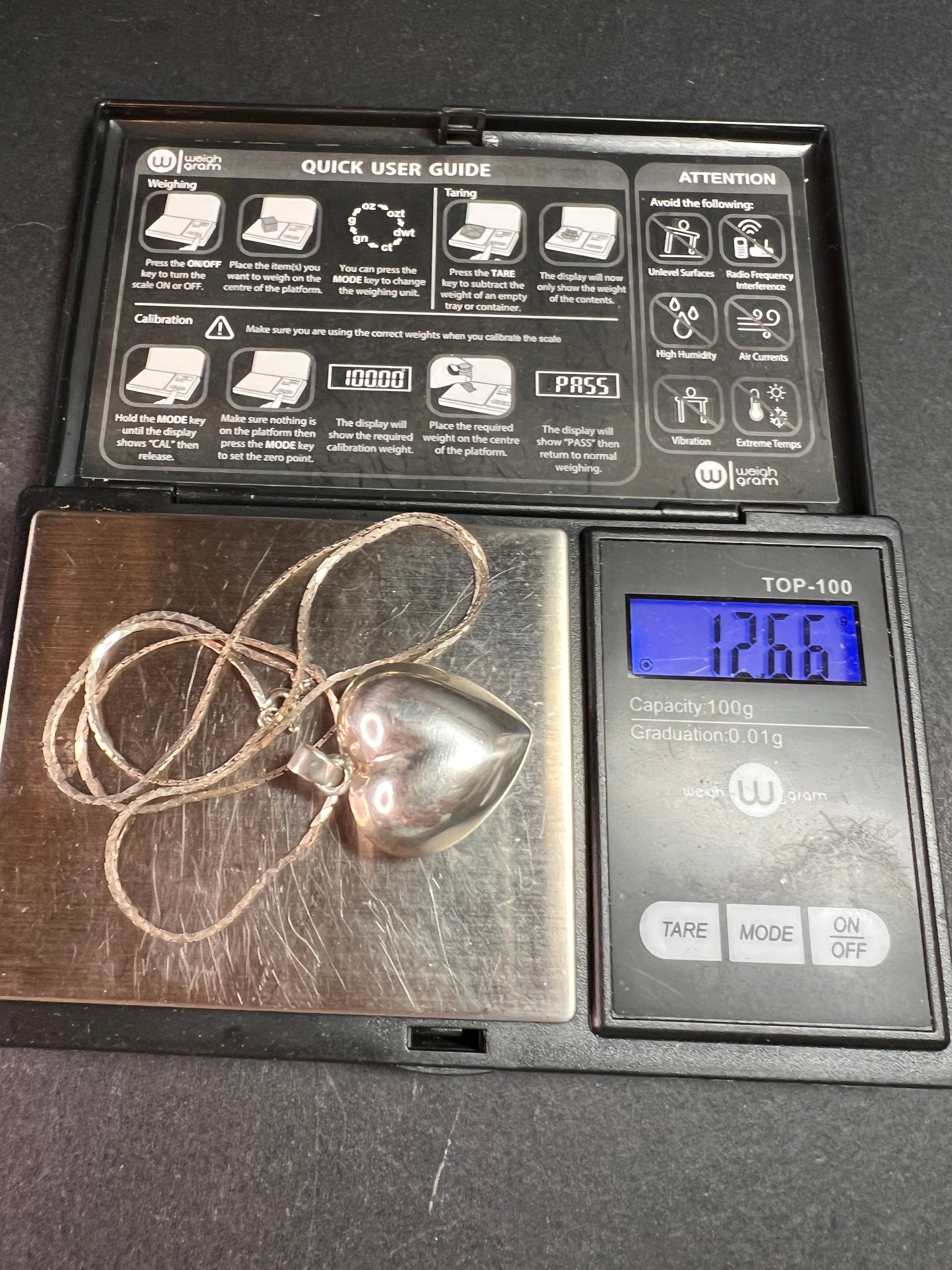 Vintage sterling silver puffy heart harmony pendant on a 20-inch diamond-cut chain. The pendant is dead stock from a metaphysical shop that closed years ago and has never been worn. It features a smooth domed shape with a gentle chime when it moves, similar to an angel caller or harmony ball. The pendant is unmarked with no 925 stamp, so it has been acid tested for sterling purity. It measures just under 1.75 inches including the bail and has a classic late-80s to early-2000s style. The chain is vintage but not original to the pendant, stamped 925, and has a bright diamond-cut flat link design that reflects the light beautifully. Total weight of pendant and chain together is 12.66 grams. Light surface marks from long storage are present, adding to its vintage character while still wearing beautifully.