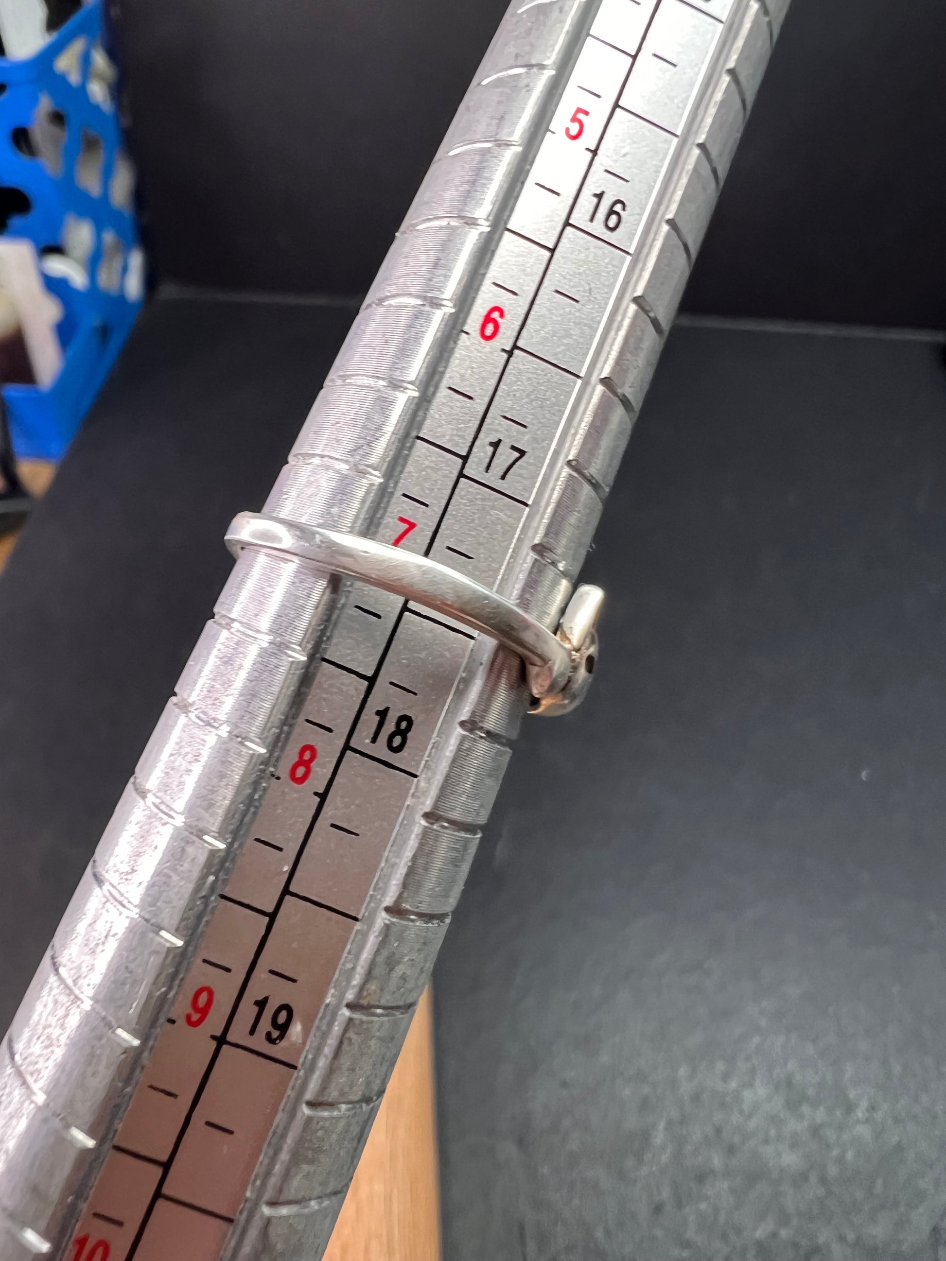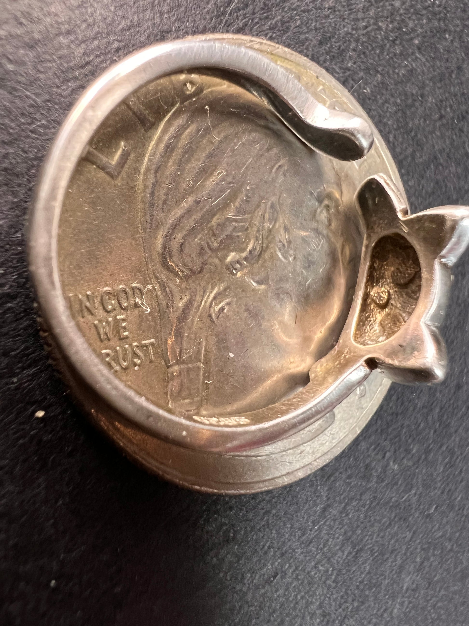 This adorable sterling silver cat ring dates to the late 1980s–early 2000s and features a solid-cast peeking cat design with cutout eyes. It’s stamped 925 and weighs 1.72 grams, with a comfortable size 7 fit and an adjustable open band. The ring has that charming older silver character and a handmade feel that modern versions don’t. A collectible piece for cat lovers and vintage jewelry fans alike.