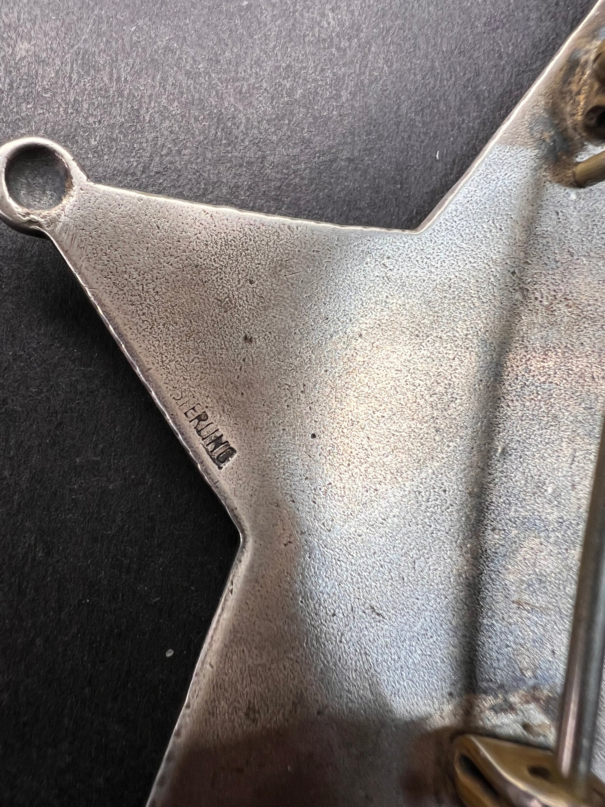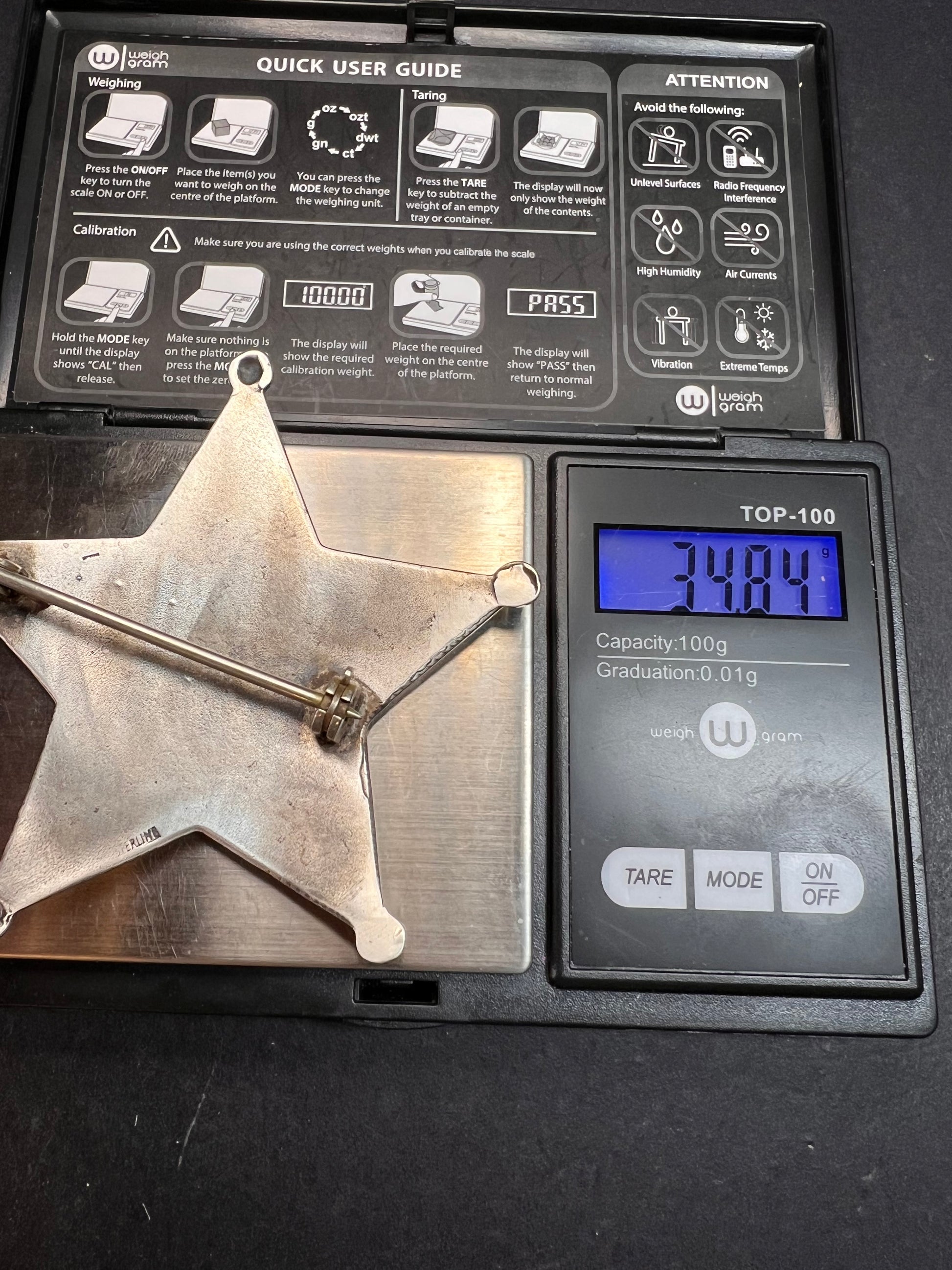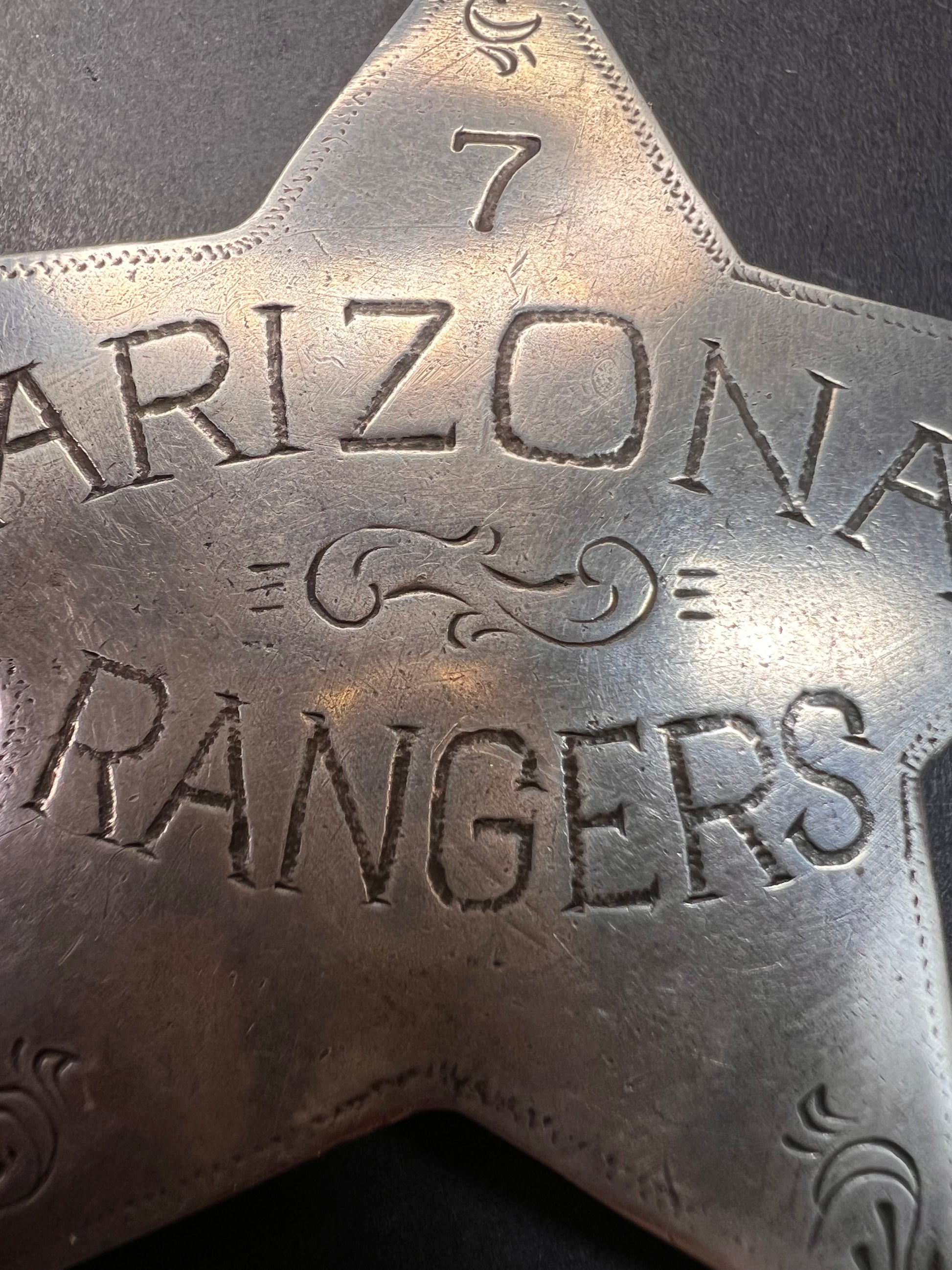 This is truly a RARE Arizona Rangers badge made of sterling silver. Stamped STERLING on the back and acid tested to verify purity. Weighs almost 35 grams. I’ve found no more of these badges made with sterling silver. Only pewter and other metals.