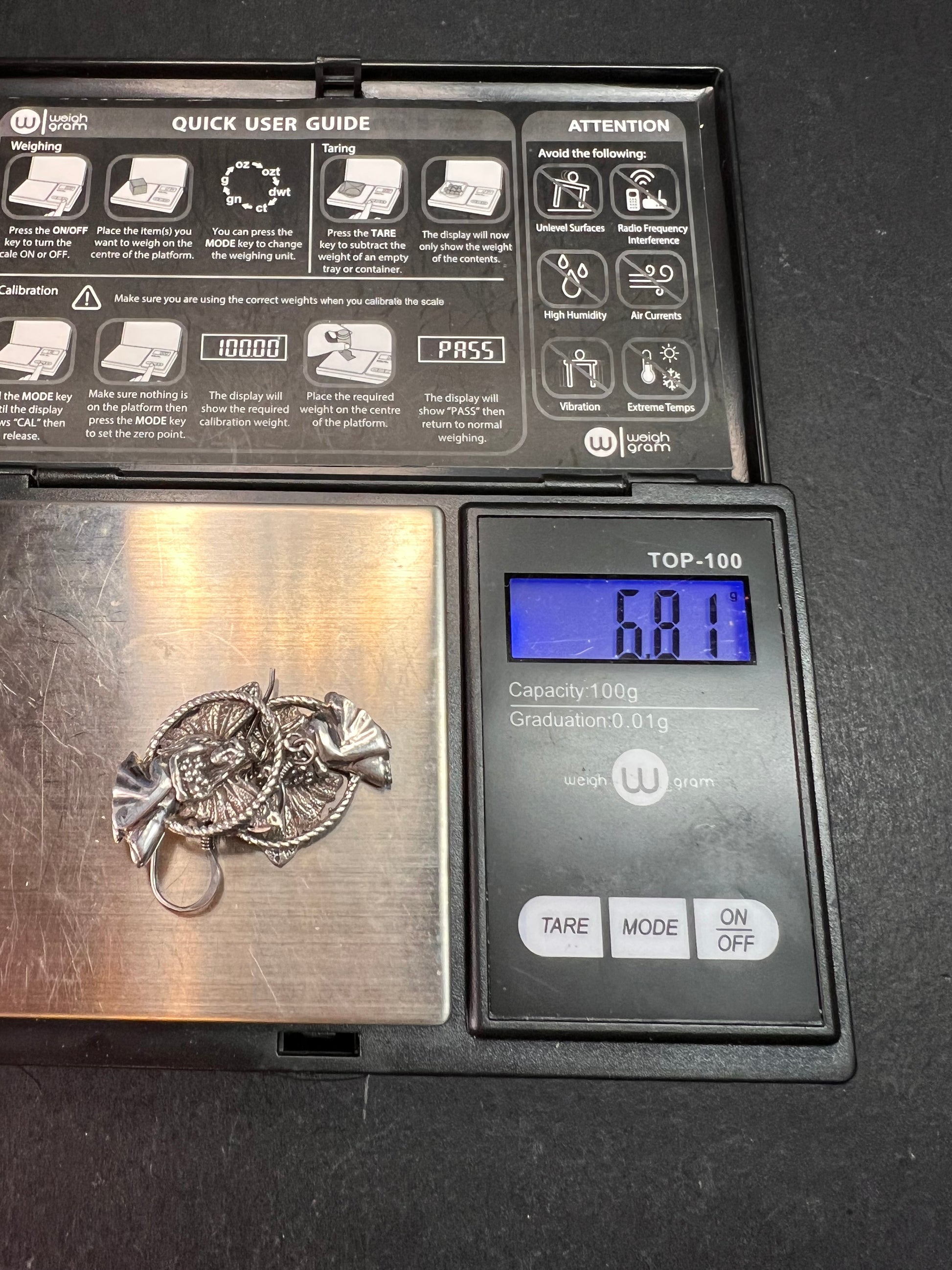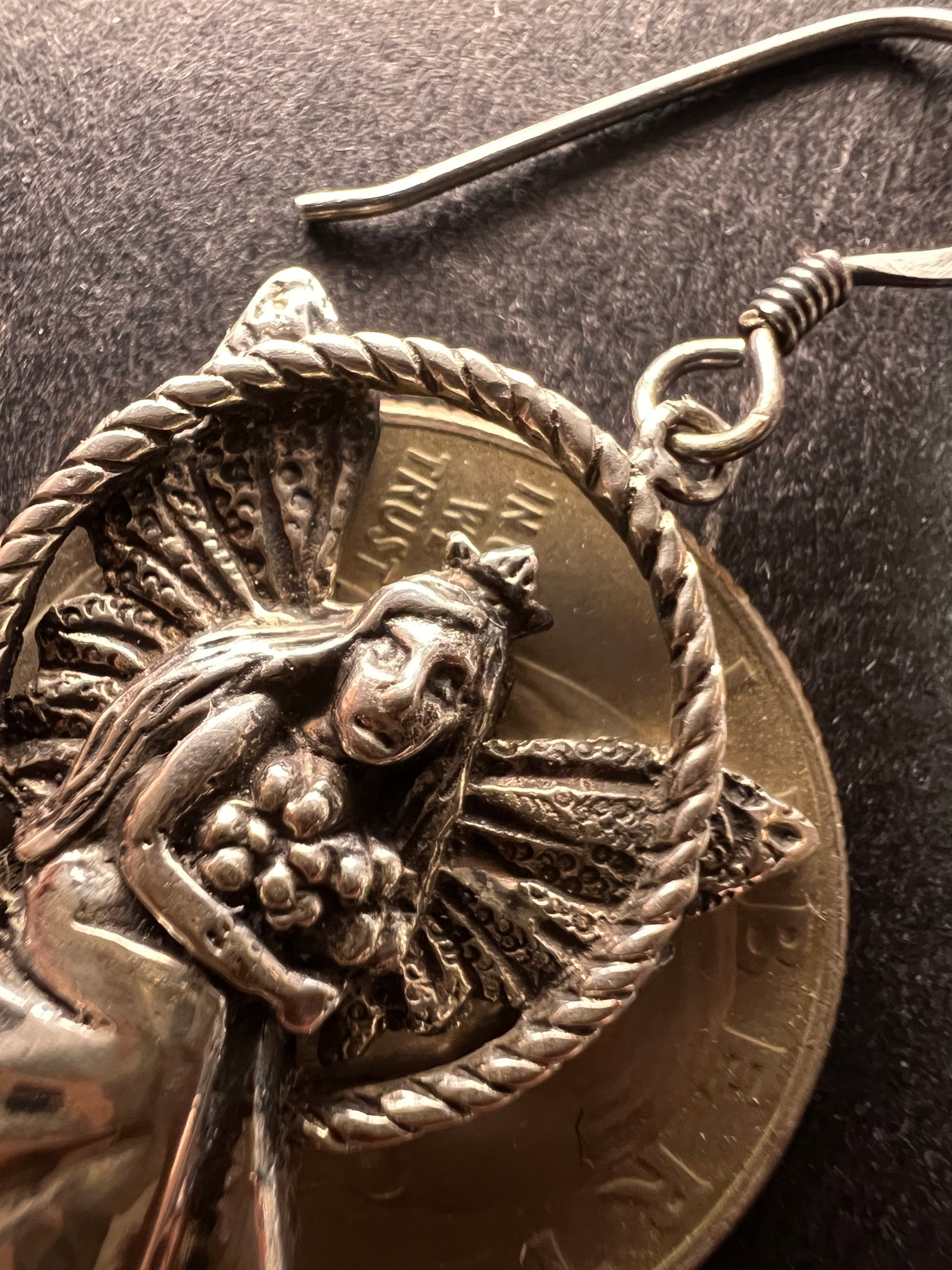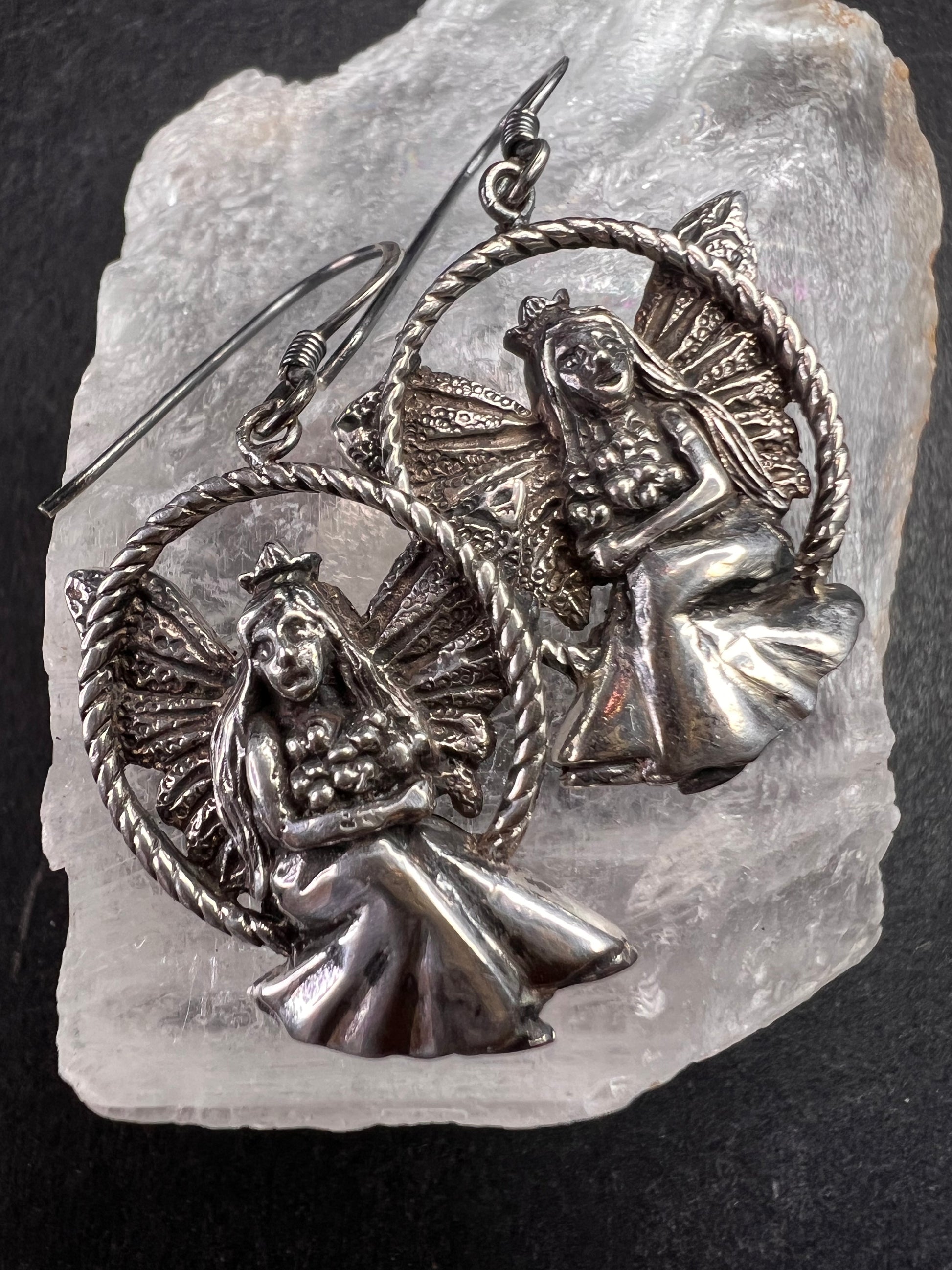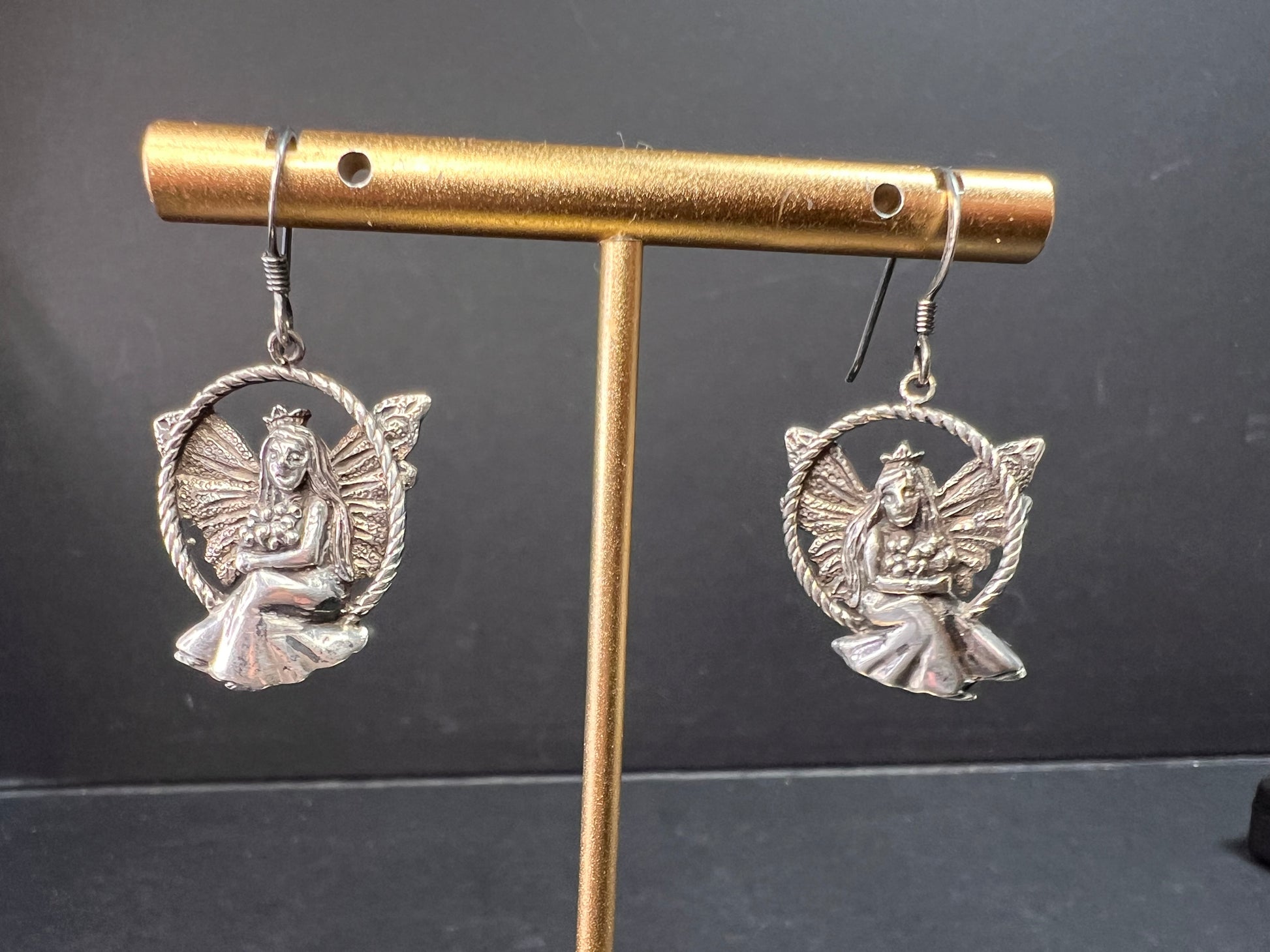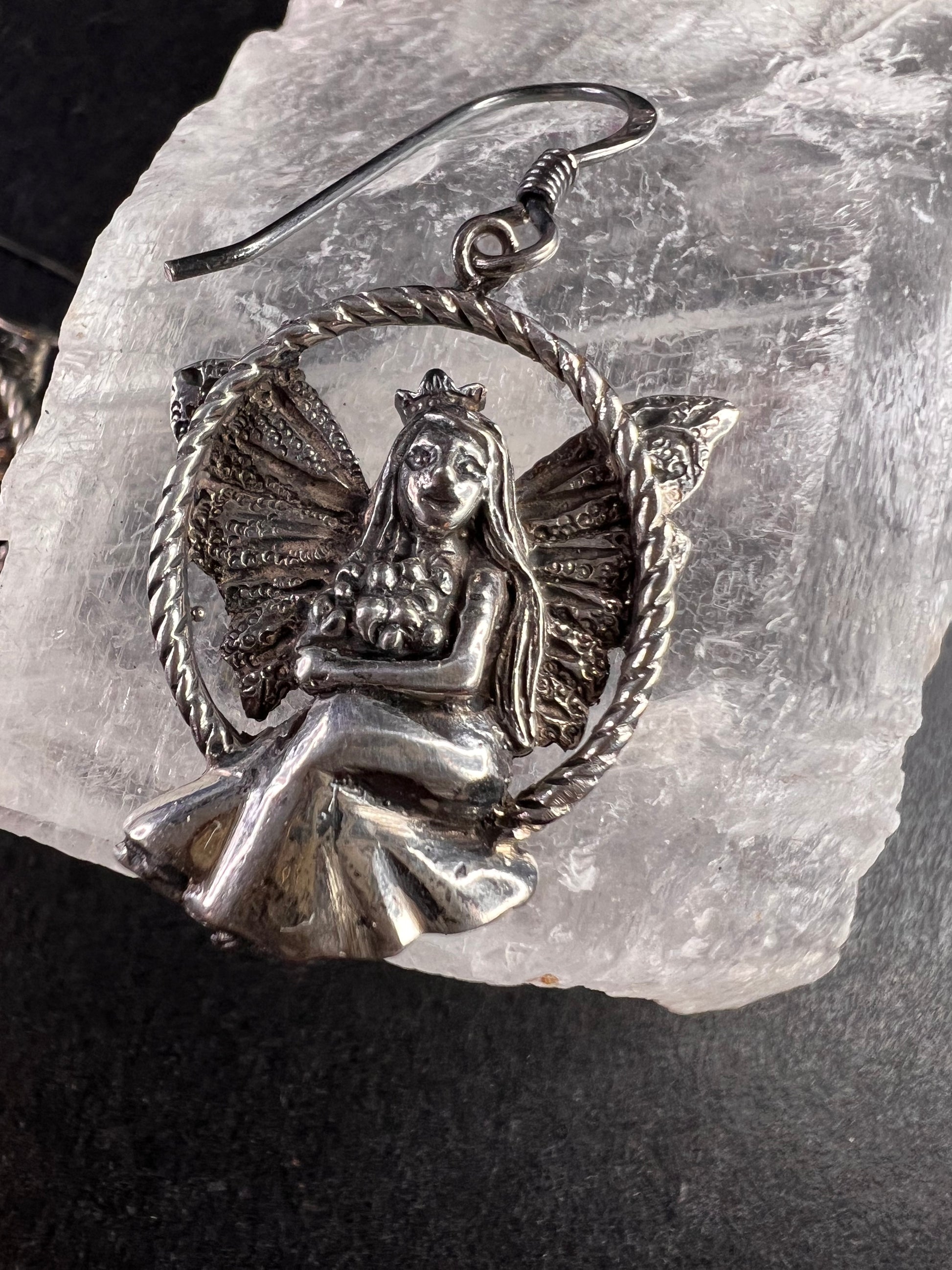 Pre owned vintage sterling silver fairy earrings with beautiful detail throughout. Each earring features a seated fairy holding a bundle of flowers, framed in a twisted rope circle with textured butterfly-style wings. The ear wires are stamped 925 and the bodies have been acid-tested and verified sterling silver. These came from old dead-stock inventory originally sourced from a closed metaphysical shop. They measure about 1.75 inches long including the hooks and roughly 1 inch wide. Total weight for the pair is 6.01 grams. A charming vintage find with a whimsical fantasy feel—perfect for fairy, goddess, or metaphysical jewelry collectors.