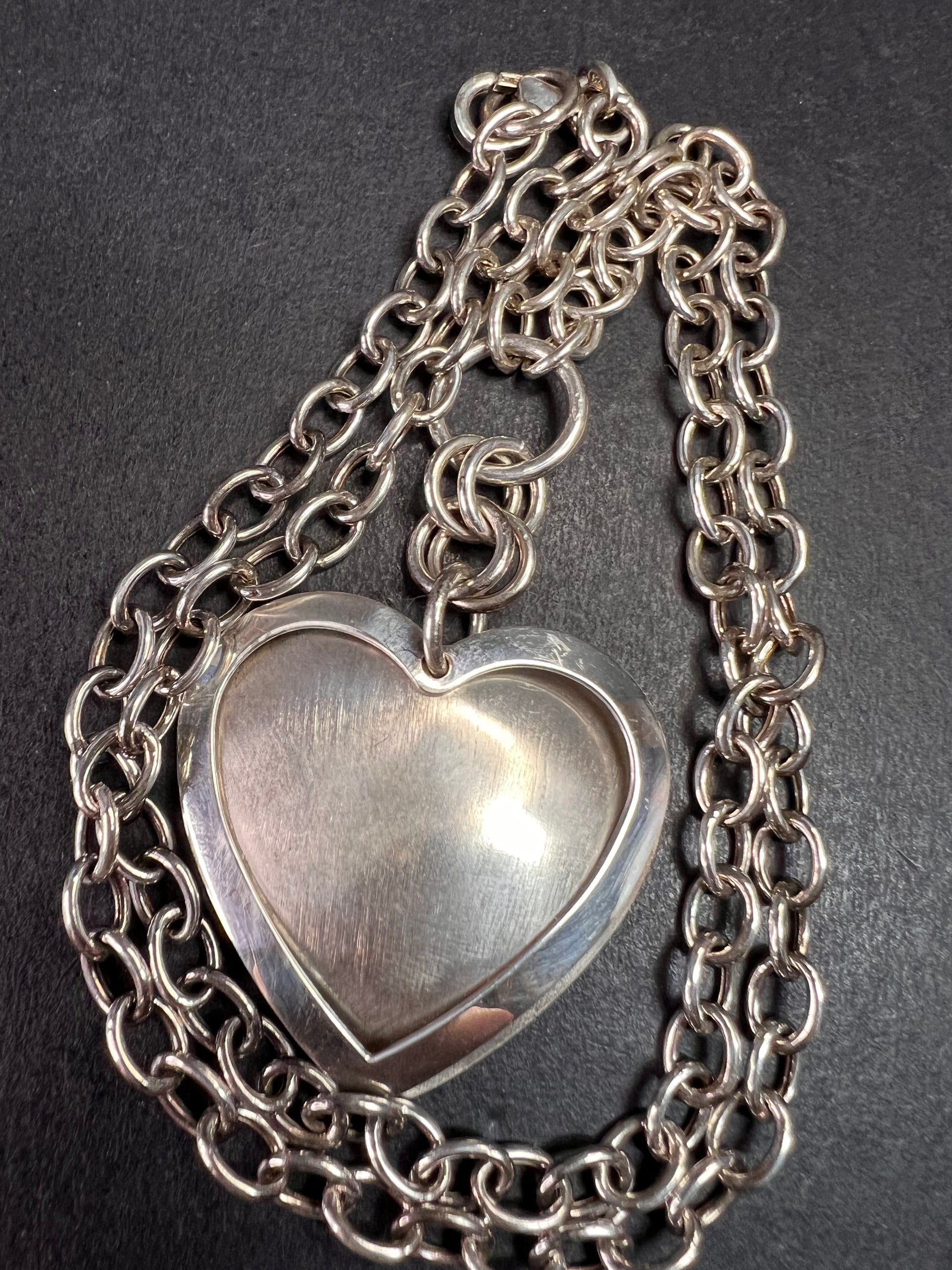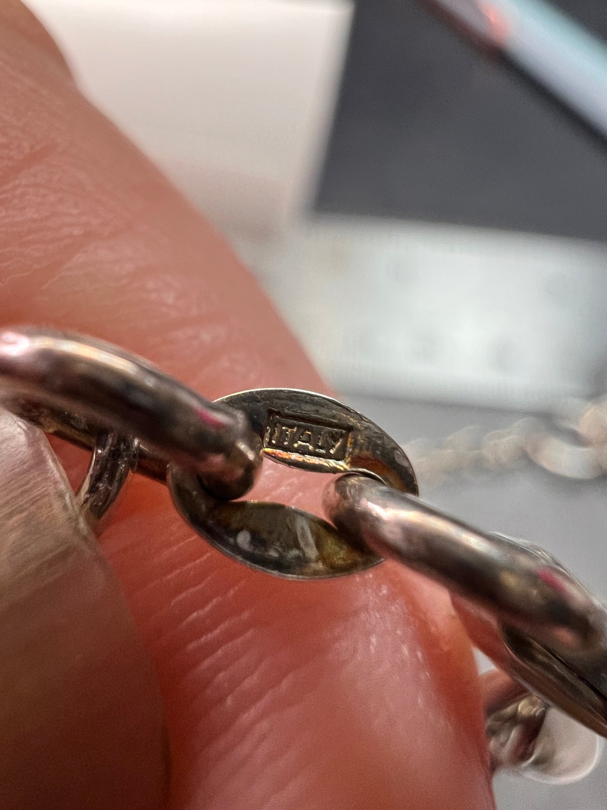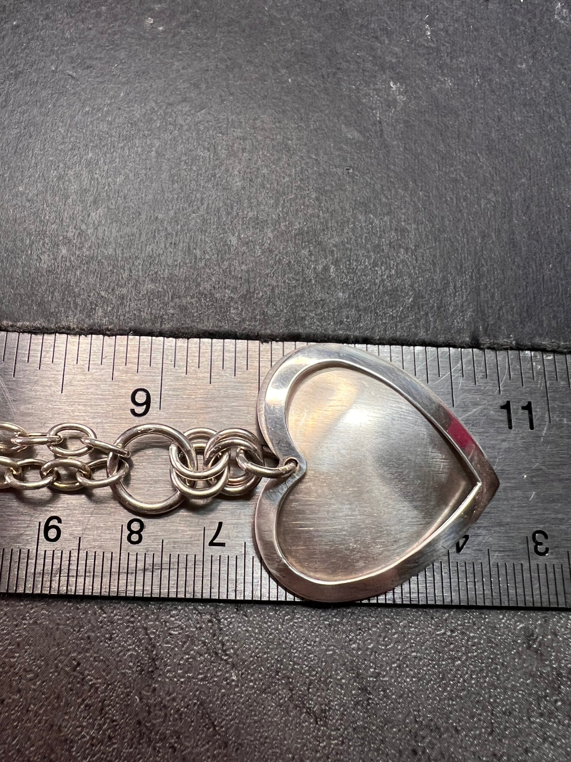 Authentic 925 sterling silver heart with a second framed heart overtop hung from a sterling silver cable chain with a lobster clasp. Measures about 18 inches in length. Unrecognized hallmark. Purity stamp is on clasp and another on chain towards the clasp. Made in Italy. Acid tested for purity verification. Total weight is 12.11 grams.