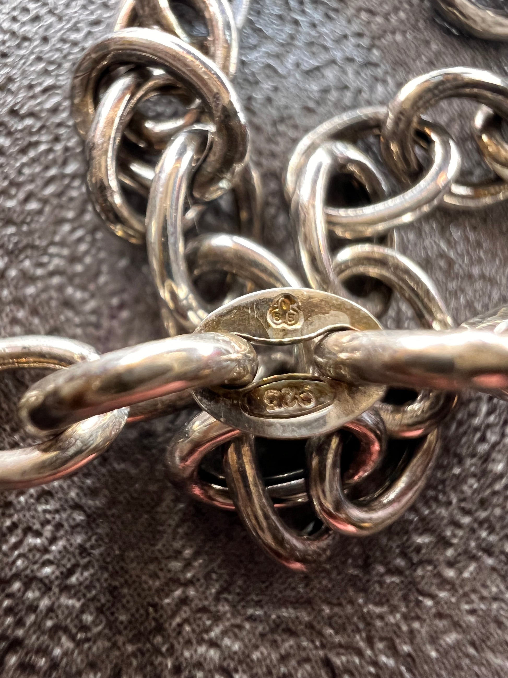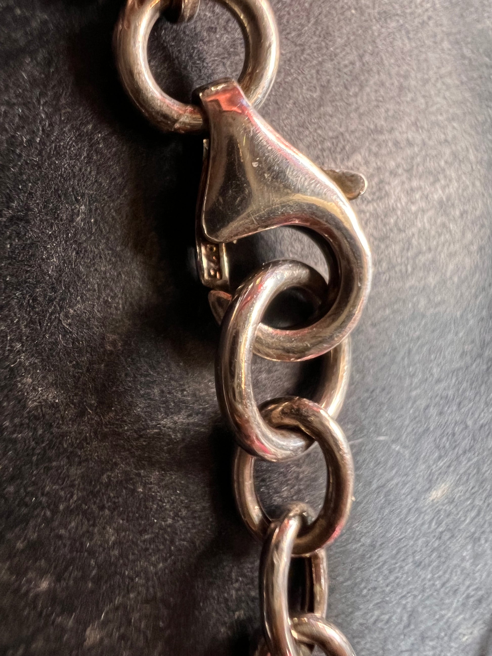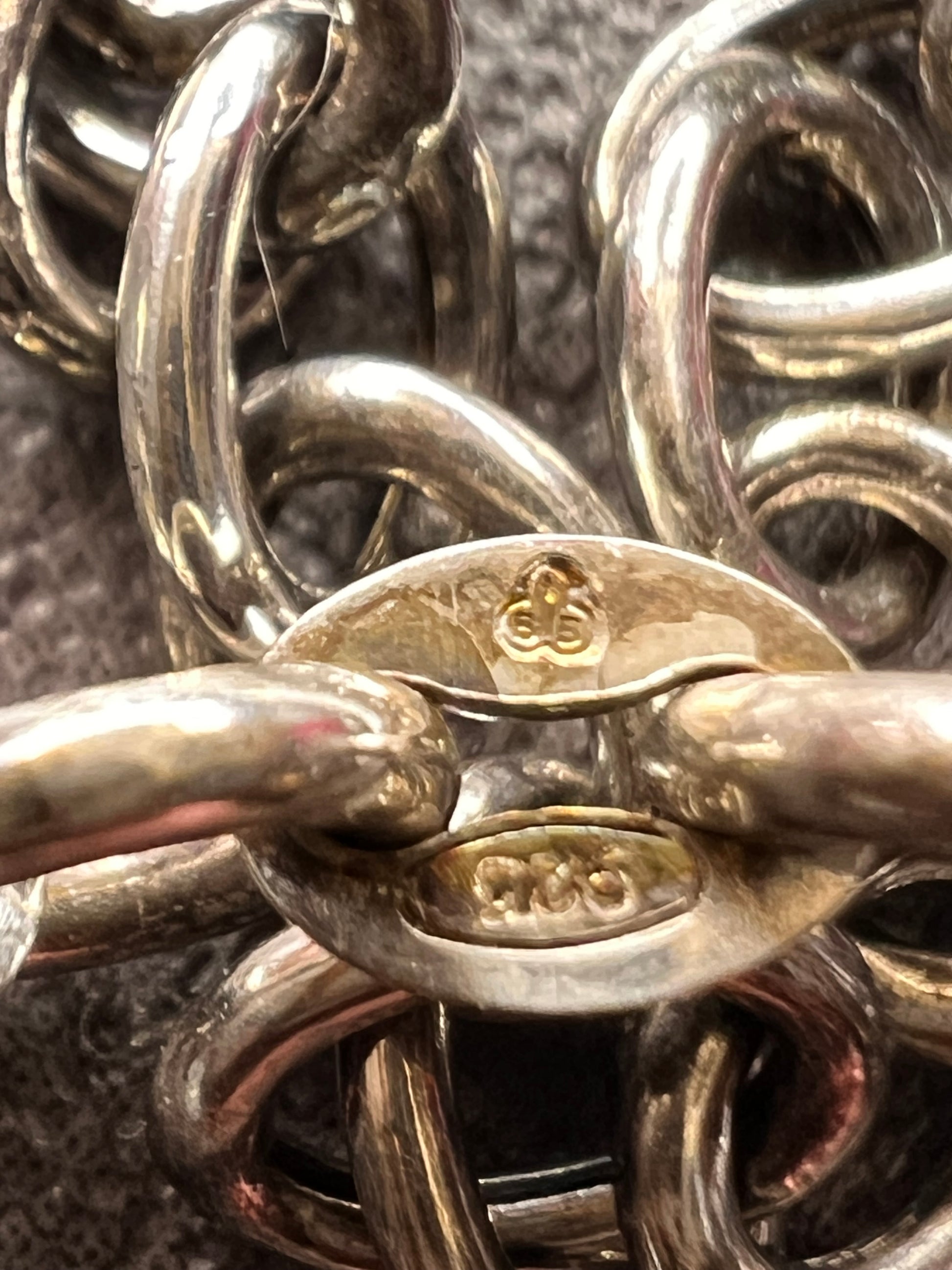 Authentic 925 sterling silver heart with a second framed heart overtop hung from a sterling silver cable chain with a lobster clasp. Measures about 18 inches in length. Unrecognized hallmark. Purity stamp is on clasp and another on chain towards the clasp. Made in Italy. Acid tested for purity verification. Total weight is 12.11 grams.