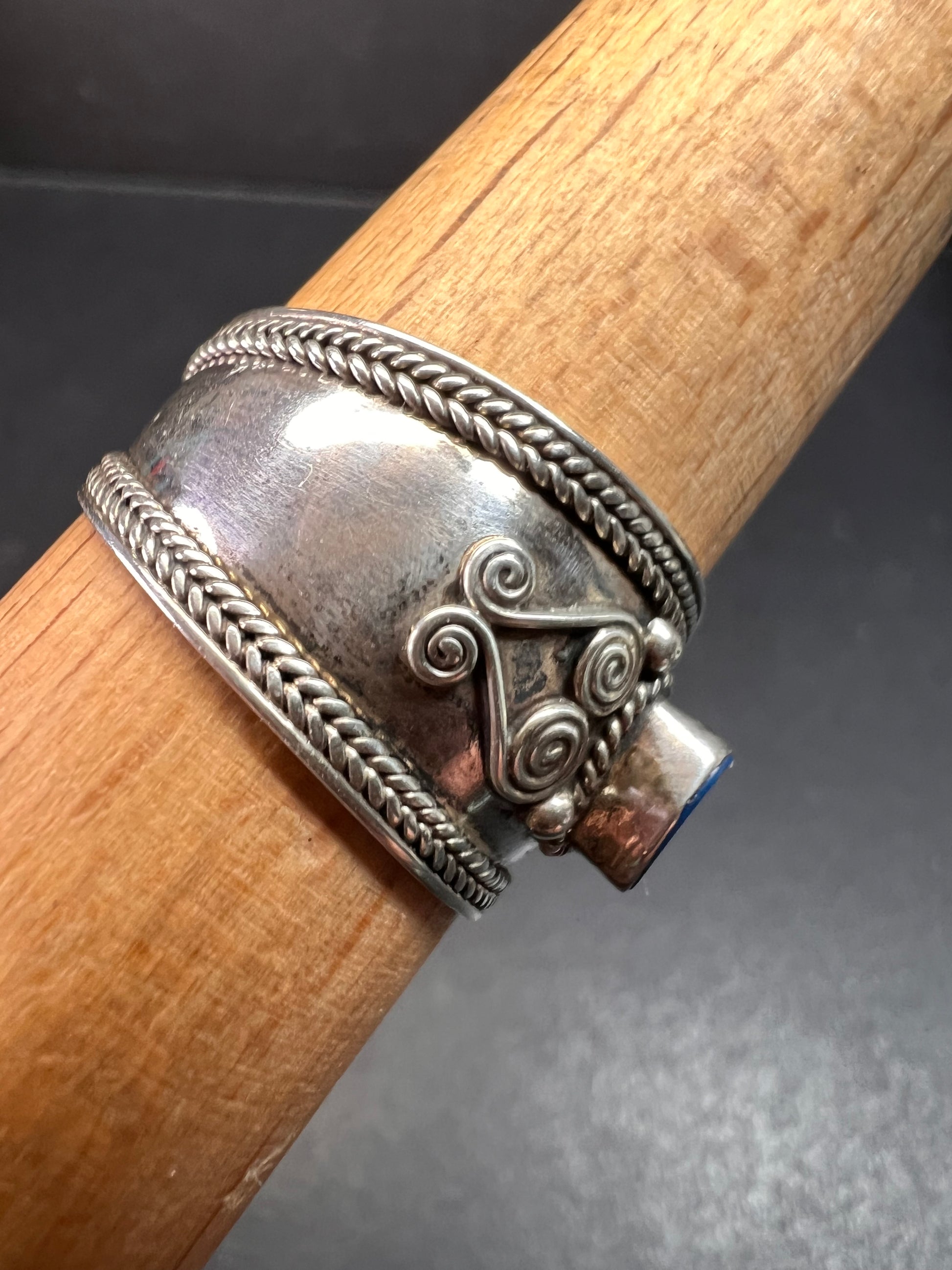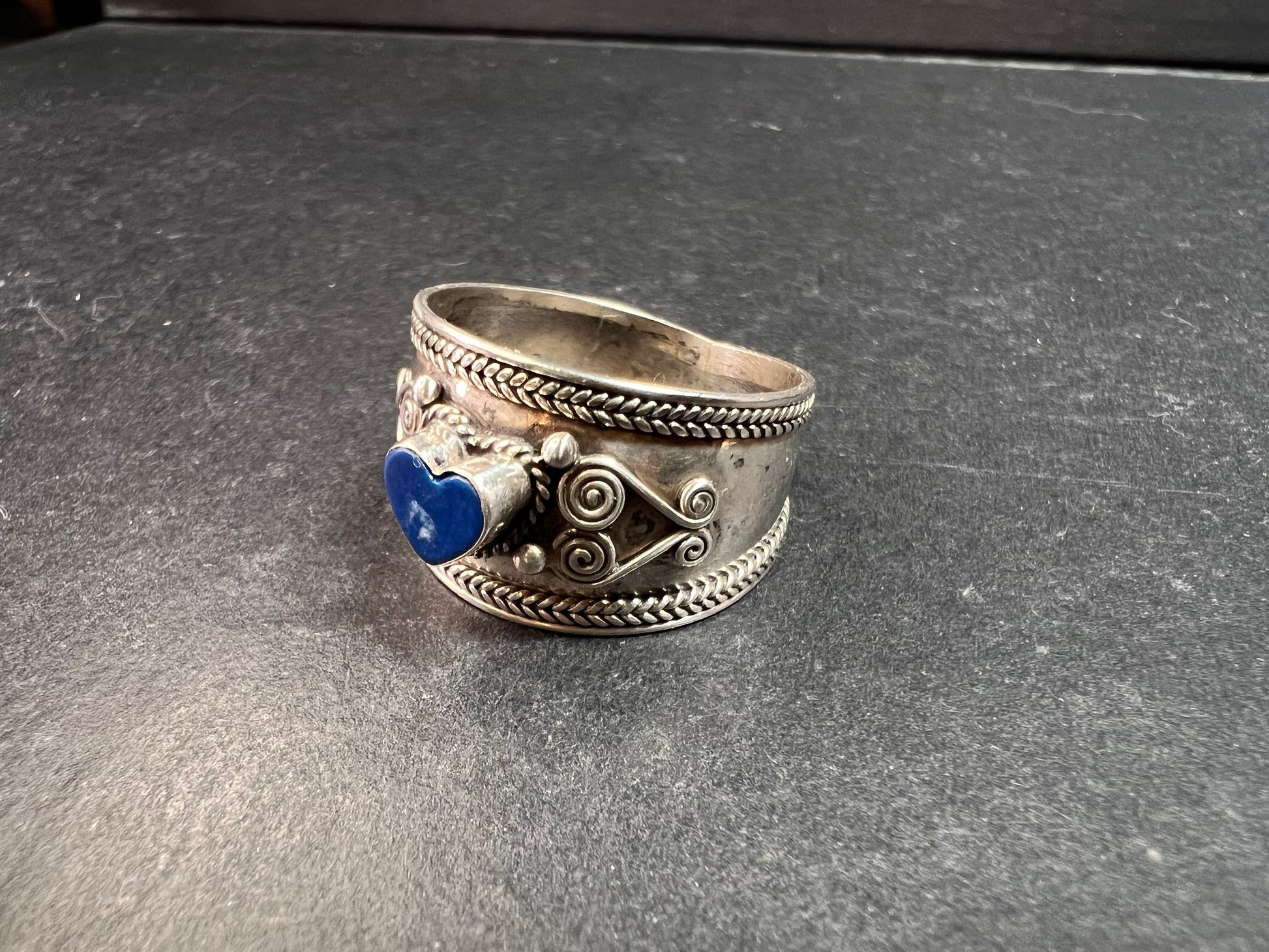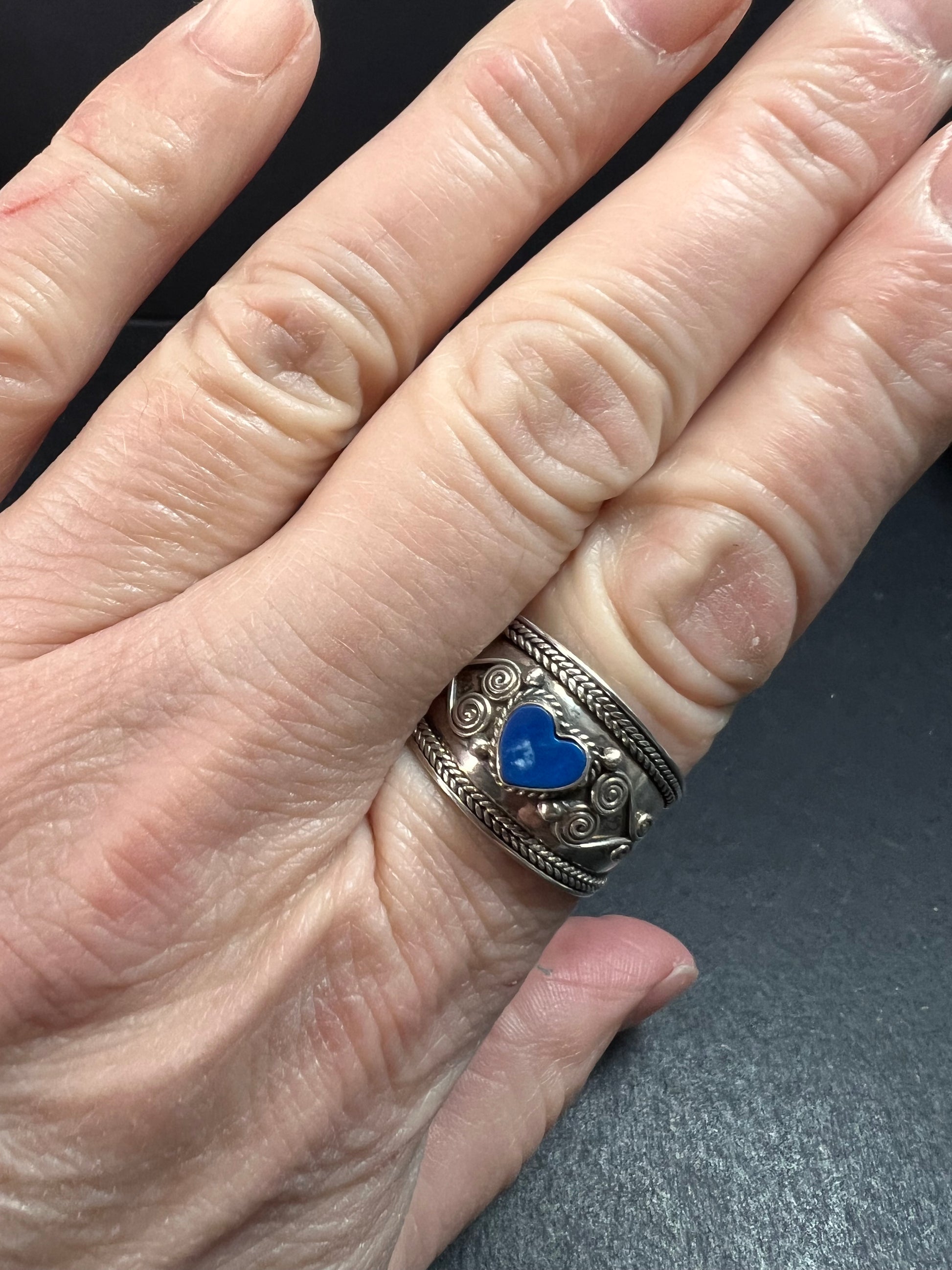 This vintage Indonesian sterling silver ring features detailed Bali-style scrollwork and a bright blue heart-shaped stone, likely dyed howlite or magnesite. The wide band is decorated with double rope borders and hand-applied swirls for a bold boho look. This piece is dead stock, sourced from a metaphysical shop that closed a couple decades ago and was never previously worn. No 925 stamp was found, so the silver has been acid tested and verified. Fits as a size 10–10.25 on the mandrel. Weight: 3.22 grams. A beautiful mid-90s to early-2000s artisan design with great presence.