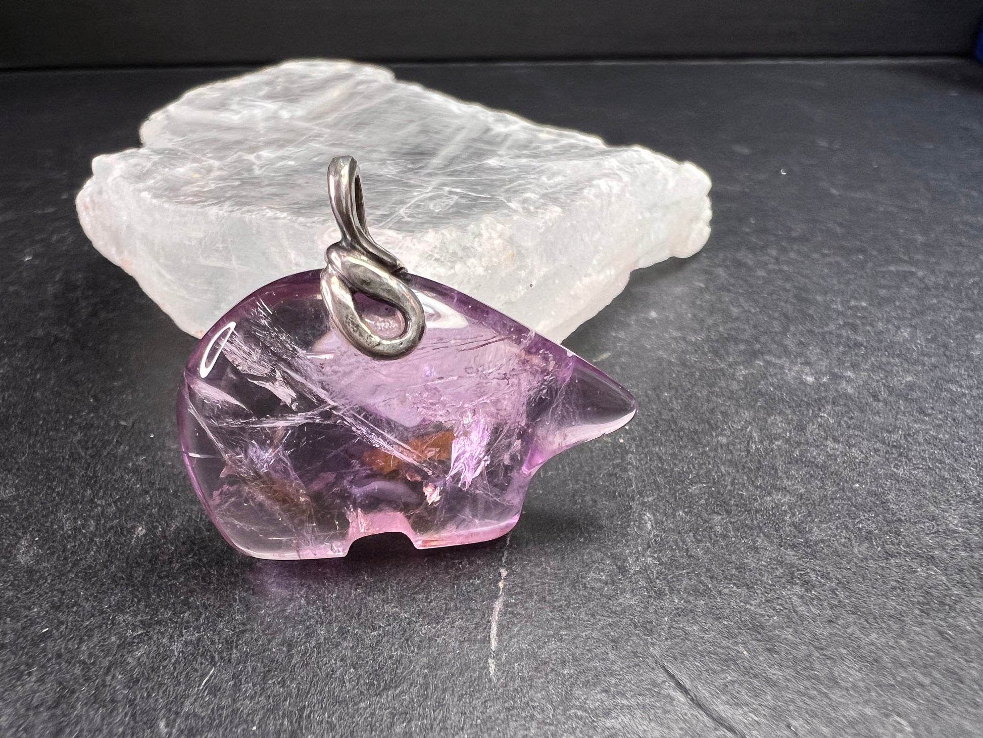 Vintage natural amethyst bear pendant set with a genuine sterling silver bail. The silver is unmarked but has been professionally acid tested and verified as sterling silver (.925). The carved amethyst displays beautiful lavender-to-deep purple tones with natural internal inclusions visible throughout the stone. Pendant measures approximately 1 inch tall including the bail (see ruler photos for exact scale) and weighs 7.16 grams. The bear carving symbolizes strength, protection, and grounding energy, making this both a wearable statement piece and a powerful metaphysical talisman. Estate-acquired and gently pre-owned with no chips or cracks noted. Pendant only; chain not included.