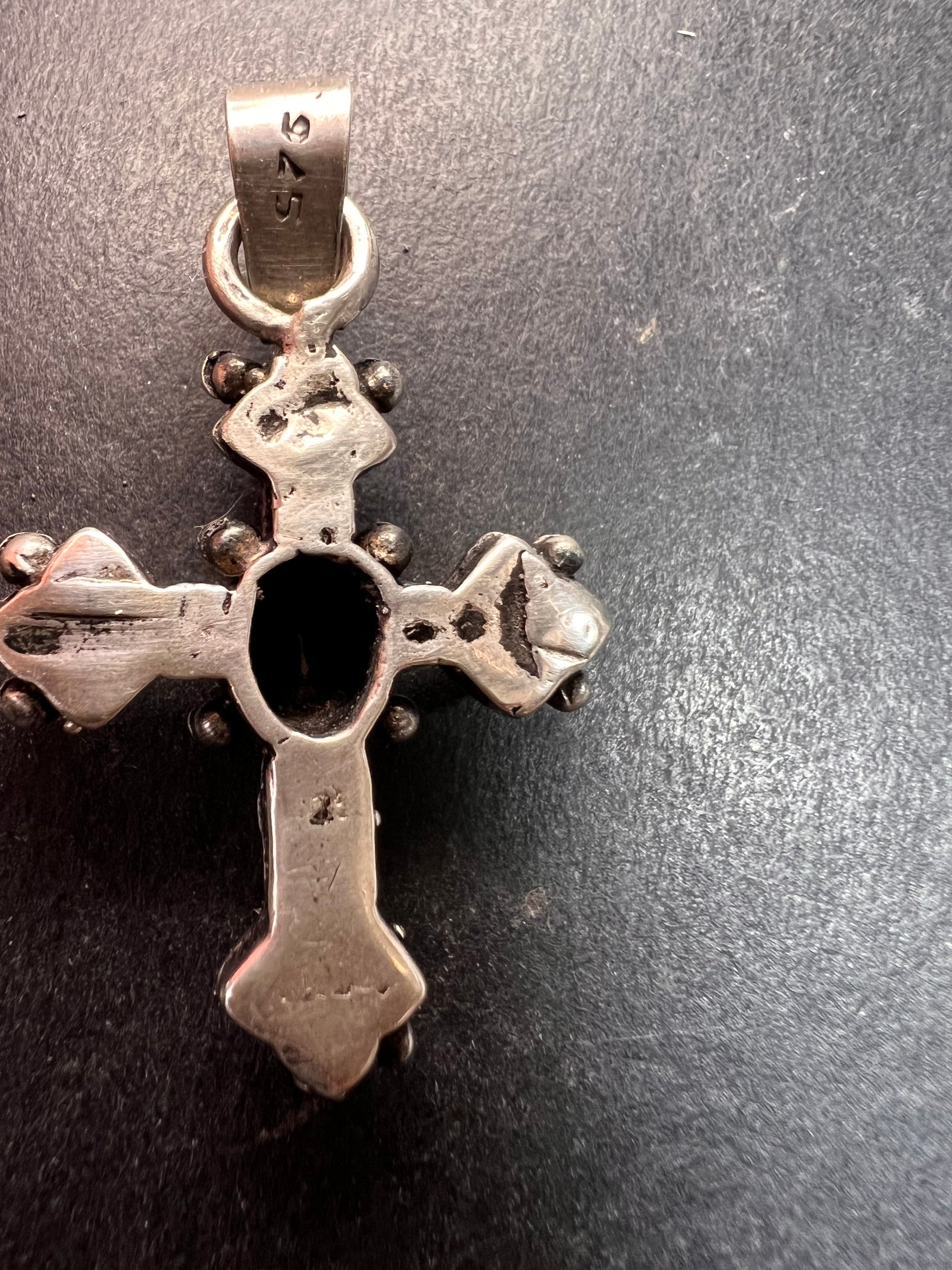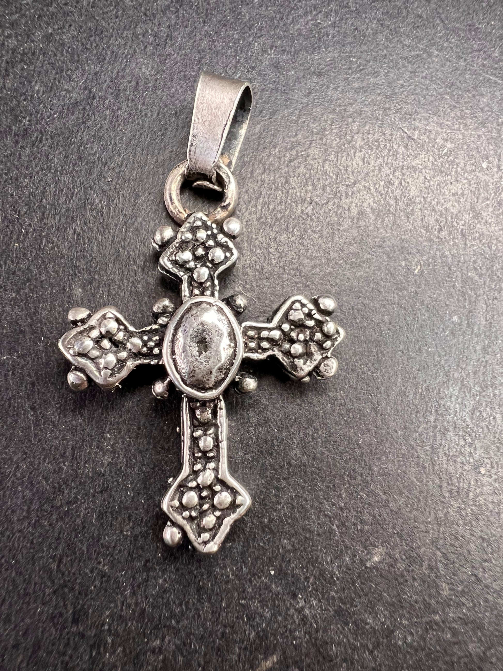 Vintage sterling silver cross pendant featuring an ornate dotted design with a smooth oval center accent that appears to be solid silver rather than a separate stone. The pendant has a classic handcrafted look with a substantial folded bail and is stamped “S45” on the bail. Based on construction and style, this piece dates to the late mid-century to early modern era, circa 1970s–1990s. Weight is approximately 4.27 grams. Measurements are shown in the photos and measure about 1.25” tall (not including bail) by about 1” wide. Pre-owned vintage condition with normal light surface wear and patina consistent with age. A great statement cross for everyday wear or layering.