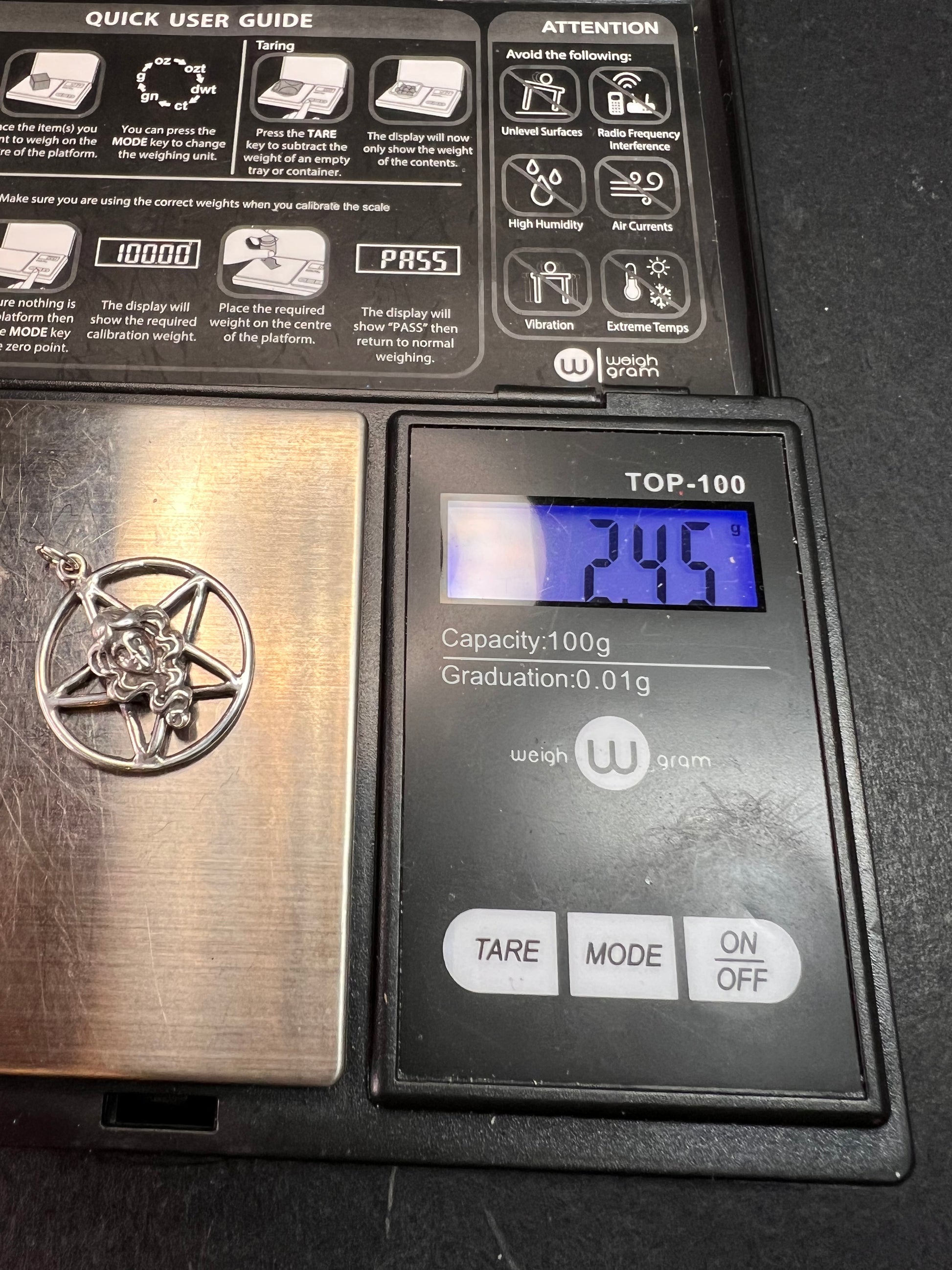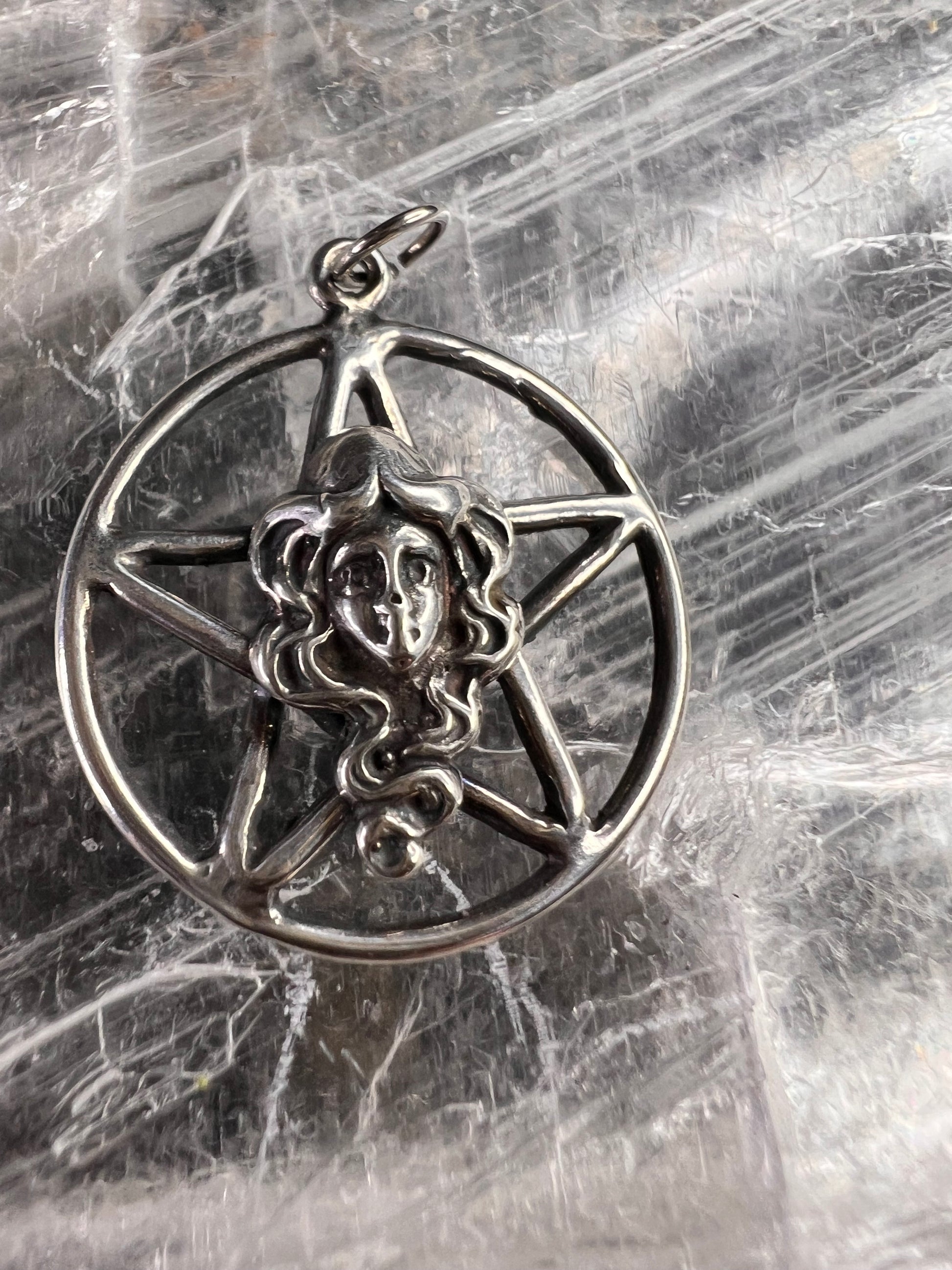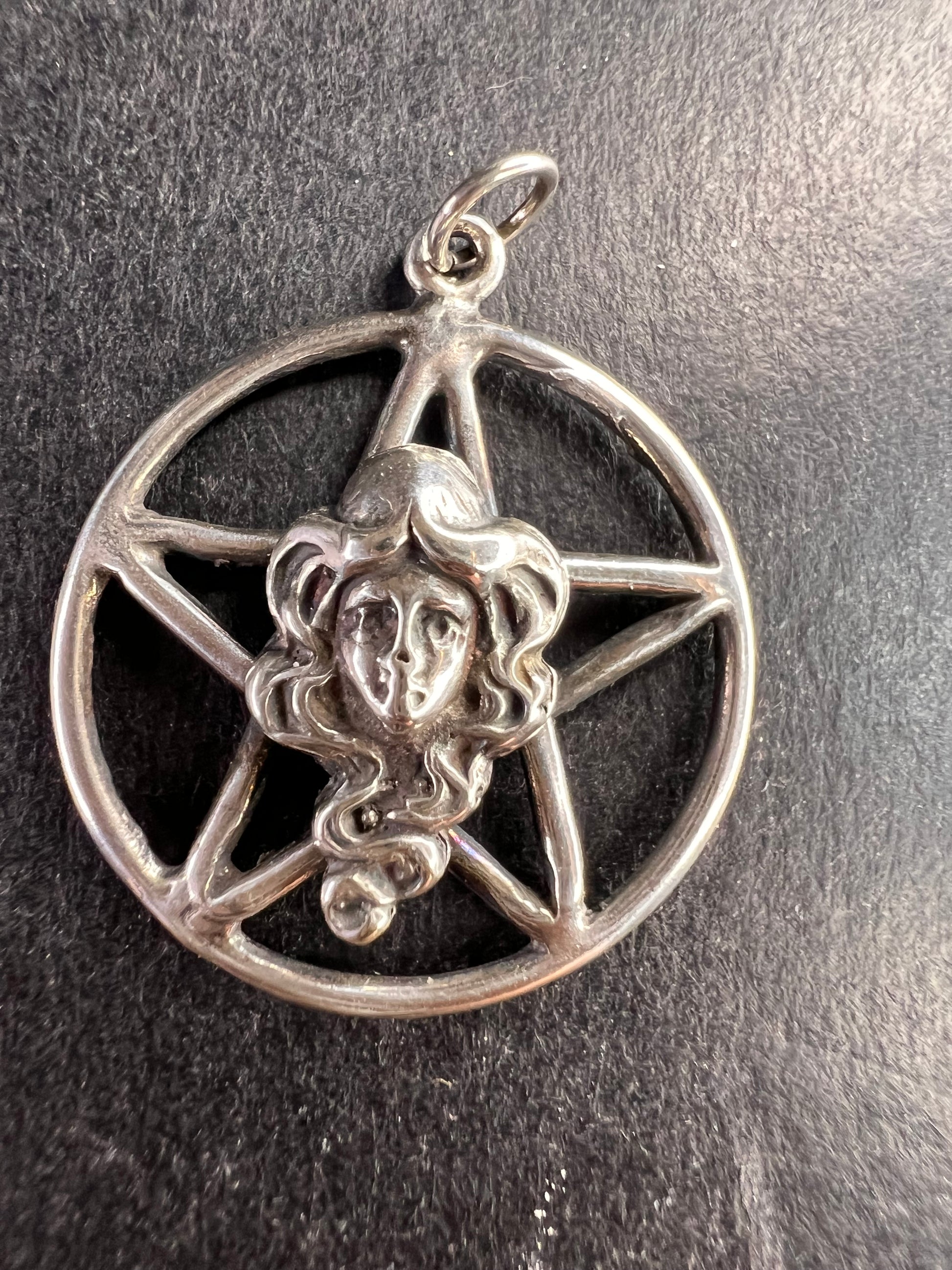 Vintage sterling silver pentacle charm featuring a detailed feminine goddess face at the center of a five-point star enclosed in a circle. The flowing hair is sculptural and stylized, giving this piece a strong mystical and symbolic presence. Pendant weighs 2.45 grams and measures approximately 1 inch in diameter excluding the bail, as shown in the photo measurements. No purity stamp present; however, the metal has been acid tested and verified as genuine sterling silver. Likely late 20th century vintage. Beautiful dimensional relief with excellent shine. Ideal for pagan, Wiccan, witchy, or symbolic jewelry collections. Pendant only; chain not included.