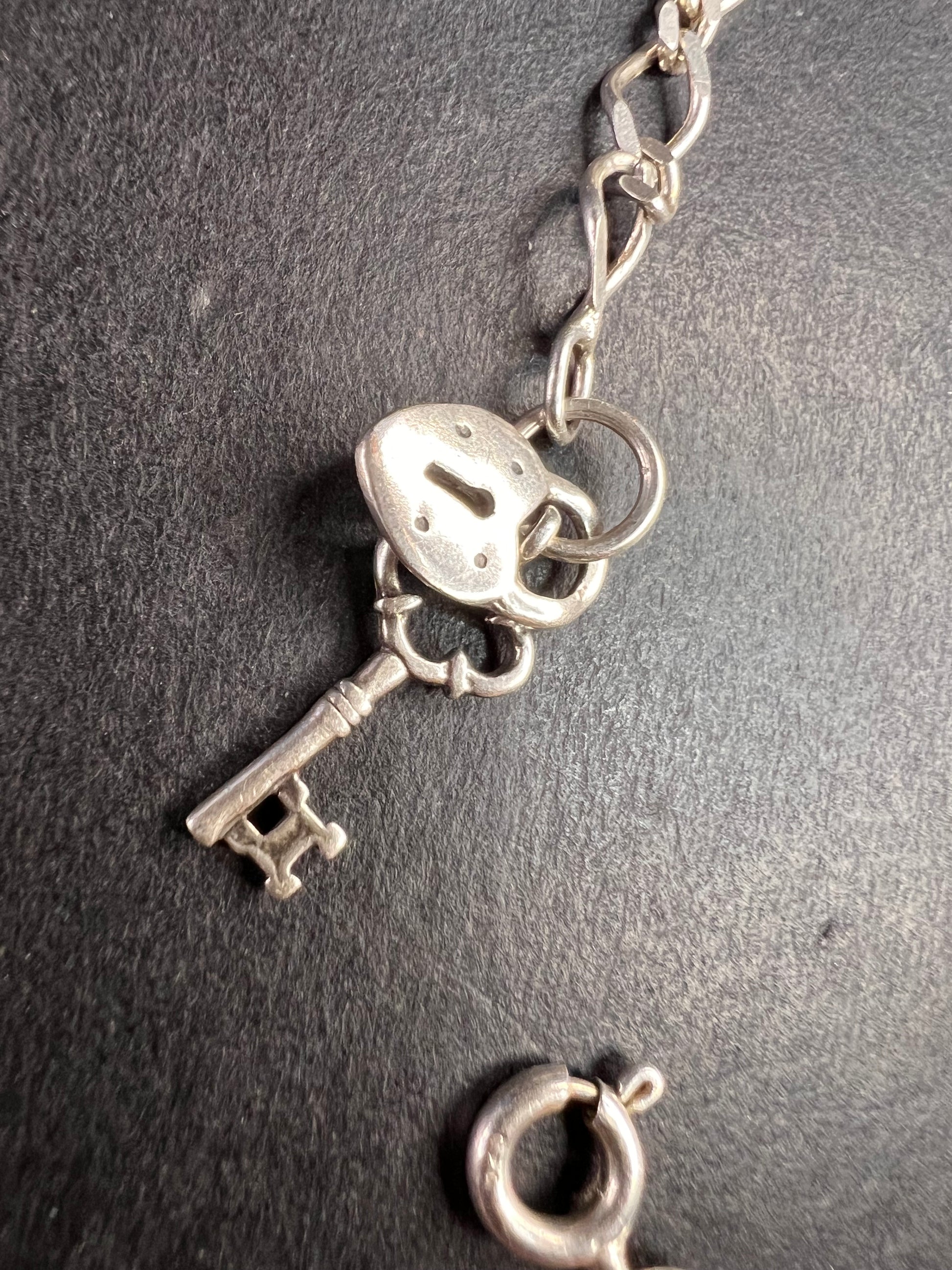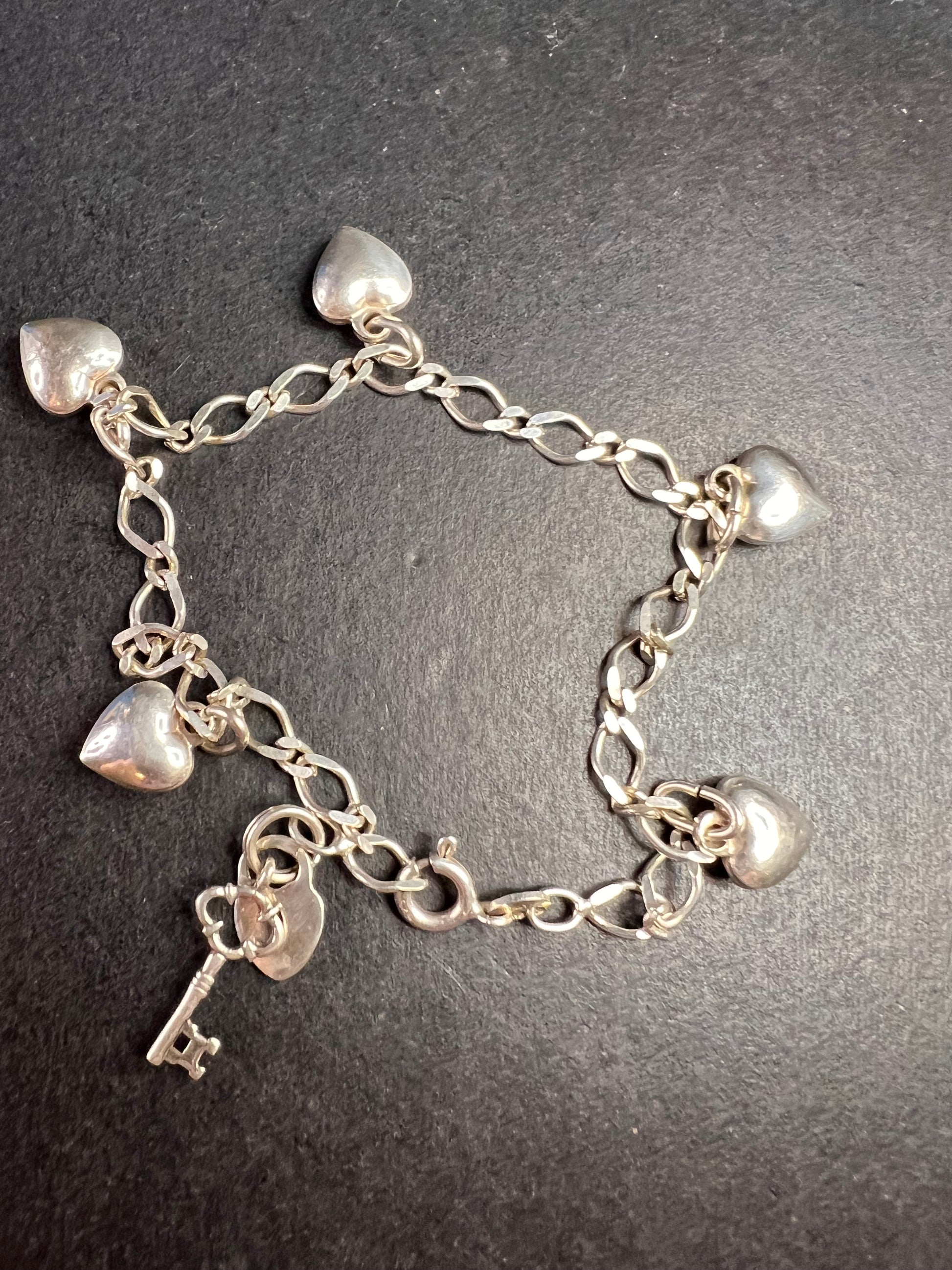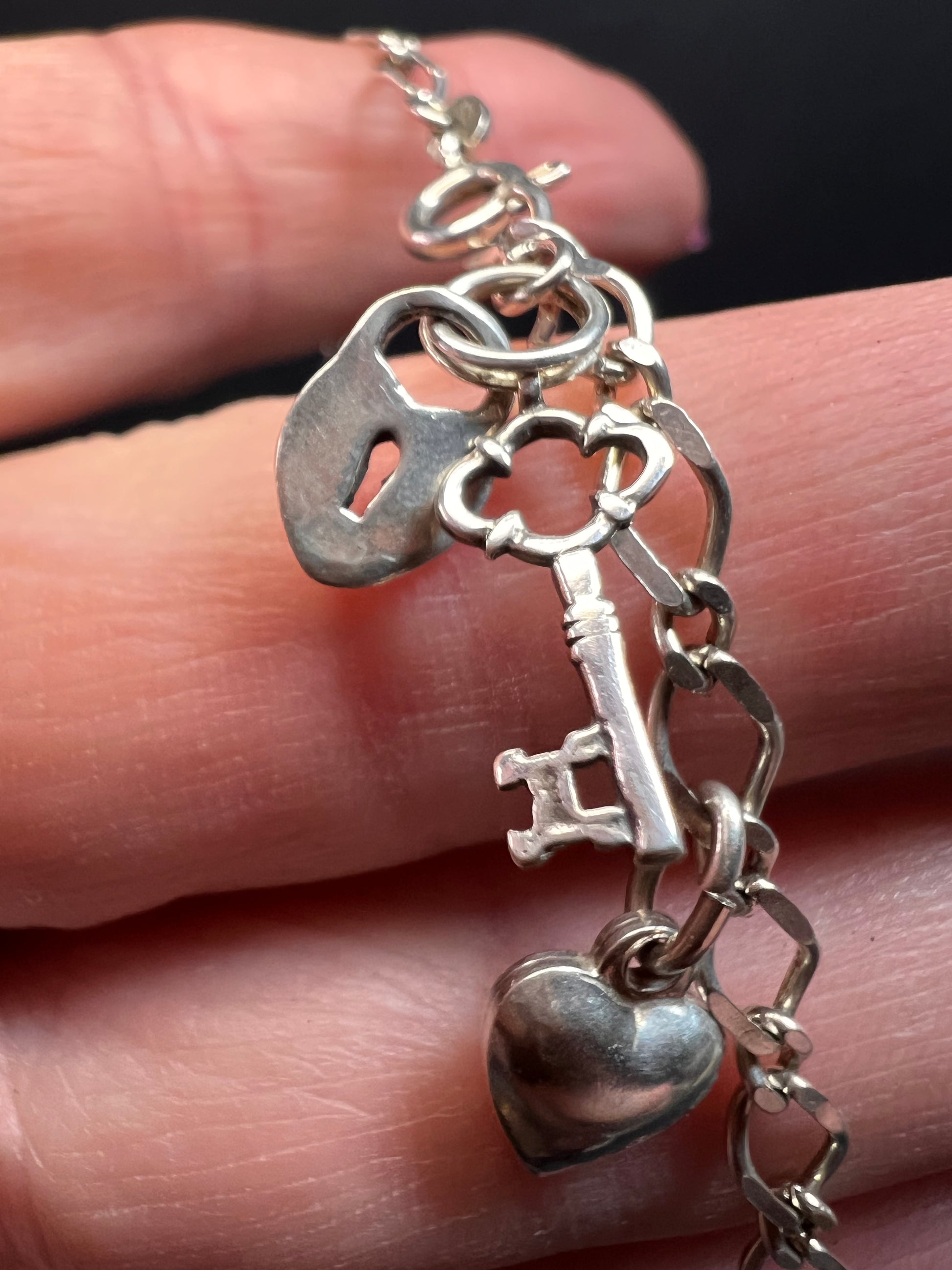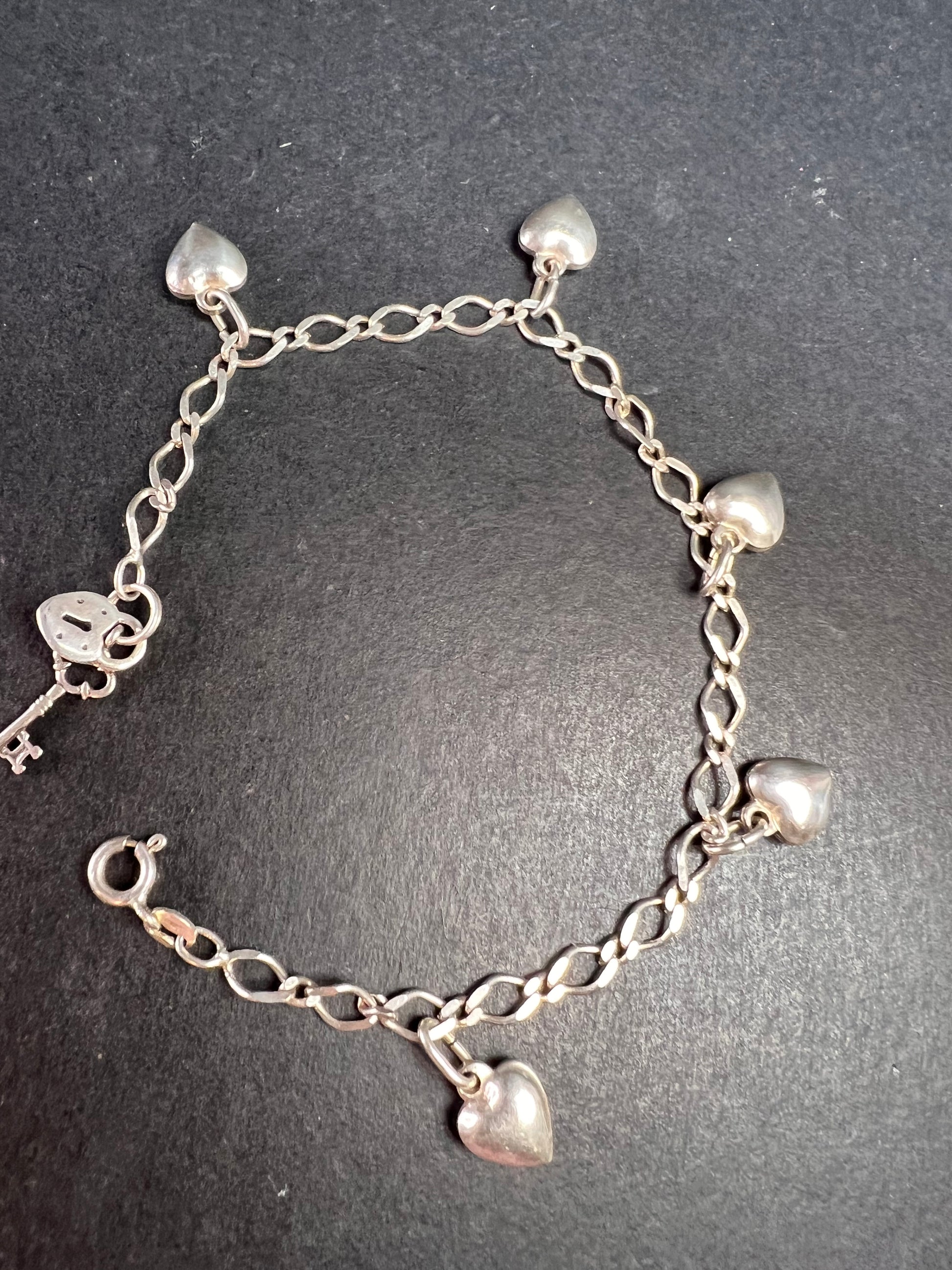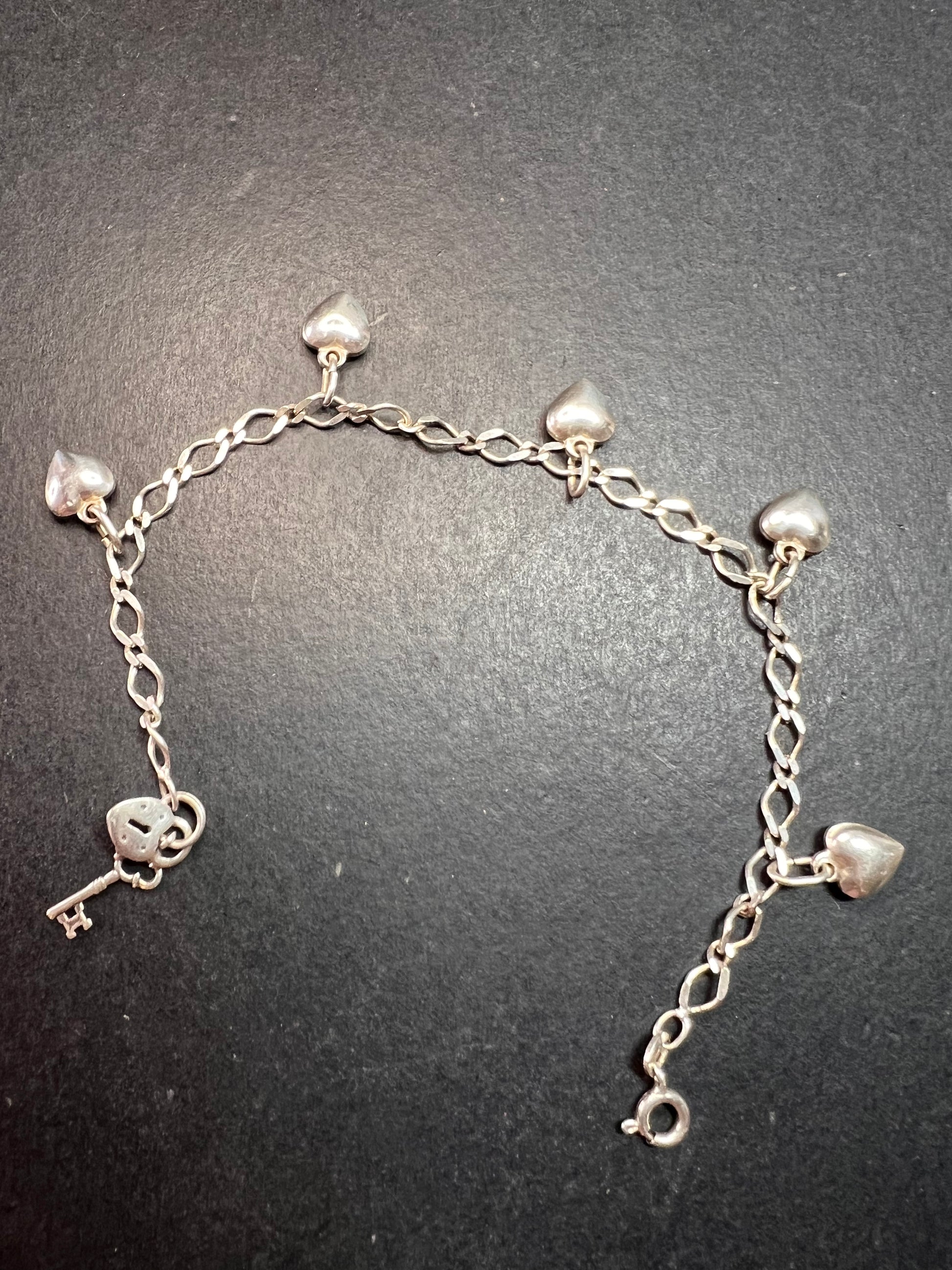 Authentic 925 sterling silver charm link bracelet with 5 little puffy hearts charms stationed throughout and lock and key charms dangling from the end. Measures about 7.5 inches in length and weighs 7.27 grams.