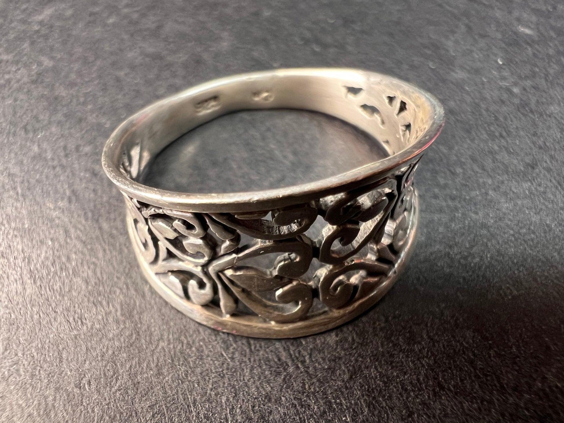 Authentic 925 sterling silver vintage scrollwork ring with indentation in the design. Measures a size 8 weighing 2.59 grams. Stamped 925 CW