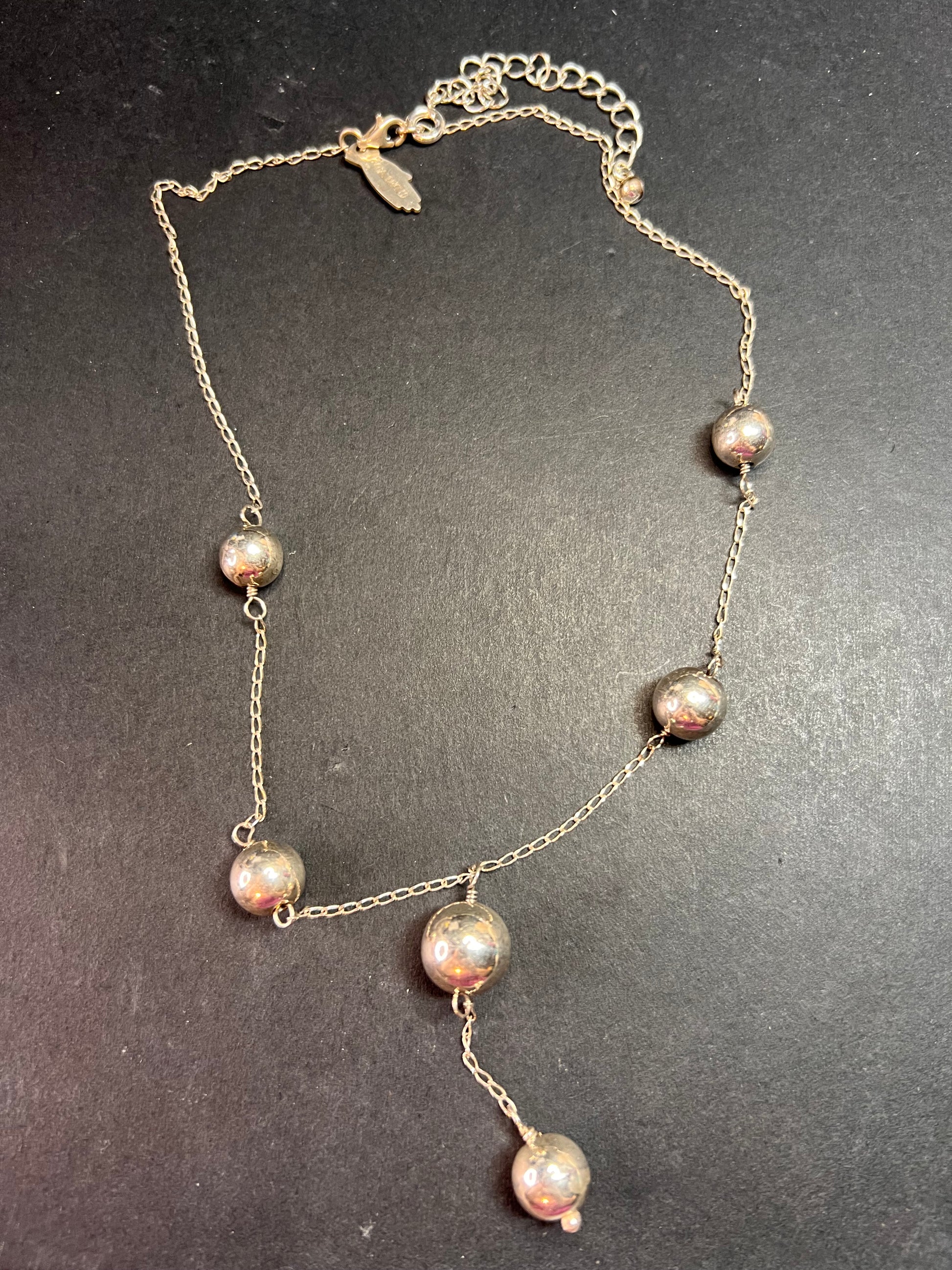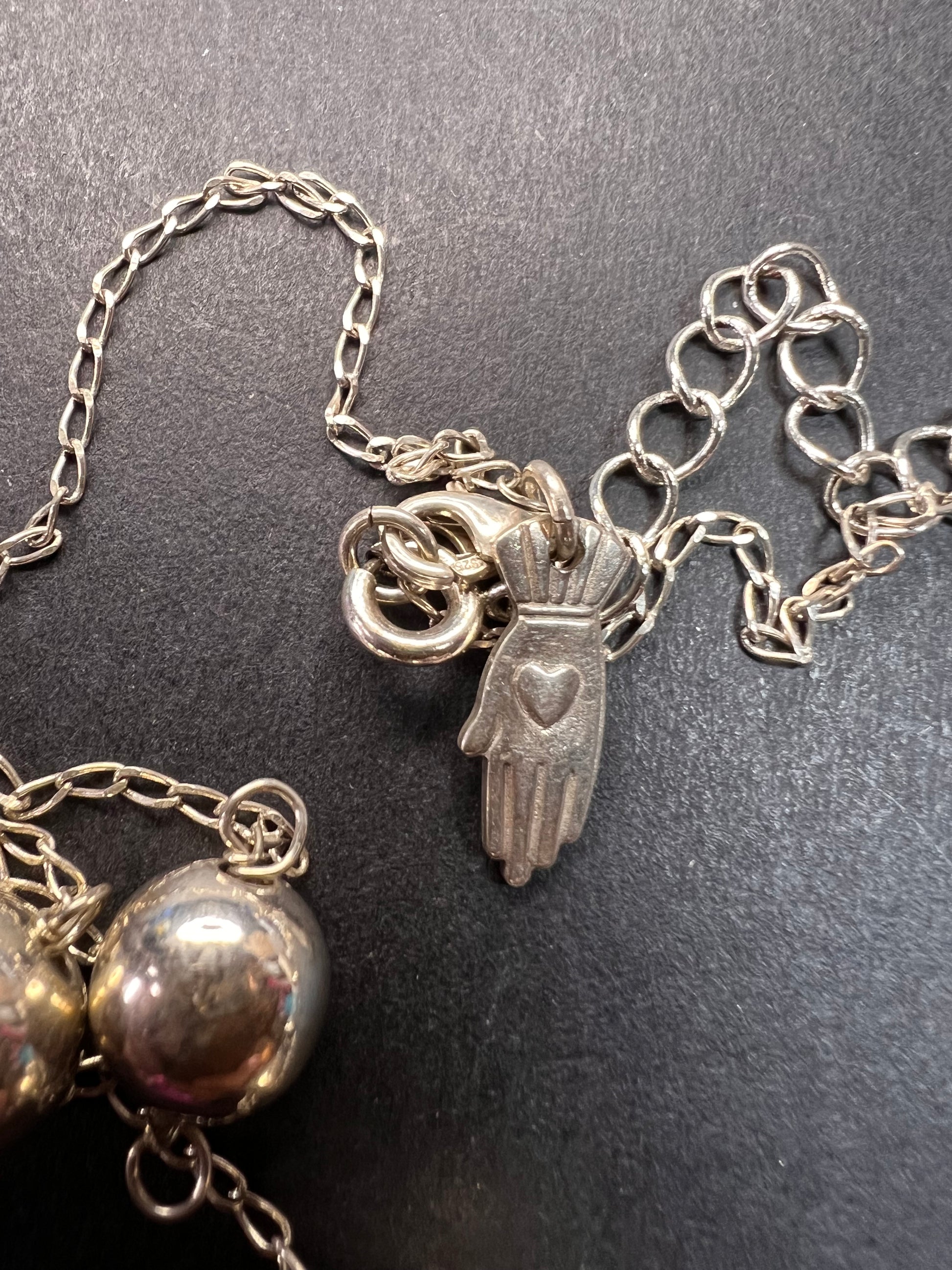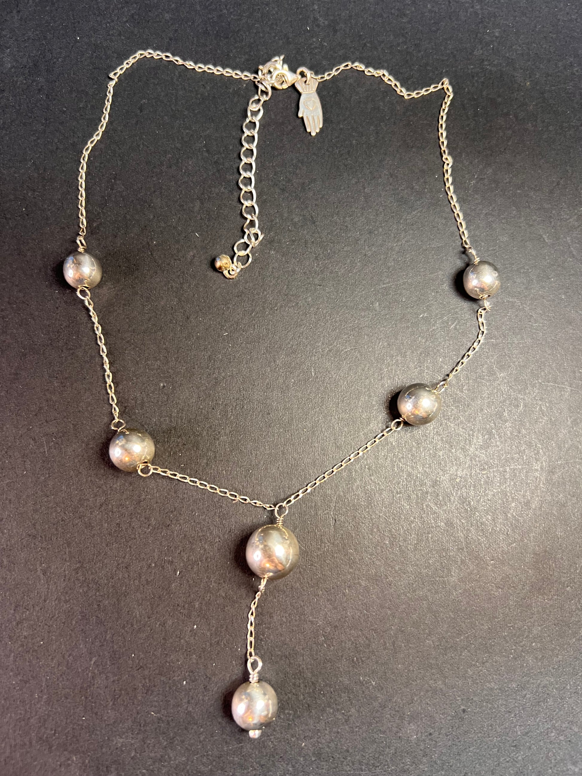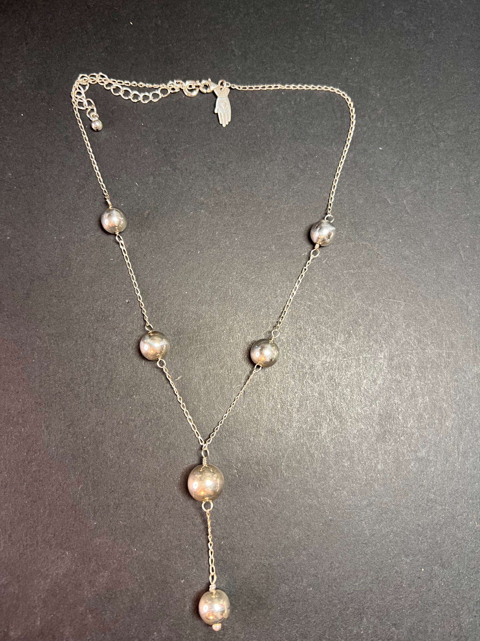 Authentic 925 sterling silver throughout. 6 Graduated 925 balls stationed on chain. Chain measures about 16 inches at the mid point where the Y drops down another 2 inches. Extension chain adds another 3 more inches to length of desired. Hand charm with heart dangling from the clasp end with one side stamped 025 HANDPICKED. I’m not sure if handpicked is the hallmark of a company or artisan it was made by. Spring ring clasp.