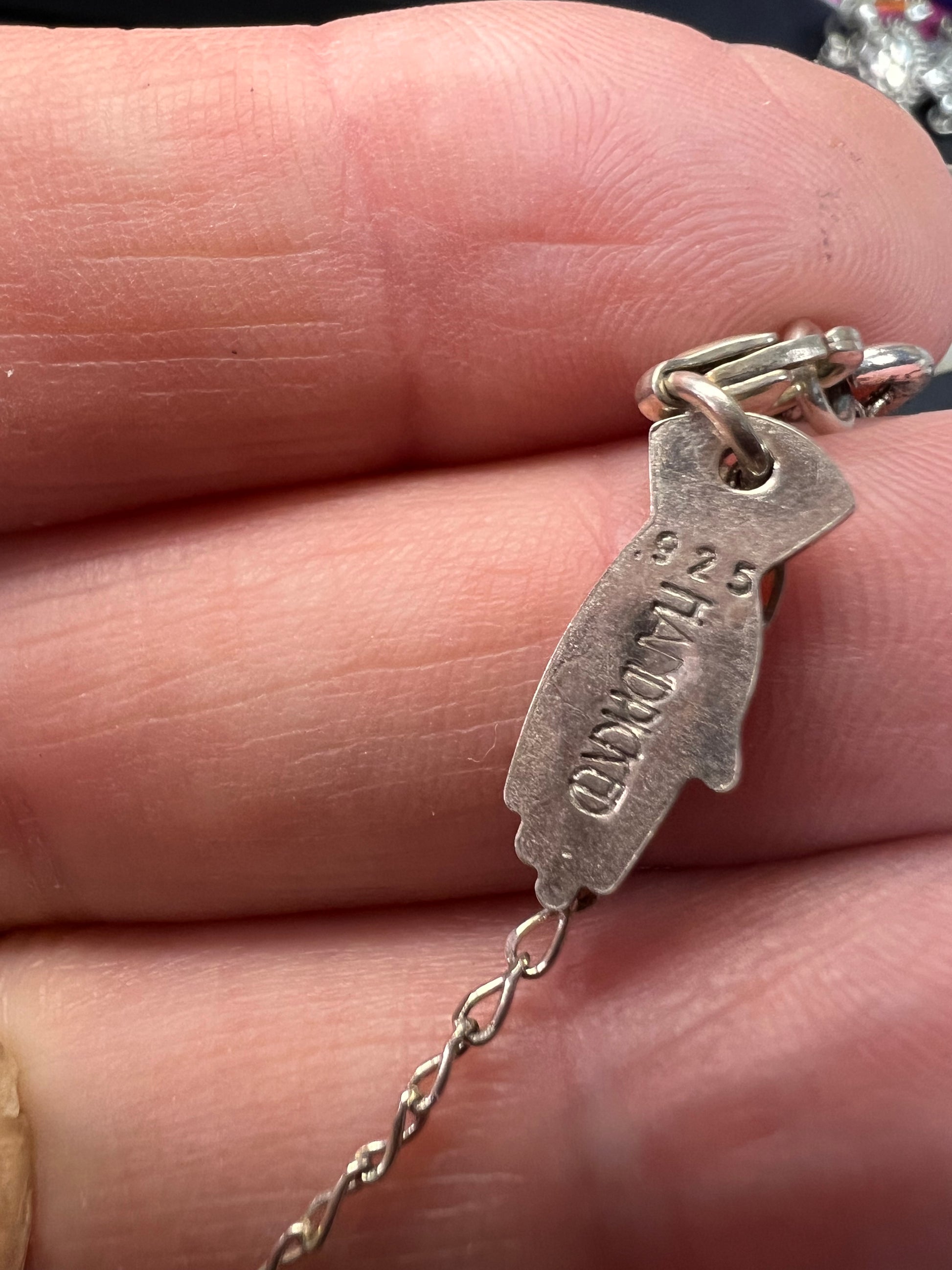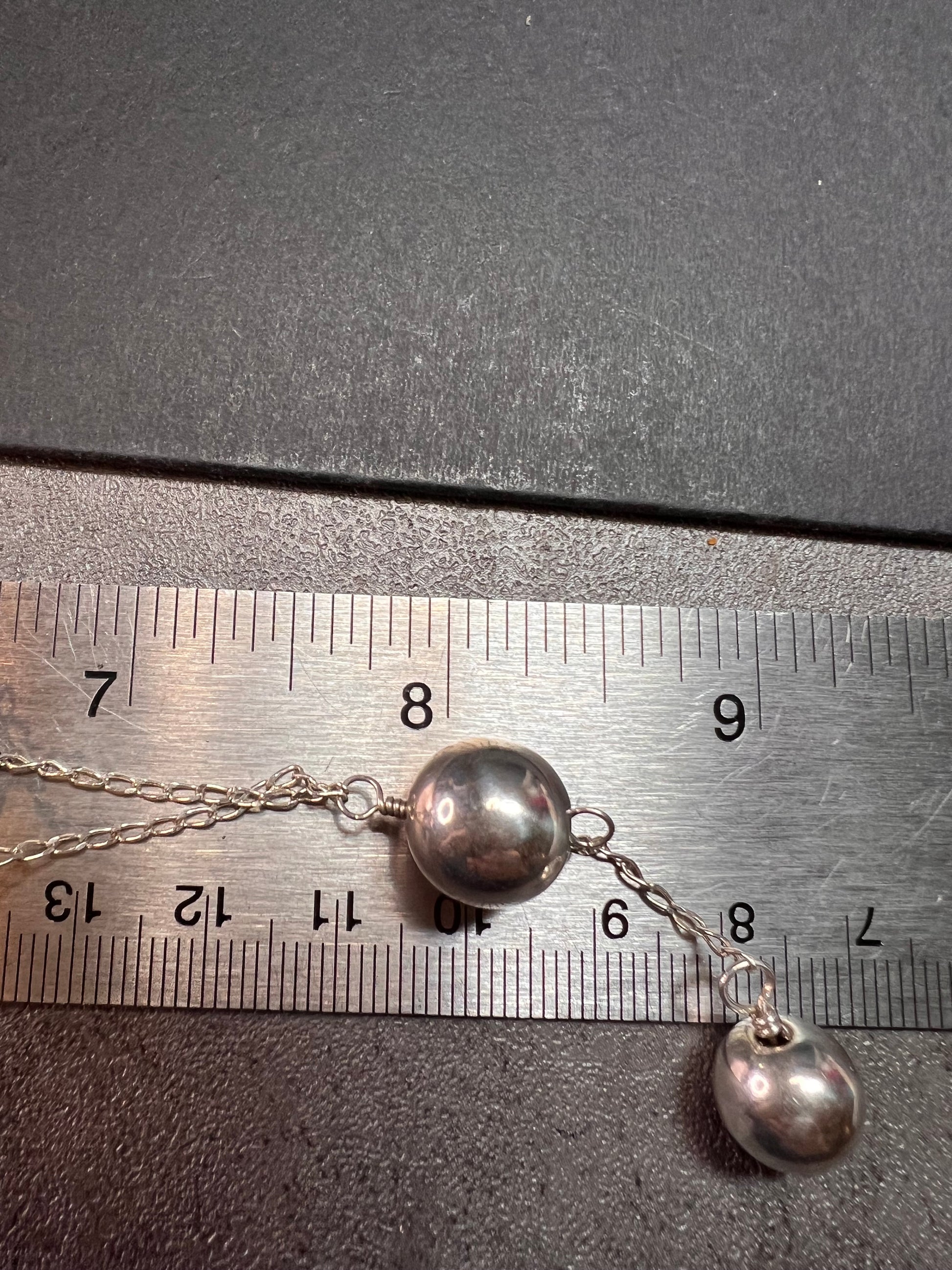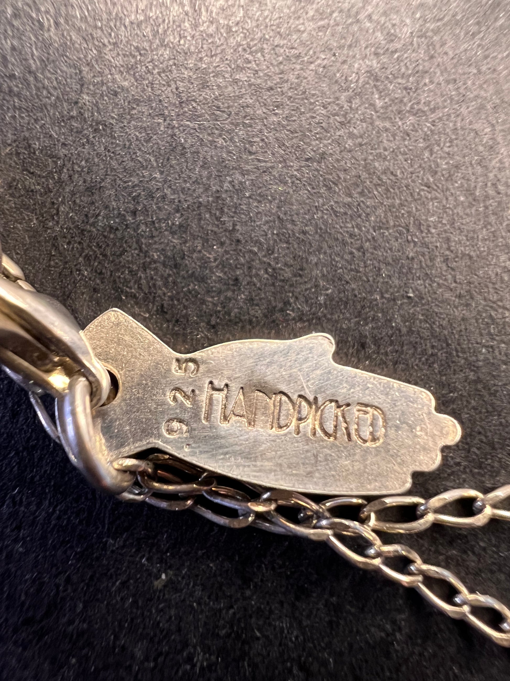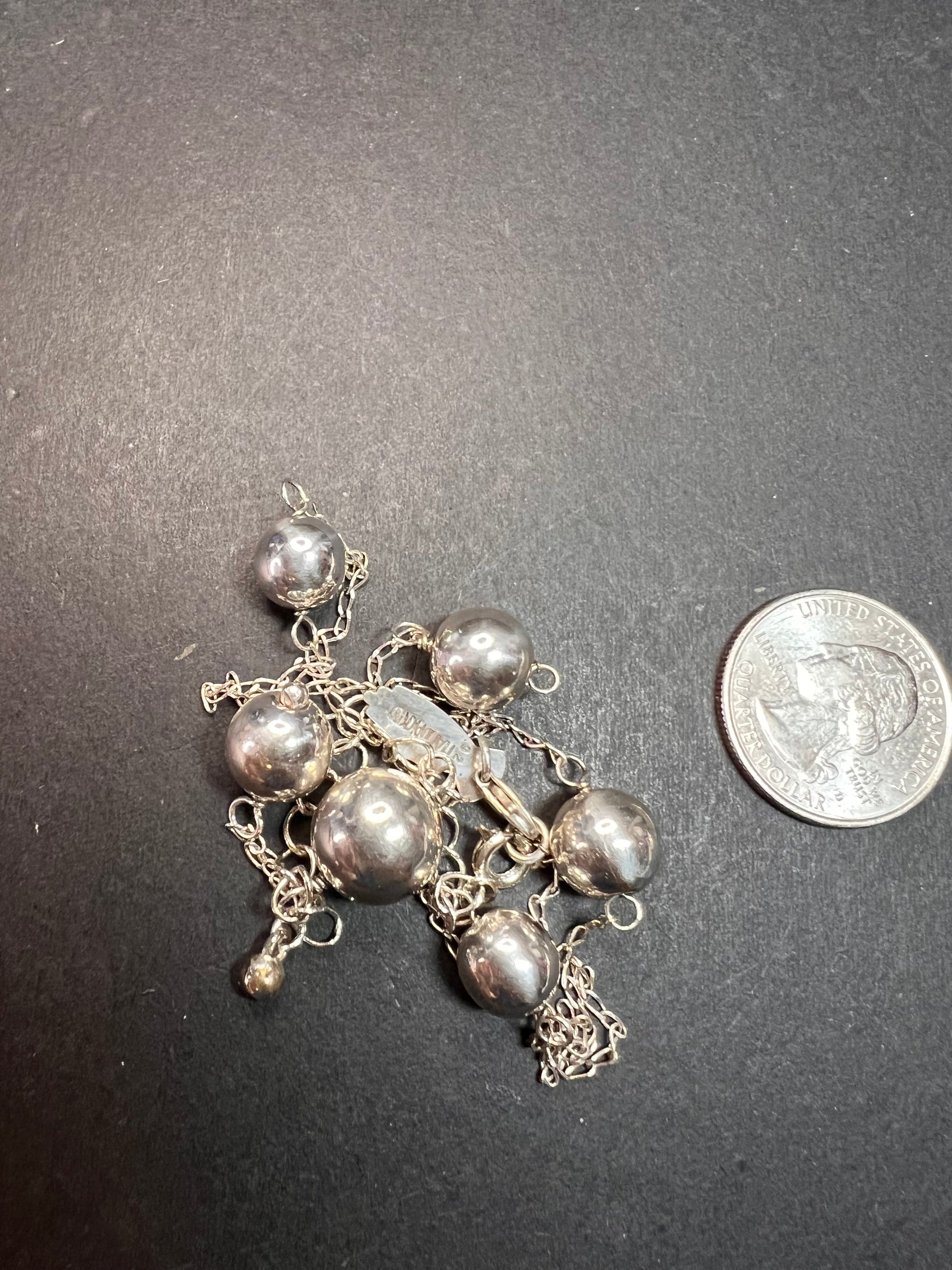Authentic 925 sterling silver throughout. 6 Graduated 925 balls stationed on chain. Chain measures about 16 inches at the mid point where the Y drops down another 2 inches. Extension chain adds another 3 more inches to length of desired. Hand charm with heart dangling from the clasp end with one side stamped 025 HANDPICKED. I’m not sure if handpicked is the hallmark of a company or artisan it was made by. Spring ring clasp.