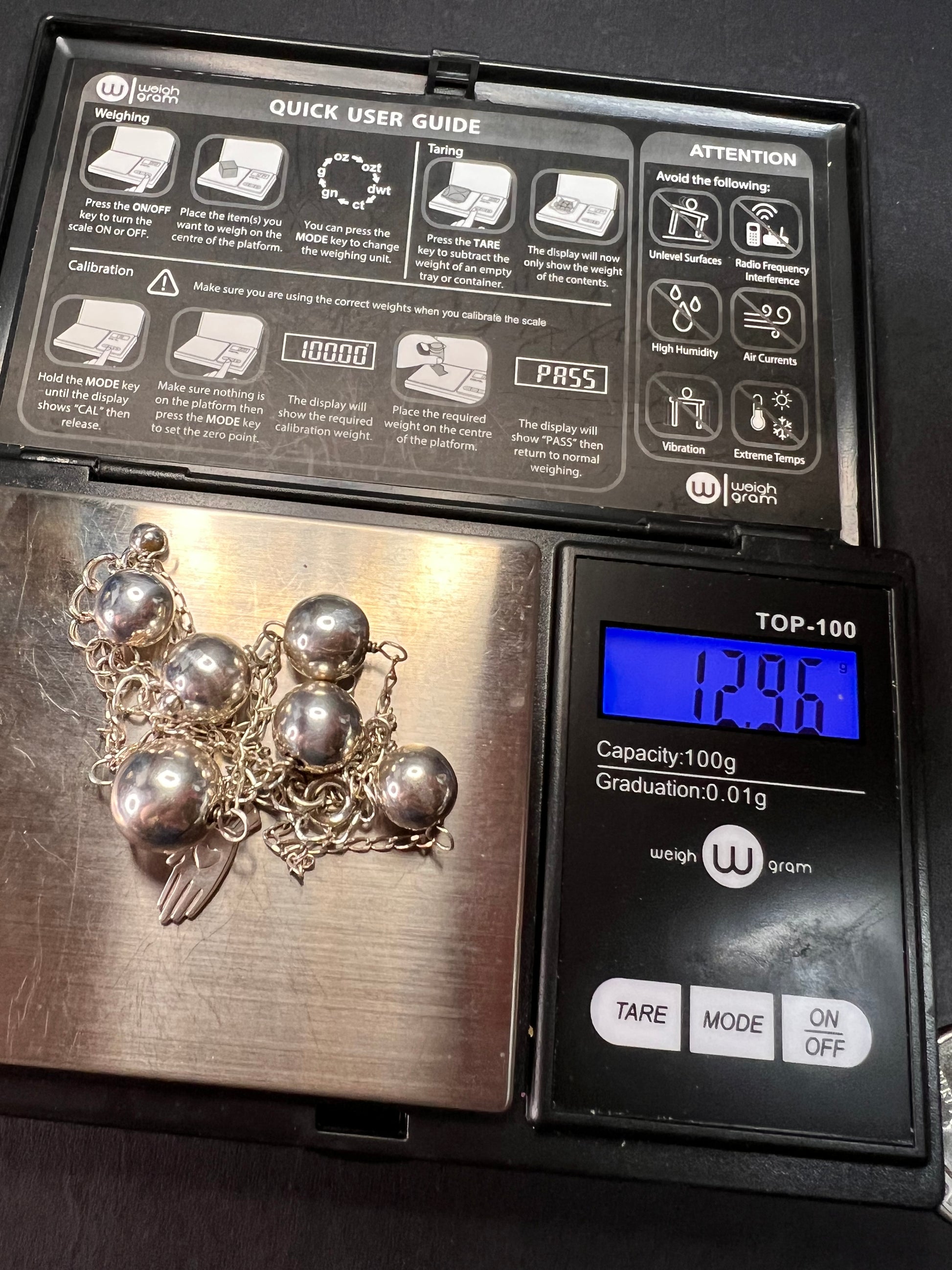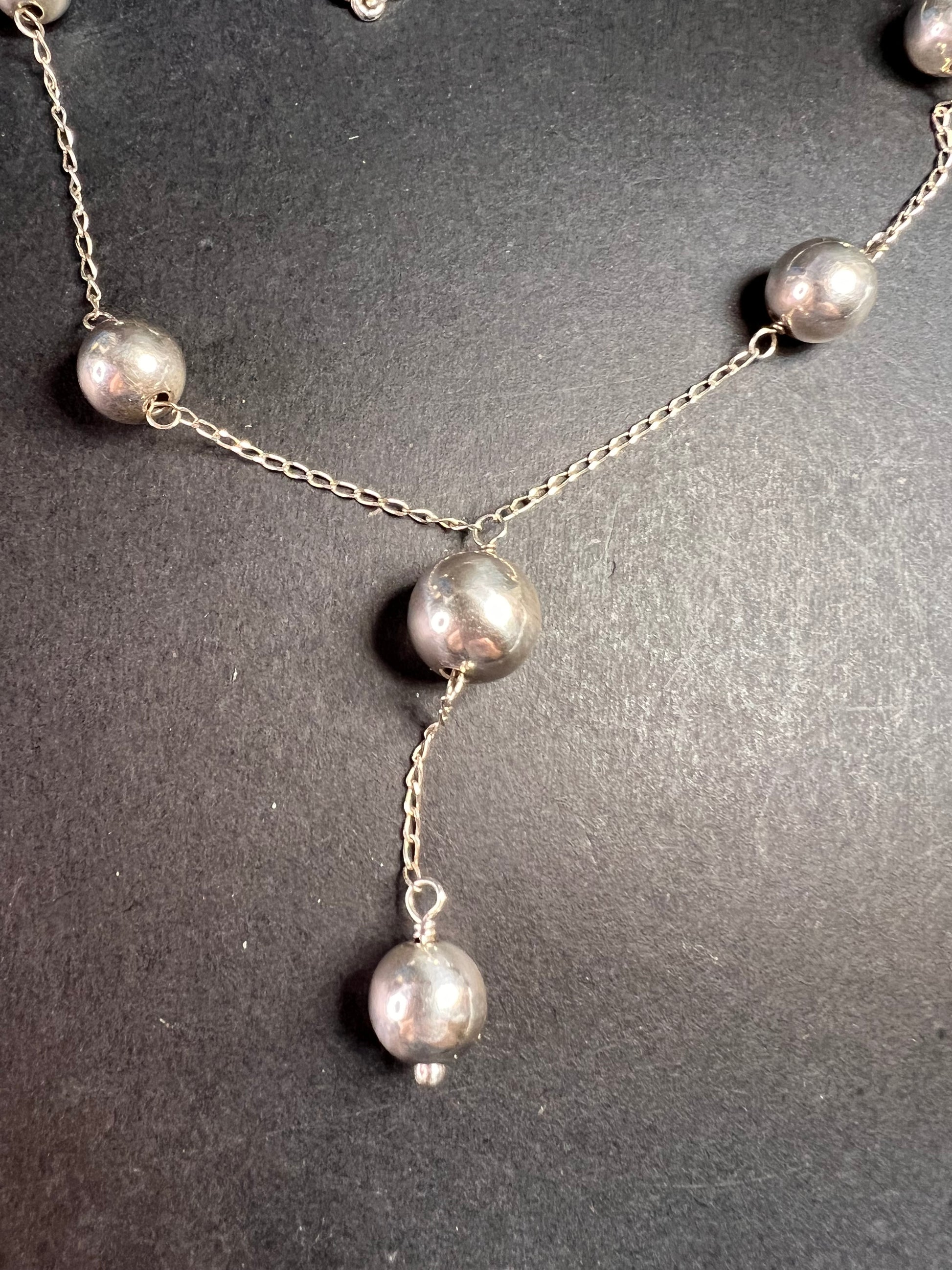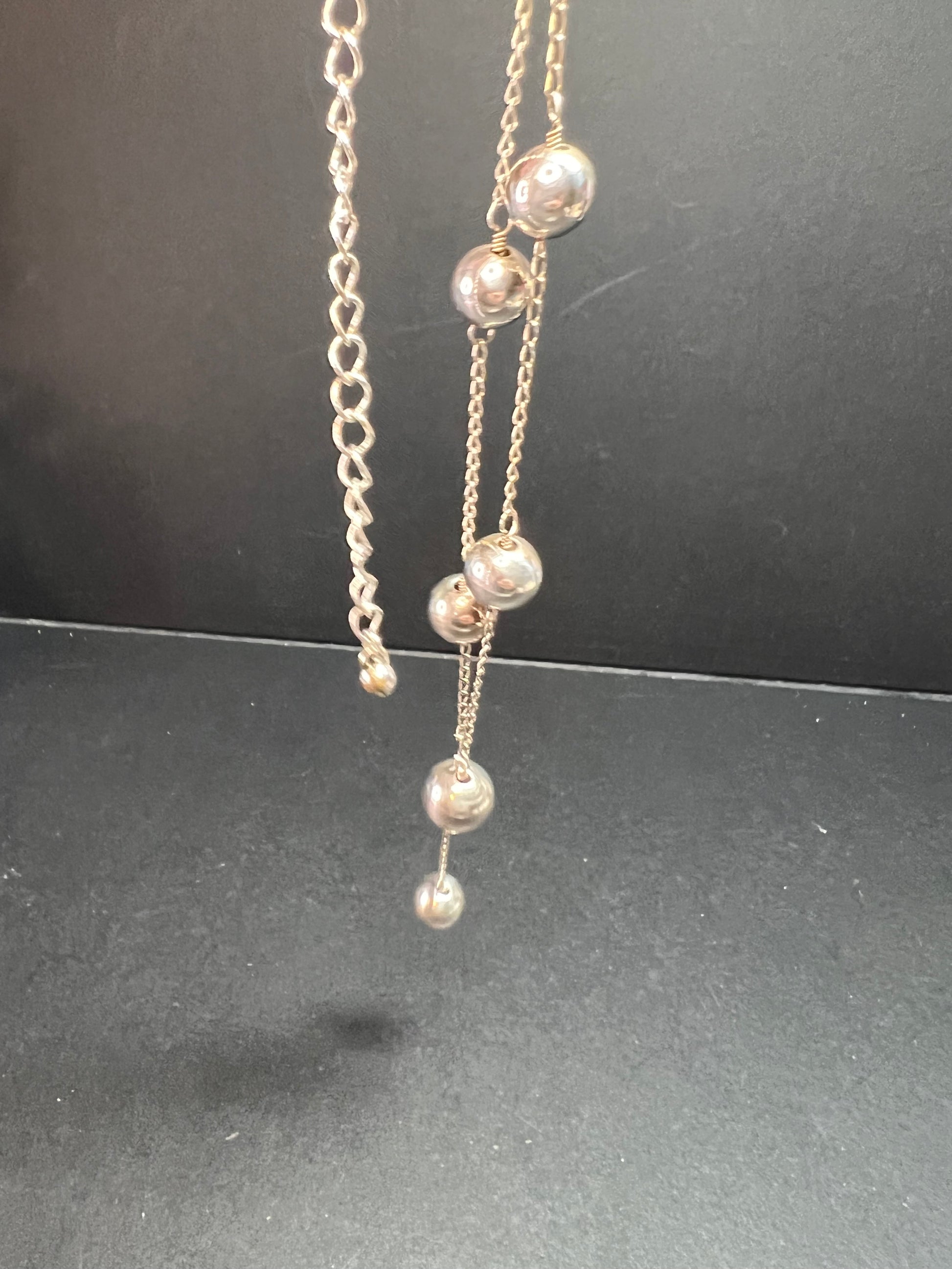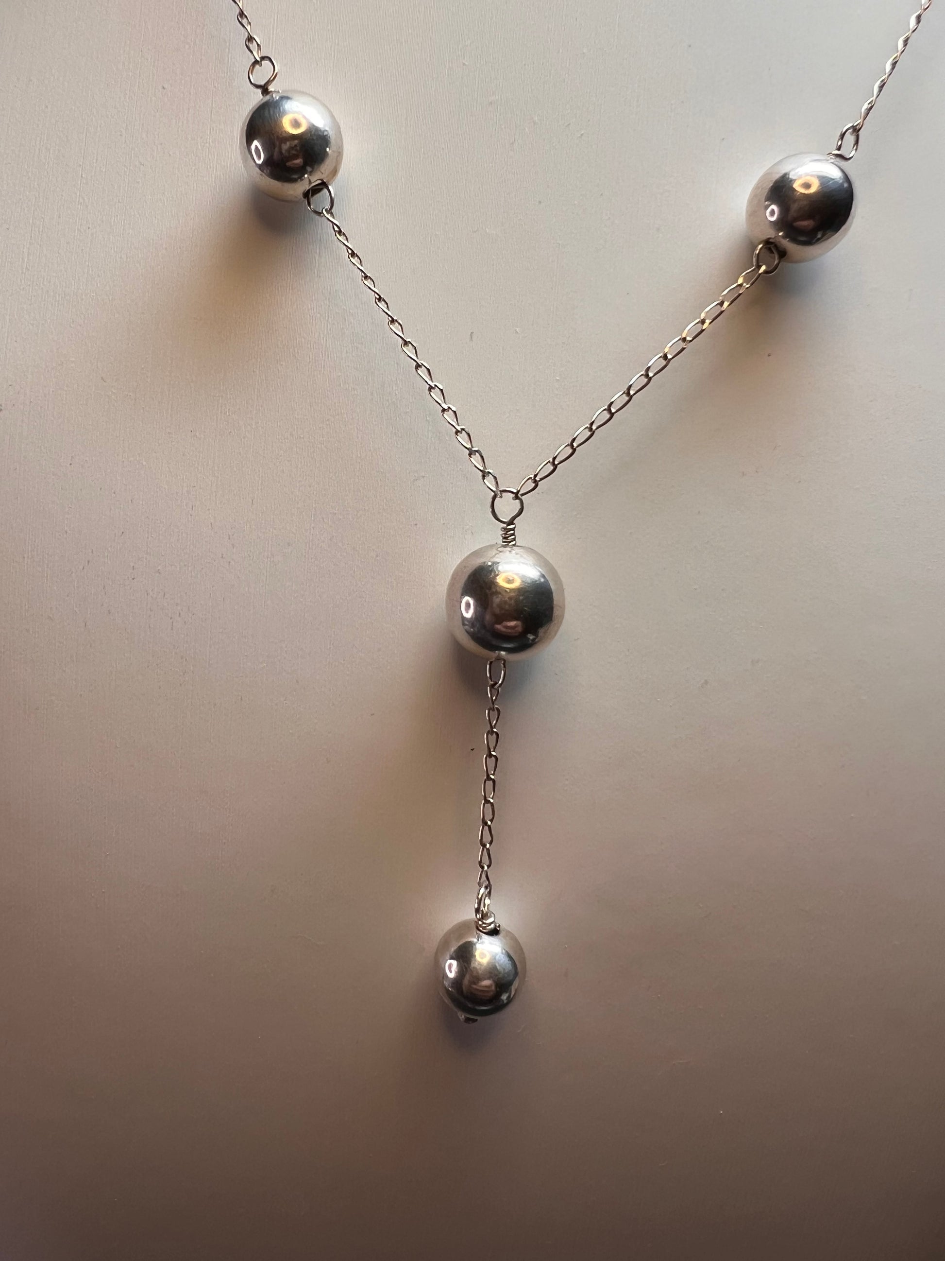 Authentic 925 sterling silver throughout. 6 Graduated 925 balls stationed on chain. Chain measures about 16 inches at the mid point where the Y drops down another 2 inches. Extension chain adds another 3 more inches to length of desired. Hand charm with heart dangling from the clasp end with one side stamped 025 HANDPICKED. I’m not sure if handpicked is the hallmark of a company or artisan it was made by. Spring ring clasp.
