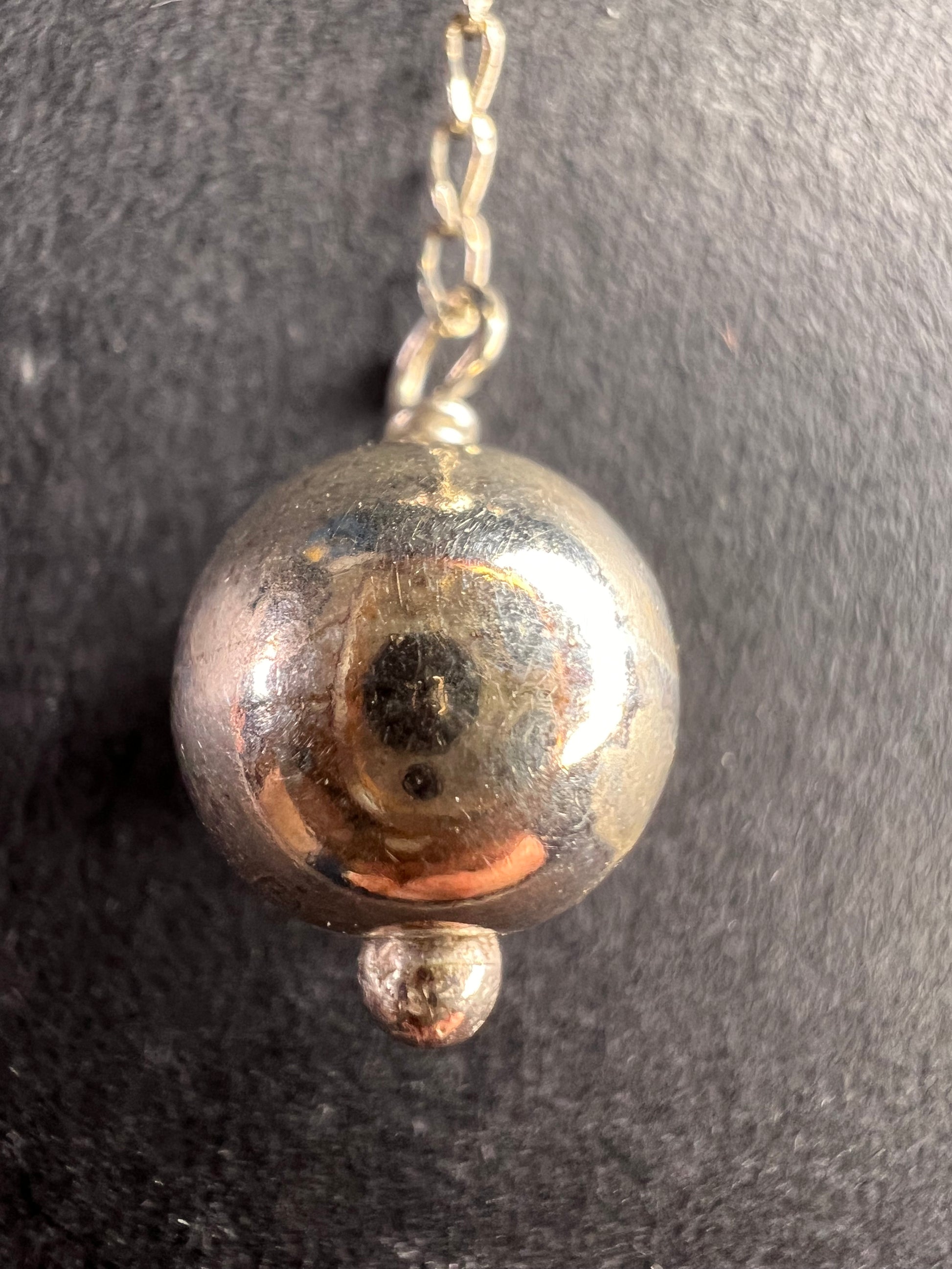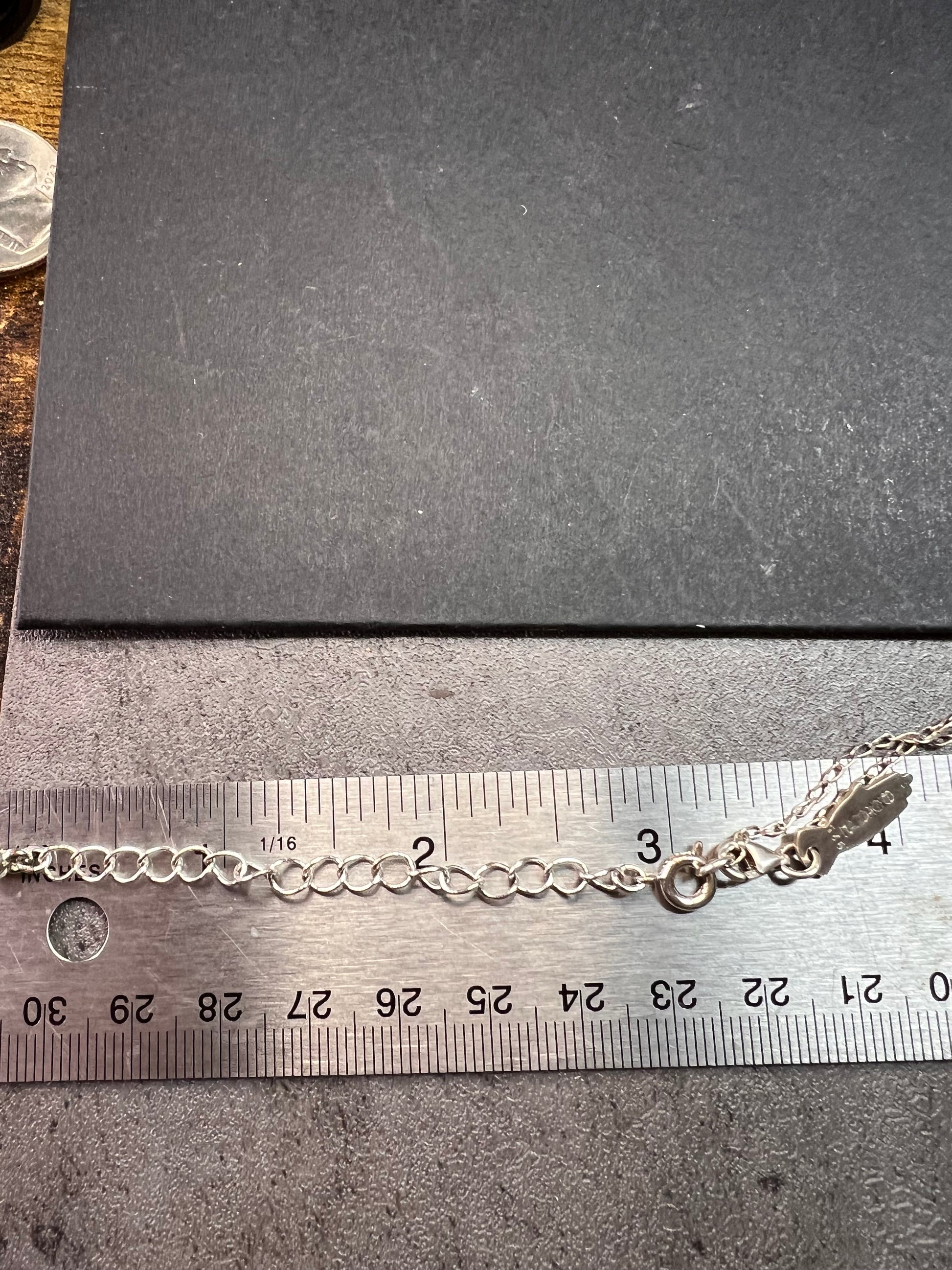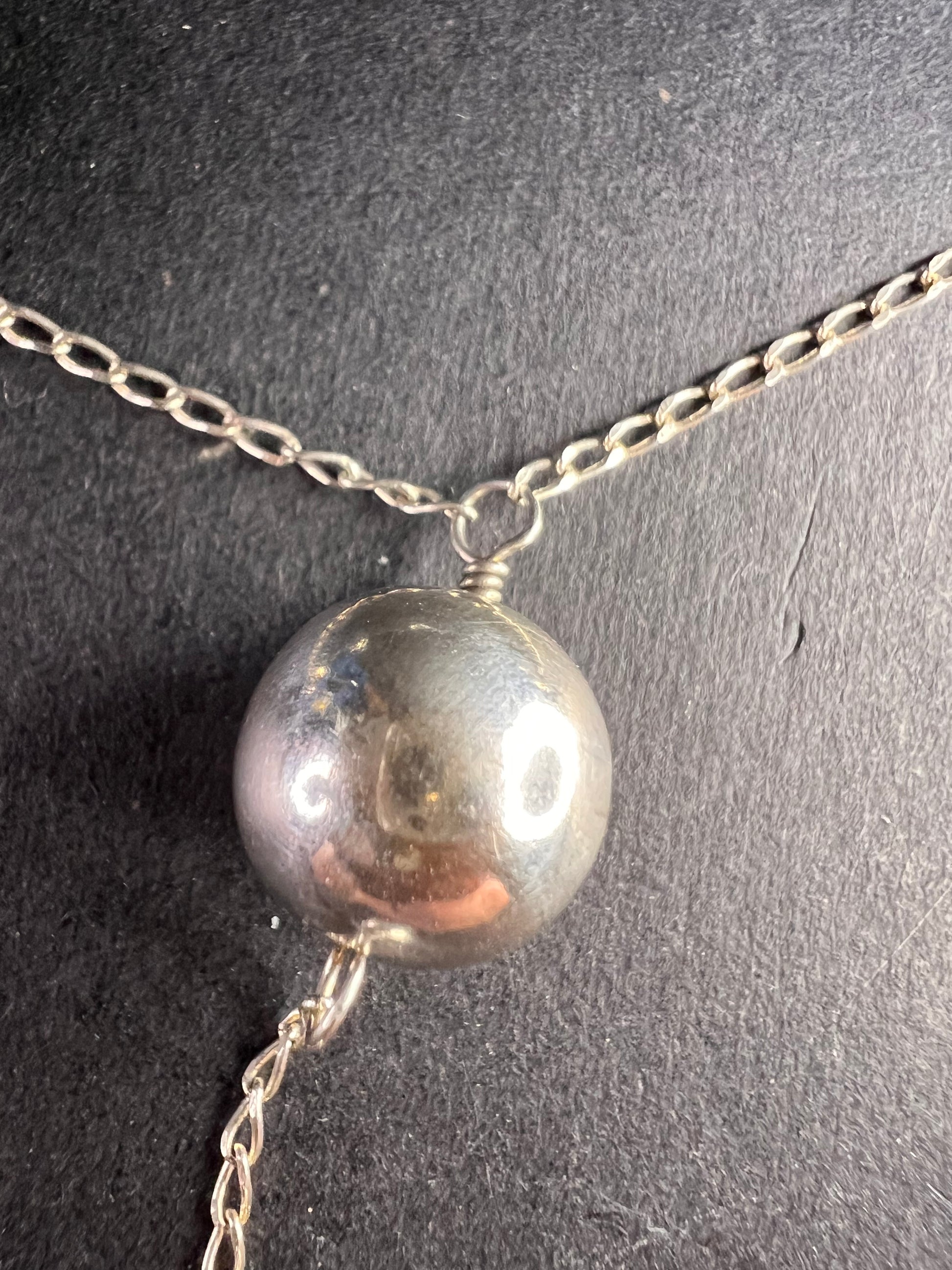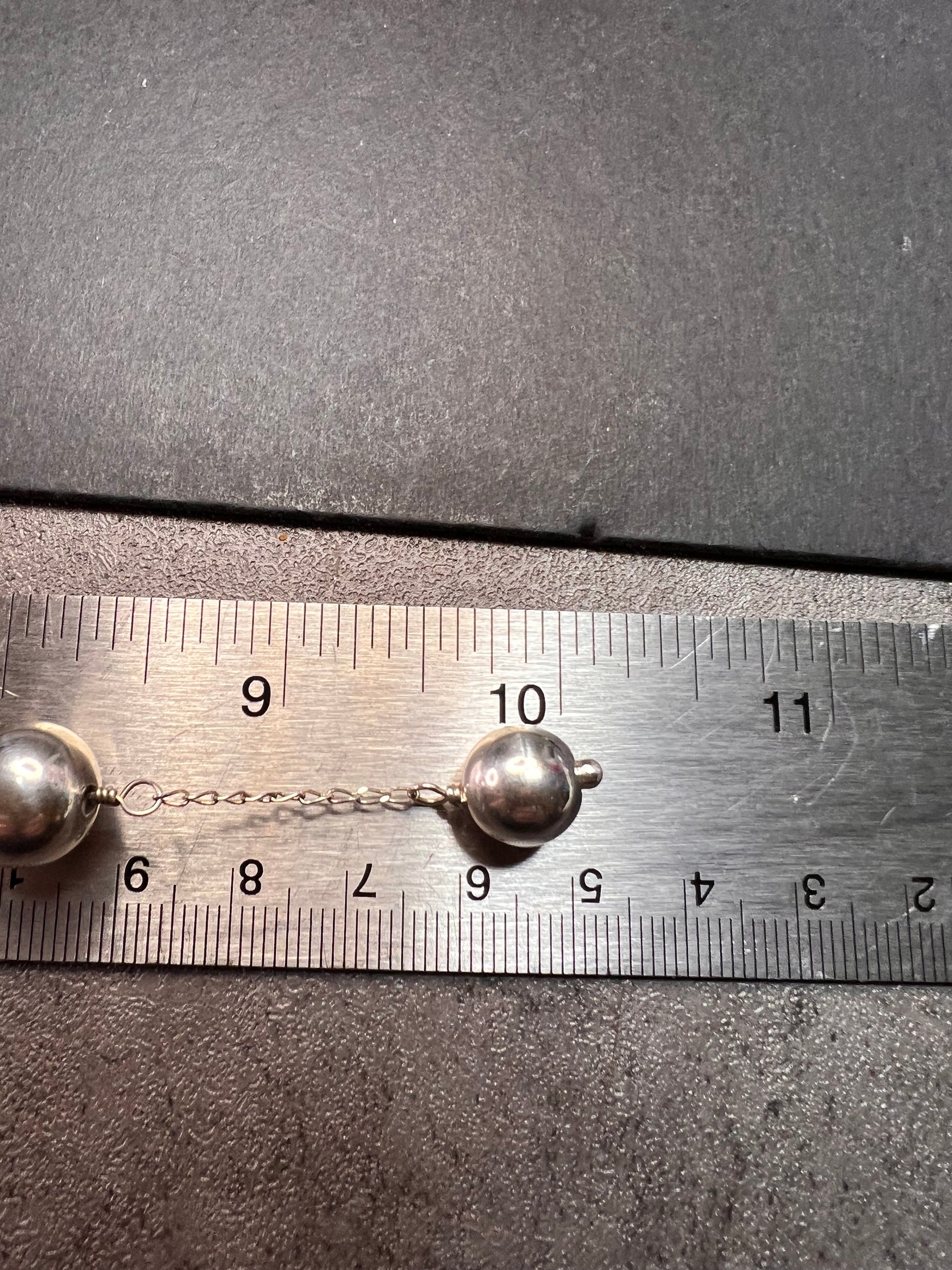 Authentic 925 sterling silver throughout. 6 Graduated 925 balls stationed on chain. Chain measures about 16 inches at the mid point where the Y drops down another 2 inches. Extension chain adds another 3 more inches to length of desired. Hand charm with heart dangling from the clasp end with one side stamped 025 HANDPICKED. I’m not sure if handpicked is the hallmark of a company or artisan it was made by. Spring ring clasp.