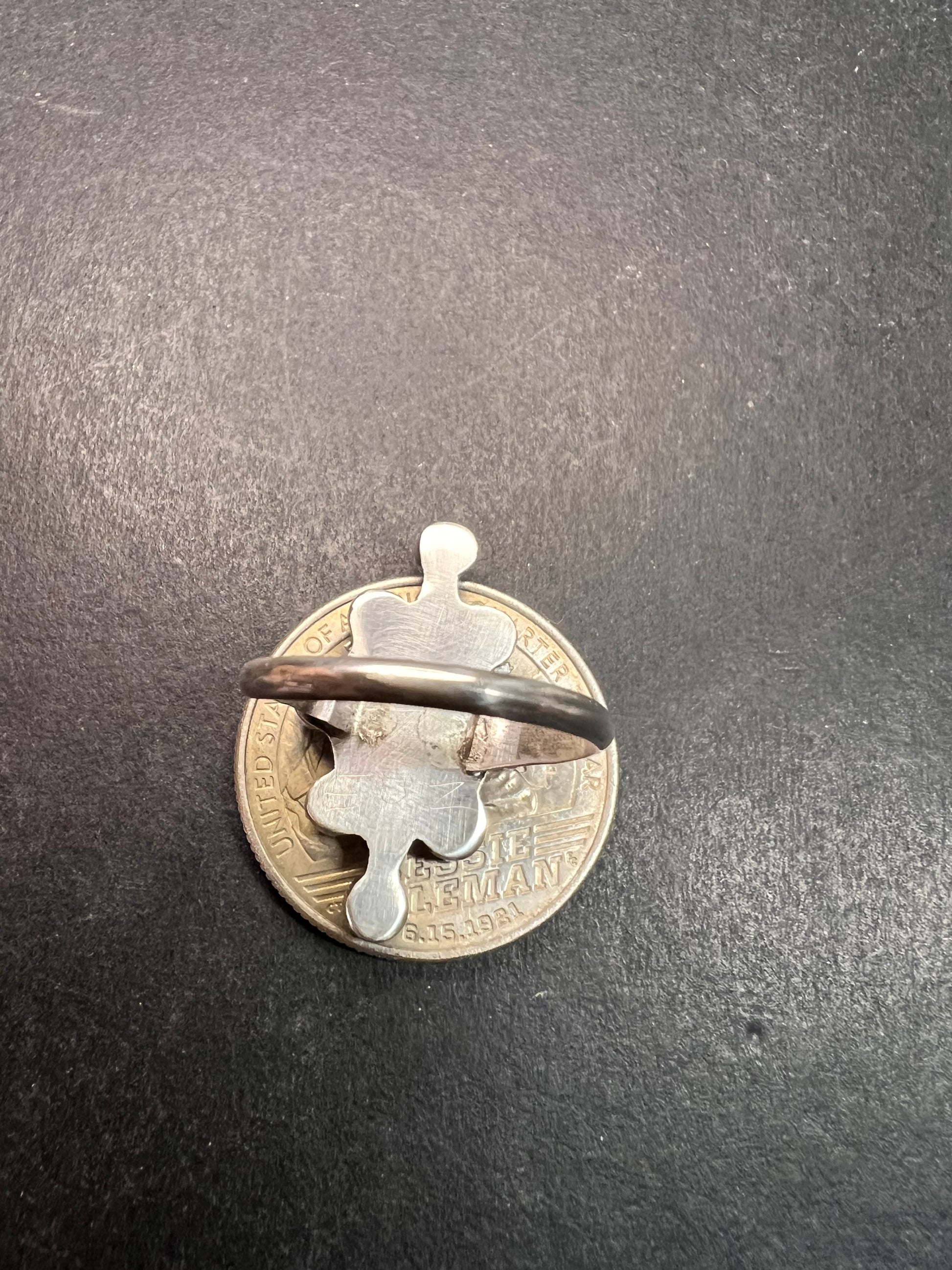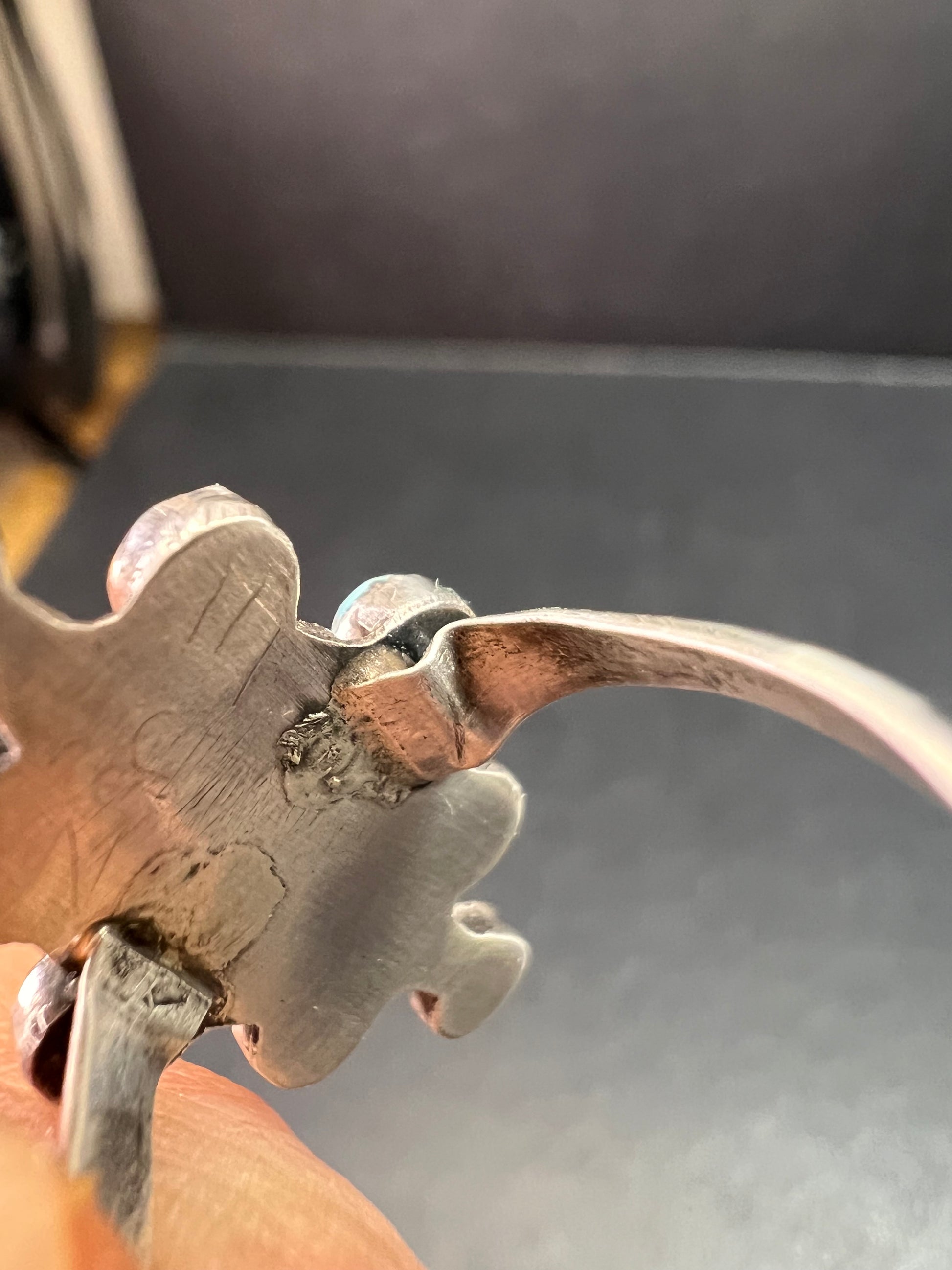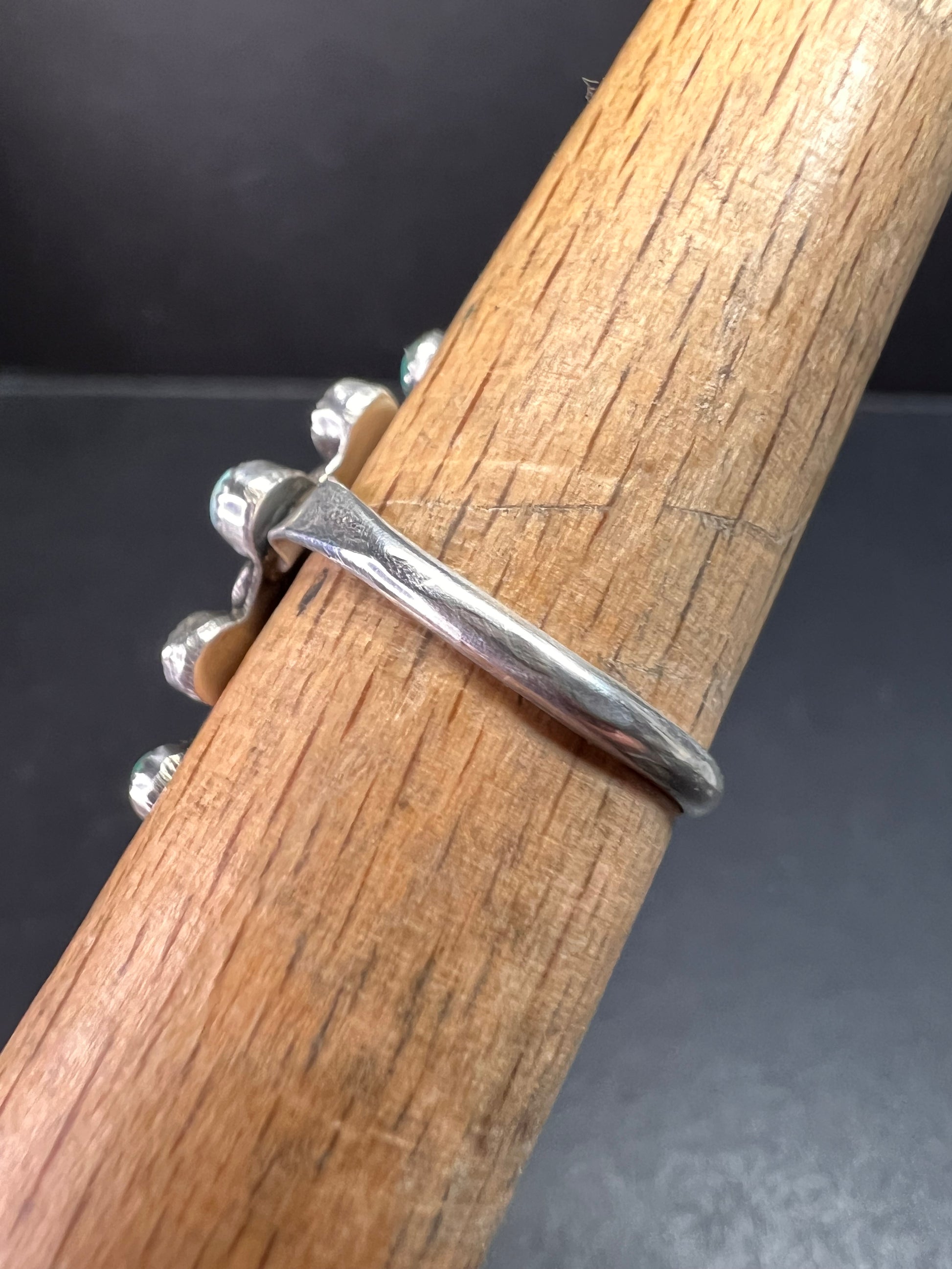 Gorgeous vintage ring featuring nine natural turquoise stones set in genuine Sterling Silver (.925). This fine vintage piece is in the Southwestern style, likely Mid-Century era. Verified Sterling Silver via acid test. It’s approximately a size 7 and weighs 2.51 grams. CONDITION NOTE: There is an old repair/damage where the band meets the top (see photos), but it is sturdy and very wearable.