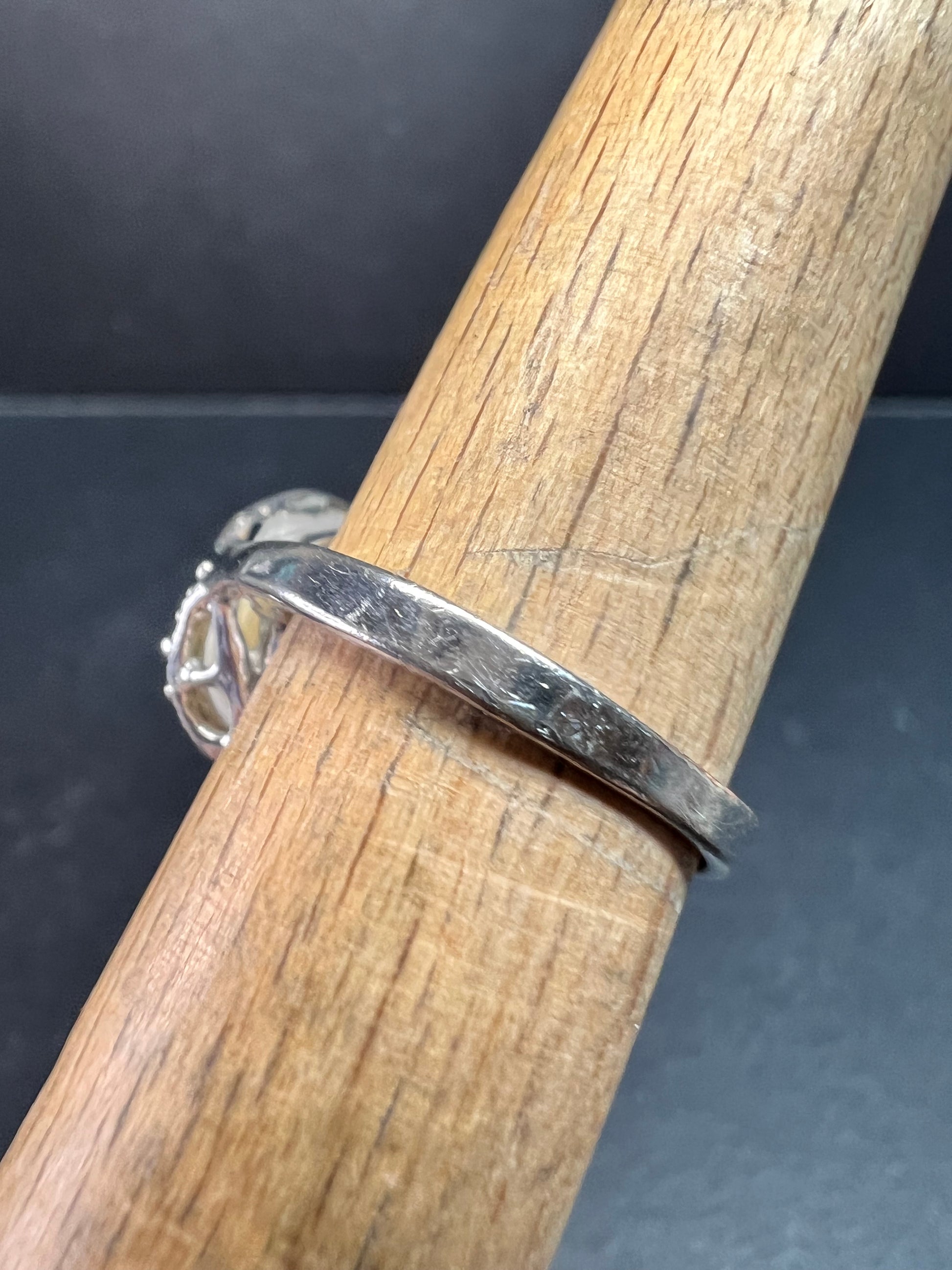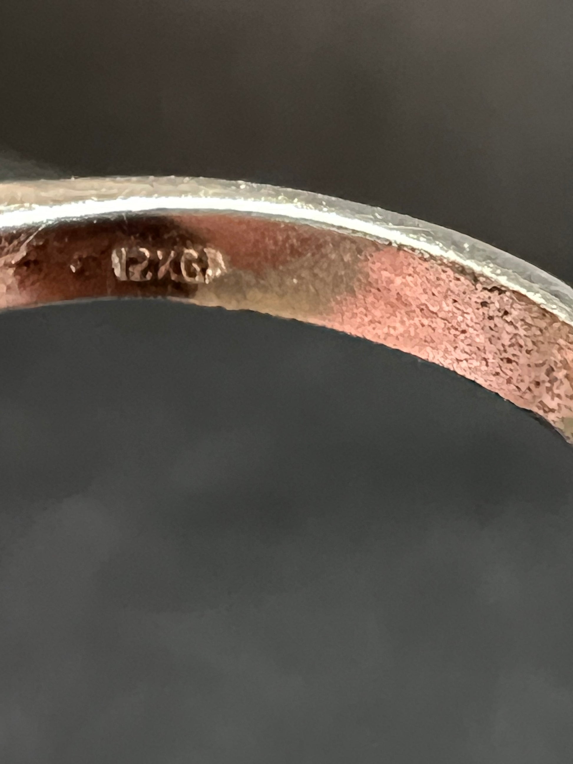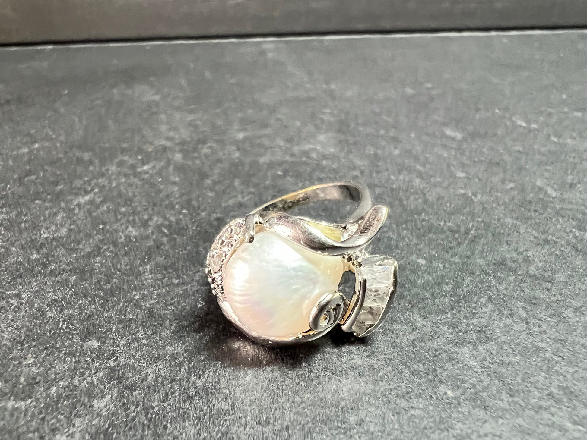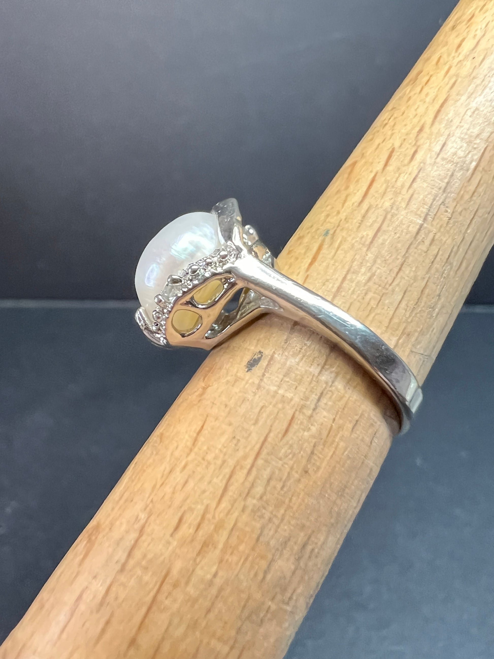 Gently pre-owned statement ring featuring an authentic white cultured pearl with beautiful natural nacre and soft rainbow orient, accented by clear CZ stones in a sculptural, vintage-inspired setting. The inside of the band is stamped 12k GP, indicating 12-karat gold plating over base metal. The pearl appears securely set, with CZ accents adding extra sparkle and contrast. Ring measures approximately a size 7 based on mandrel photos. Pre-owned condition with light surface wear consistent with age and gentle use; no chips or cracks observed on the pearl. A bold, elegant piece that wears beautifully and makes a standout addition to any pearl or statement jewelry collection.