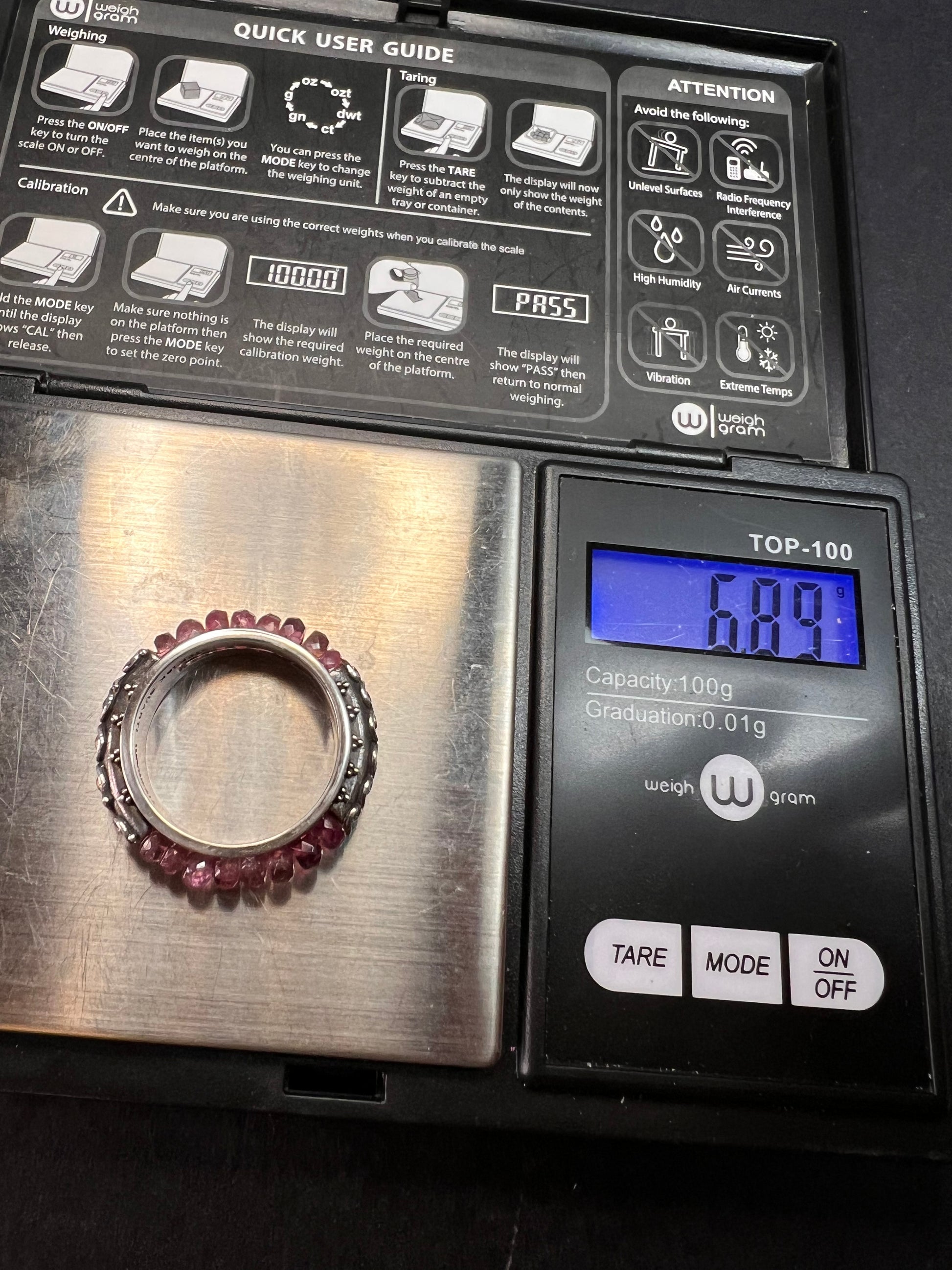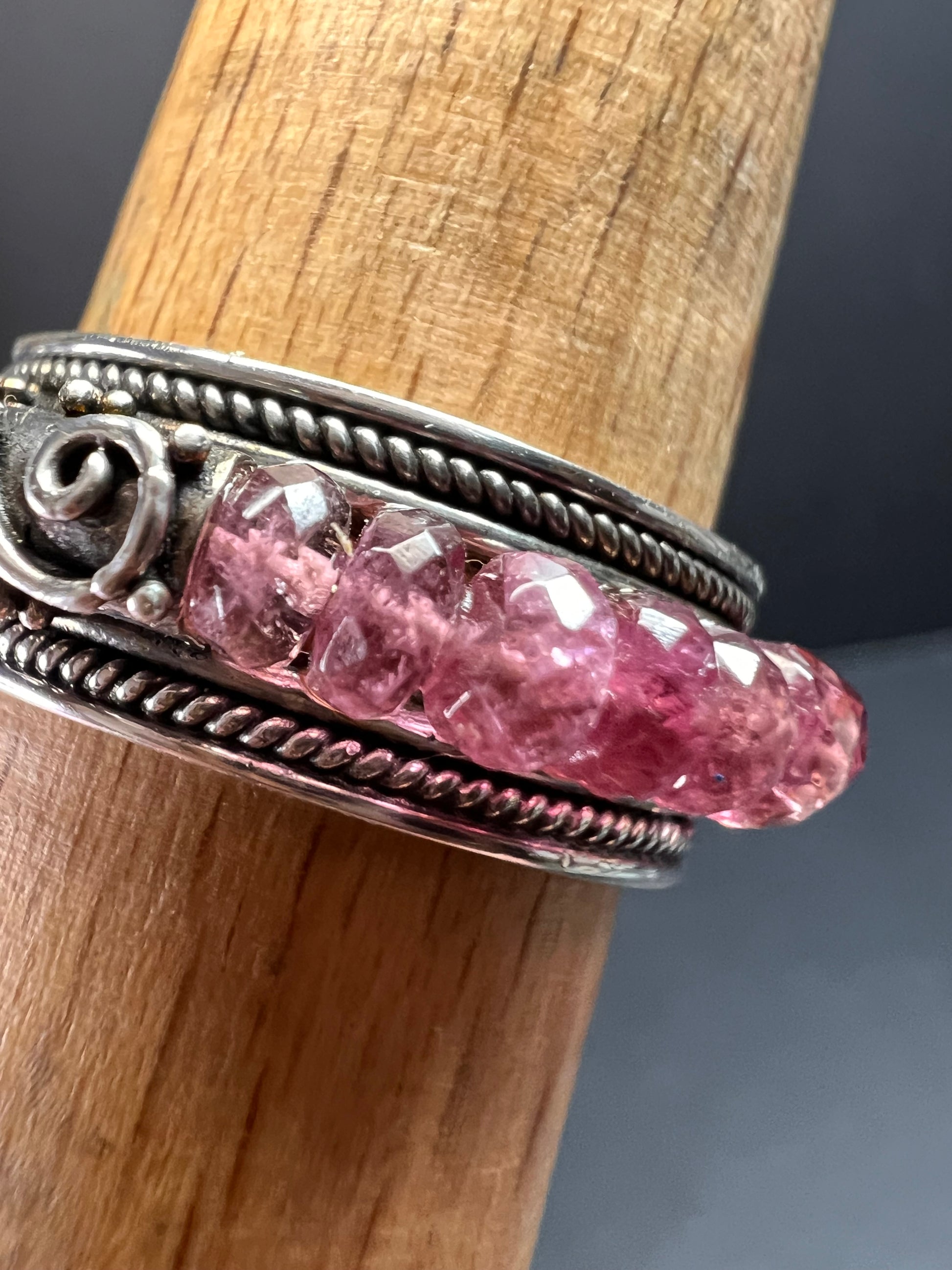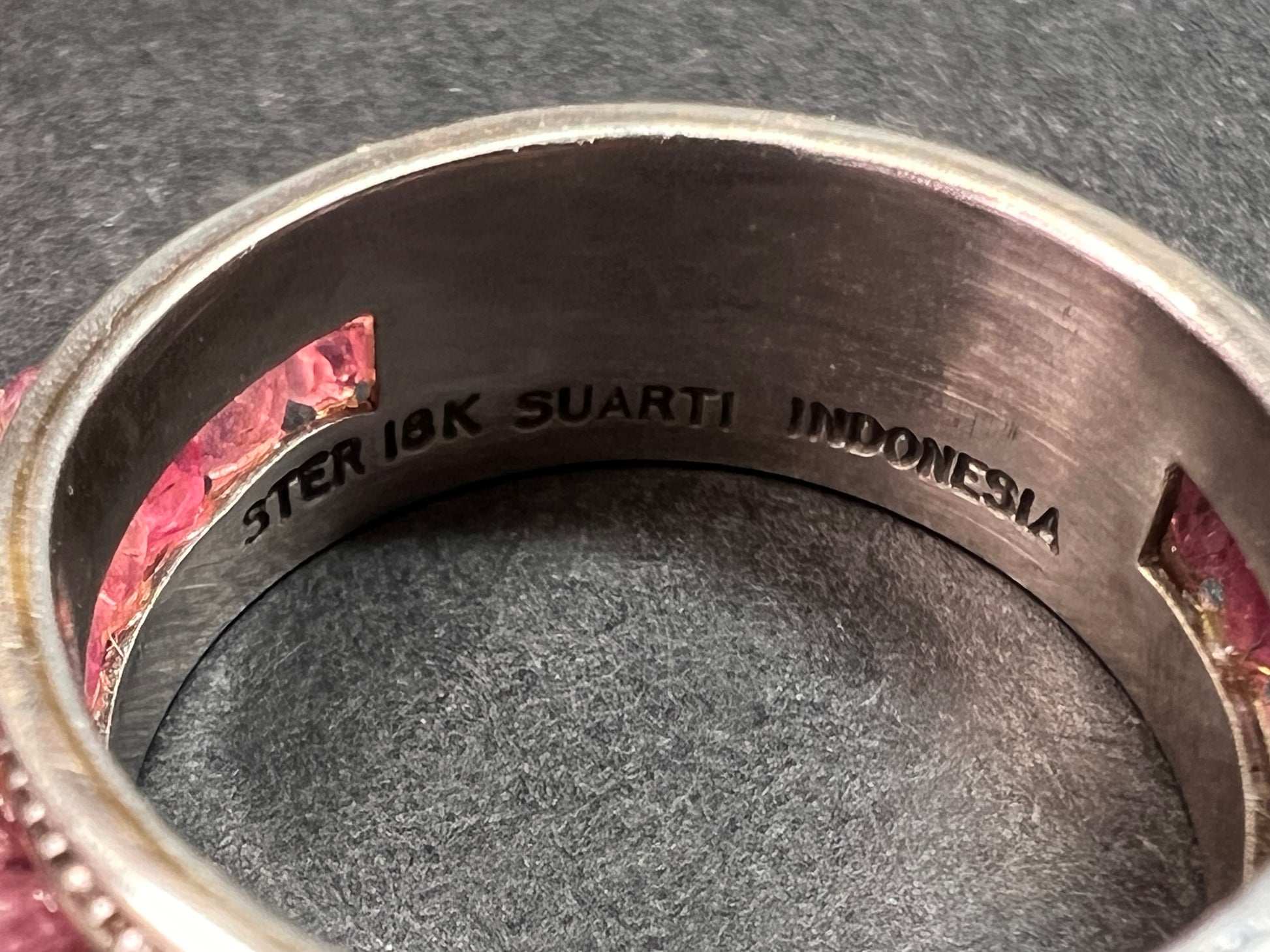 Genuine pink tourmaline faceted rondelle beads strung around an authentic 925 bali sterling silver ornate band with 18k yellow gold accent domes on the top. Signed SUARTI designer. Indonesia. Measures a sized 9. I believe this was a QVC design from 2009. Total weight is 6.89 grams.