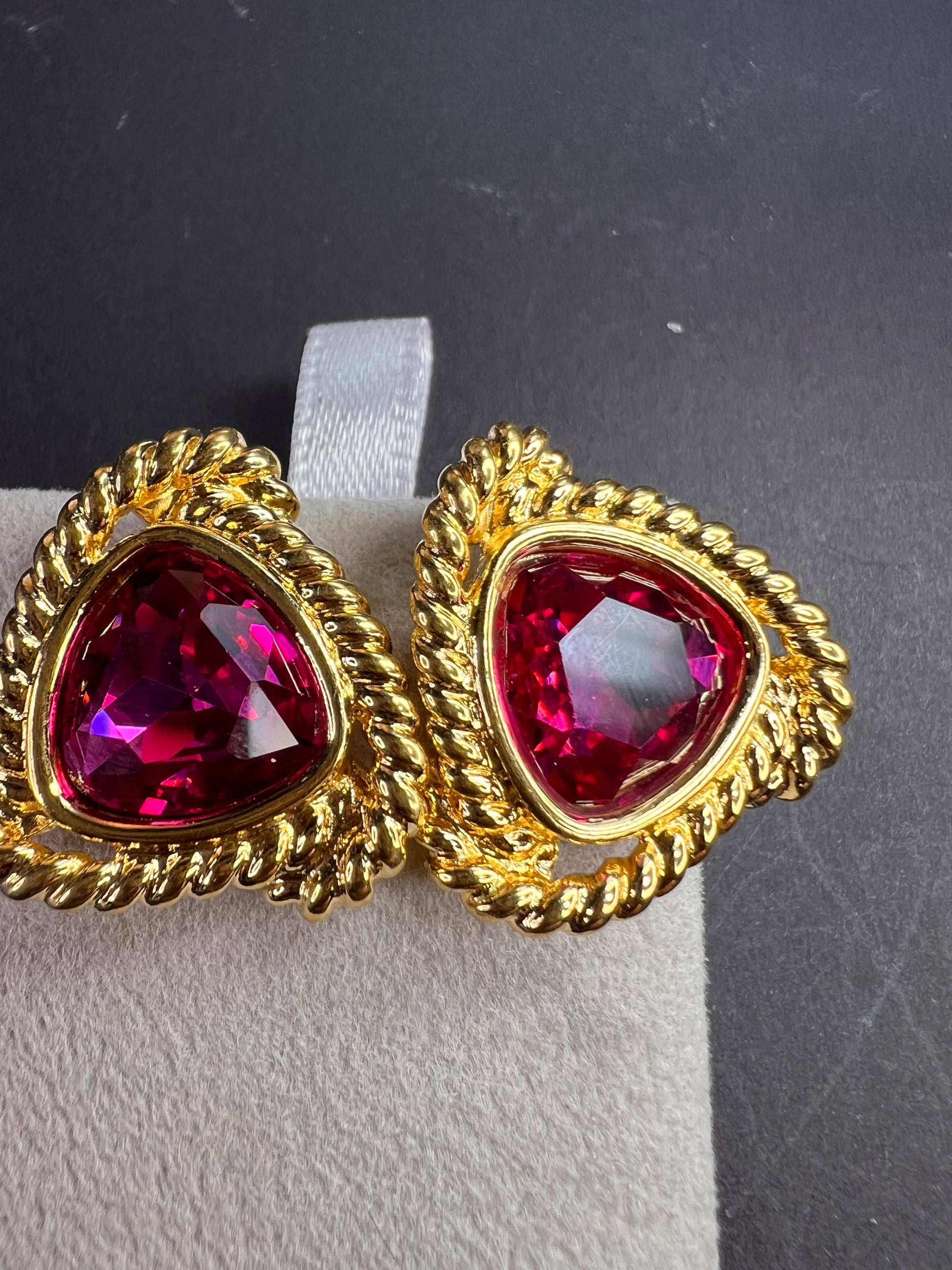 These vintage Swarovski pierced earrings are a total mood. They feature vibrant magenta pink trillion-cut crystals that really pop against the gold-tone twisted rope borders. These are high-quality costume pieces from the late 80s or 90s, featuring the iconic swan hallmark. They have a nice weight and make a gorgeous statement.