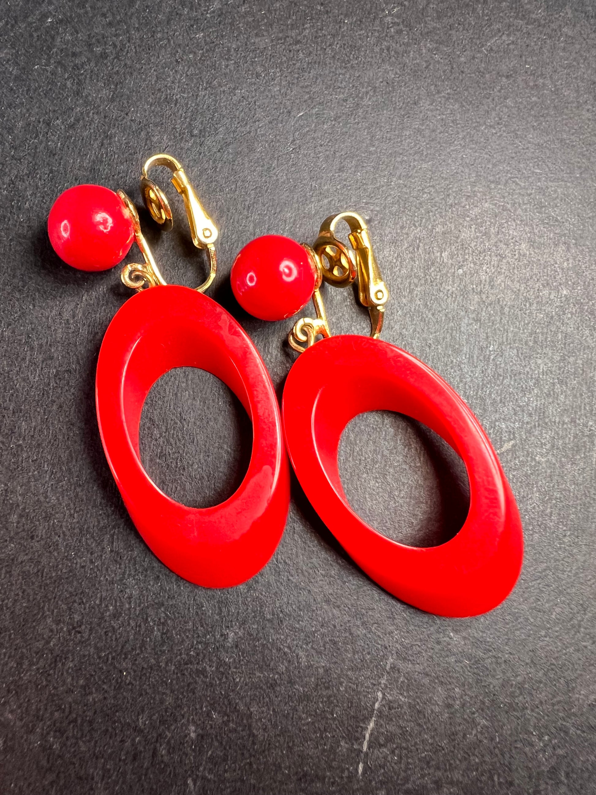 Signed Triffari as shown in photos. Rare red lucite hoops with gold toned clip ons. So fun!