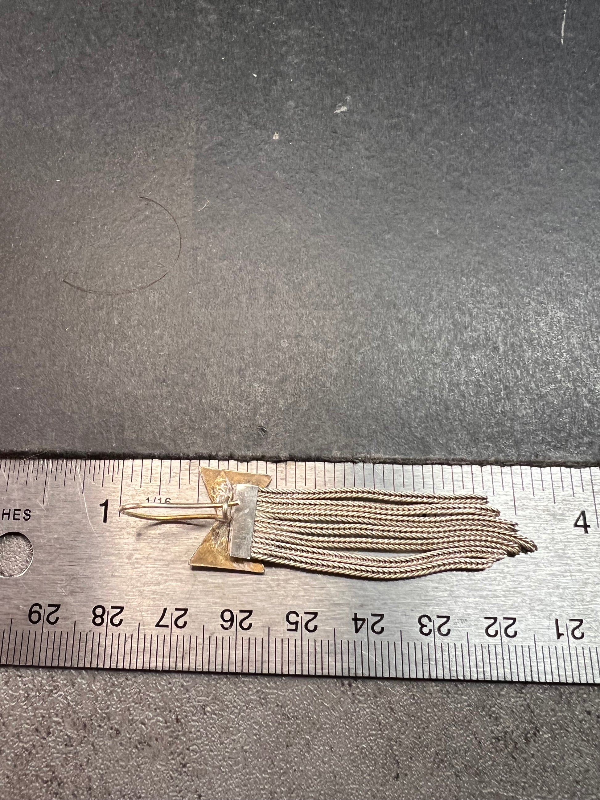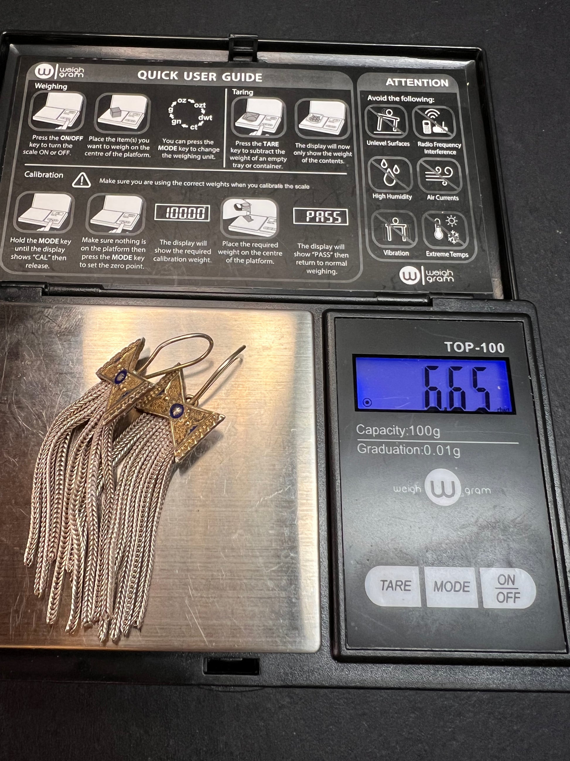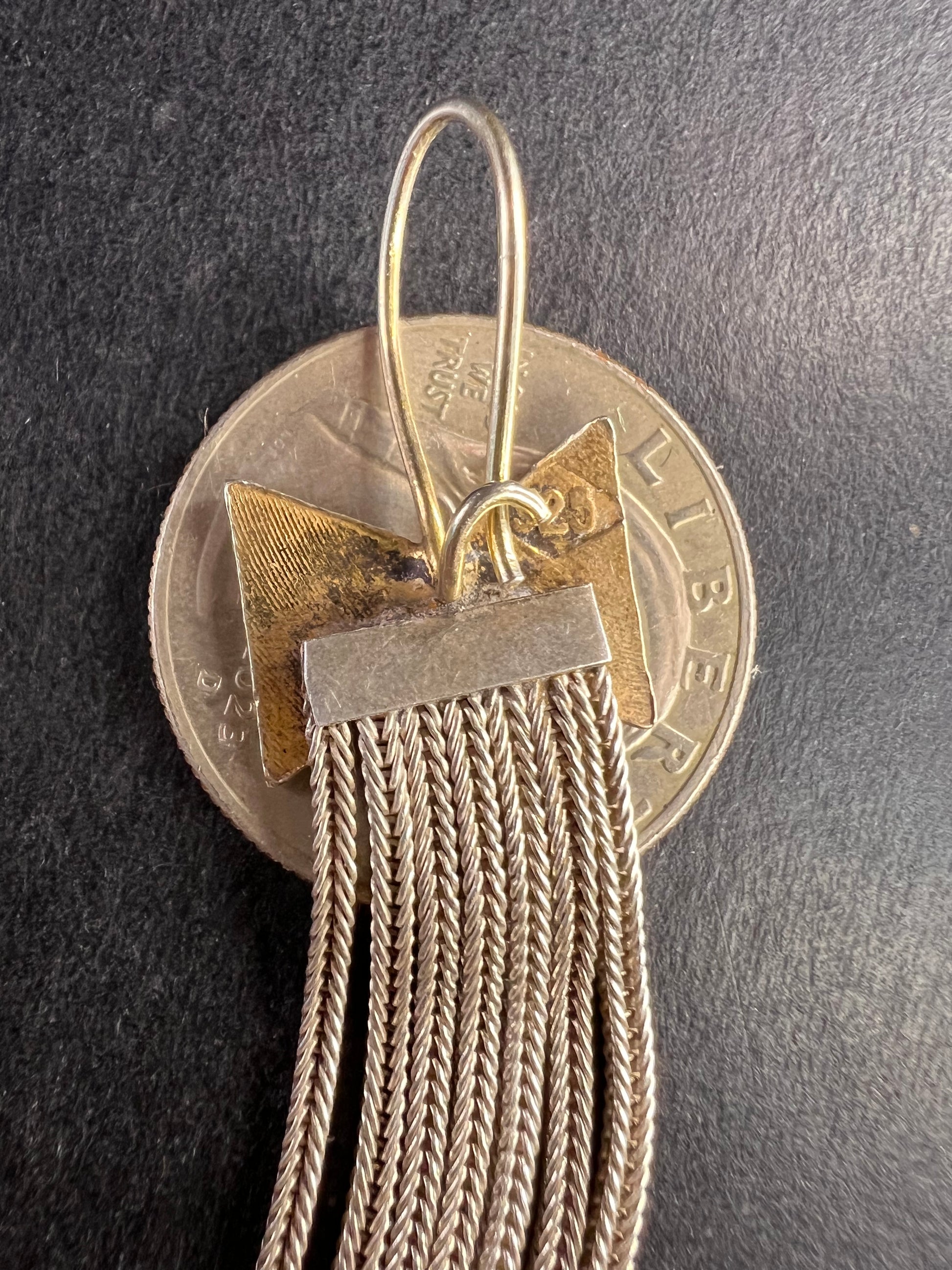 Vintage fringe earring in two toned silver and gold over 925 sterling silver with fish hook ear wires. Earrings measure a little over 2 inches in length and weigh 10.40 grams. Blue star enamel design in the center of a unique bow shape. I believe these might actually be antique 1920s Edwardian era.