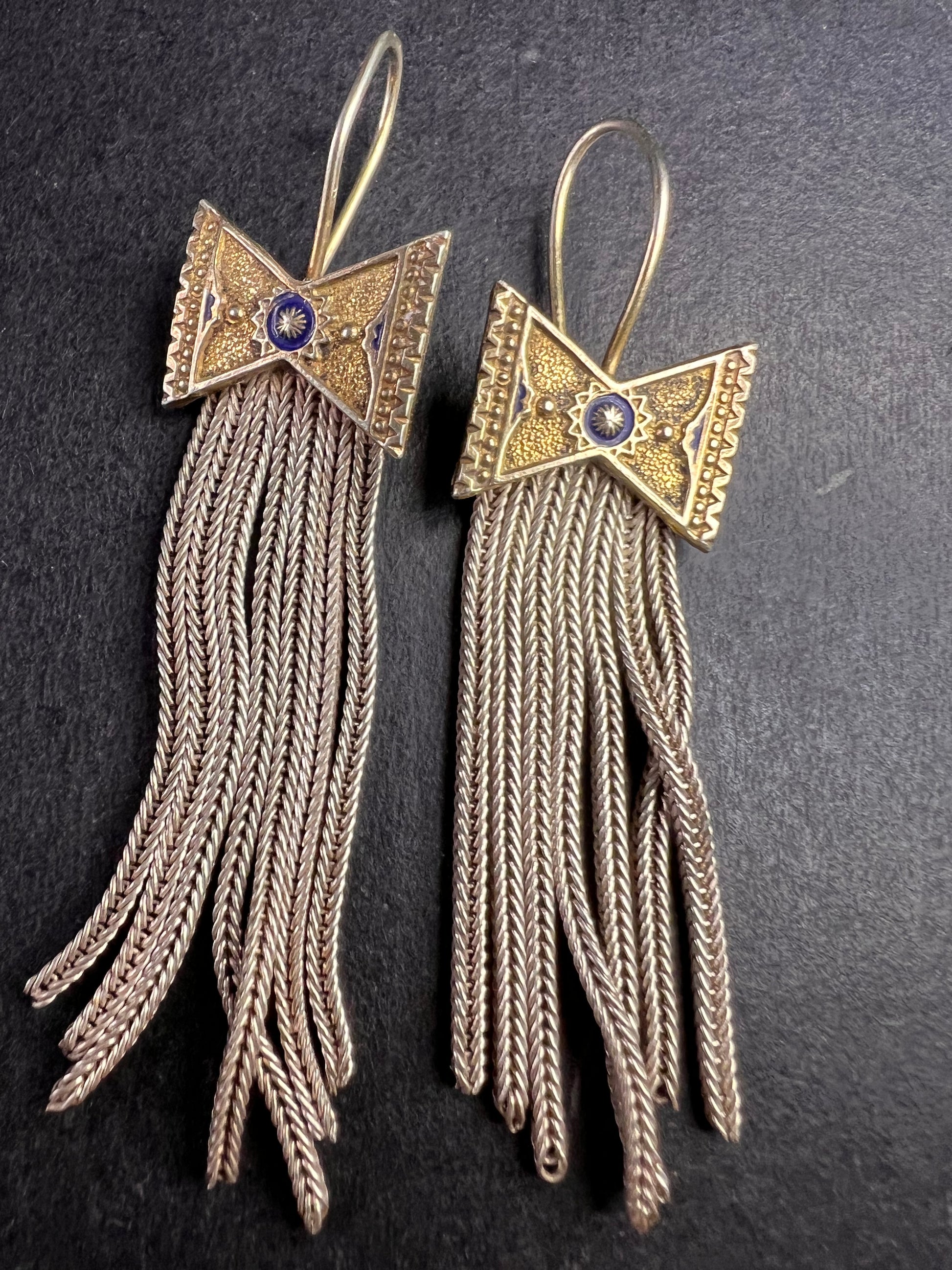 Vintage Turkish sterling silver foxtail fringe enamel bow earrings